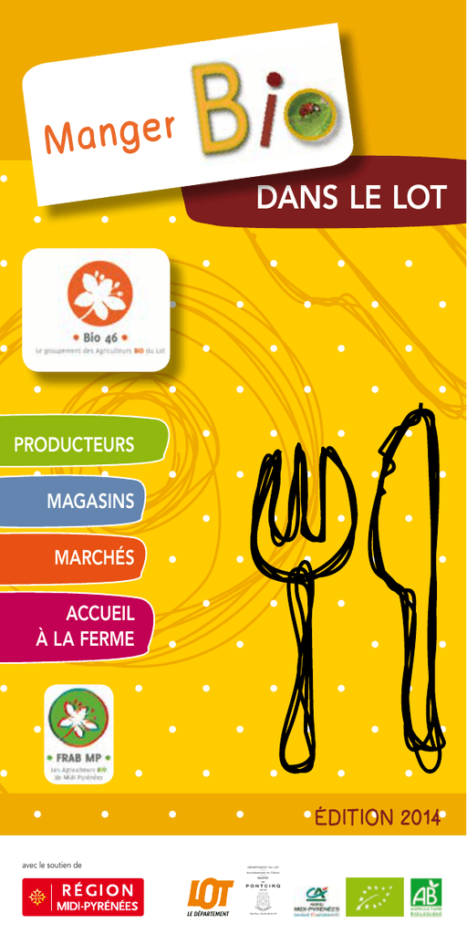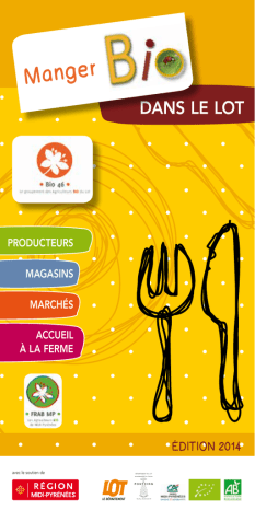 aannggeerr M M dans le lot Producteurs Magasins Marchés accueil à la ferme édition 2014 avec le soutien de priorité au local ! 356 chemin Belle Croix - 46000 Cahors Lun : 10h00/12h30 • 14h30/19h00 Mar au ven : 09h00/12h30 • 14h30/19h00 Sam : 09h00/19h00 05 65 21 83 70 www.biocoopcahors.com Éditorial C ombien de fois n’avons-nous pas entendu cette sentence implacable ? « Nous aimerions bien consommer Bio ! Mais le problème, c’est le prix ! » Ah bon, vraiment ? Le rapport publié en septembre dernier par le Commissariat général au Développement Durable « Coûts des principales pollutions agricoles de l’eau » révèle ce que l’on peut appeler les coûts cachés de l’agriculture, nous pouvons y lire entres autres que : 1. Dans les localités les plus polluées par les nitrates et les pesticides « les dépenses transférées par l’agriculture aux ménages (…), à raison de 215€ par personne et par an : pour une famille de cinq personnes la dépense additionnelle annuelle entraînée par ces pollutions serait l’ordre de 1074€ (…) soit un surcoût de 140% de la facture d’eau moyenne ». 2. « les coûts de potabilisation dus à l’agriculture conventionnelle pratiquée dans les aires d’alimentation des captages d’eau potable se situent dans une fourchette de 800 à 2400€ par hectare d’agriculture conventionnelle et par an ». Comme le rappelle la Cour des comptes dans son rapport de 2010, « la politique de traitement des eaux en France s’avère plus onéreuse au mètre cube traité que la prévention (l’aide à la conversion bio, est variable selon les cultures, entre 90 et 810€/ha/an) » et de plus, n’améliore pas la qualité de la source. Alors, le prix est-il toujours le problème de l’agriculture Bio ? Non, c’est la solution ! Nathalie MASBOU Présidente de Bio 46 Manger BIO dans le Lot Ainsi le coût de la dépollution s’élève à 54 milliards d’euros par an, et, cerise sur le gâteau, la dette écologique laissée à nos enfants, « le coût complet de dépollution du stock des eaux souterraines serait supérieur à 522 milliards d’euros »… 1 SAINTONGE BIO DISTRIBUTION M. RABALLAND Jean-Pierre [email protected] Tél. 05 46 59 78 21 Fax 05 46 59 79 00 Port. 06 07 30 09 73 27, avenue du Point du Jour 17400 SAINT JEAN D’ANGELY • Amendements marins • Amendements organiques • Engrais organiques • Insecticides naturels • Produits de traitement • Semences bio ou non traitées • Produits d’élevage • Aliments bétail • Désherbeurs thermiques • Matériels Hatzenbichler Achats/Ventes de légumes bio Collecte de céréales bio Plants pommes de terre bio Semences ail, échalotes et oignons bio Graines potagères bio Haricots verts, blancs, beurres ou à rames bio www.saintonge-bio-distribution.com Sommaire La BIO dans le Lot et Bio 46 p. 5 La BIO en Midi-Pyrénées et la FRAB p. 7 Produire et consommer bio p. 8 Reconnaître les produits BiO p. 11 Index p. 13 Où sont-ils ? p. 16 Pays Bourian p. 19 Pays de Cahors et du Sud du Lot p. 21 Pays de Figeac, du Ségalat Lot-Célé p. 27 PNR Causse du Quercy p. 29 Vallée de la Dordogne Lotoise p. 33 Agissez pour le développement de la bio ! p. 36 Les Marchés et Foires 3e de couverture AlterreNat Presse Ld Alby - 82120 Castéra-Bouzet Tél. : 05.63.94.15.50 - Fax : 05.63.94.16.69 Mail : [email protected] - www.alterrenat-presse.com Mise en page : Devisocom Photos : BIO 46 Imprimeur : CEE édition : Juin 2014 Manger BIO dans le Lot Rédaction : BIO 46 - Maison des associations - Place Bessières 46000 Cahors - Tél. 07 81 35 12 96 Conception, réalisation, régie publicitaire : 3 Basebio Agri, spécialisée en Protection Biologique Intégrée et Agriculture Biologique, propose une gamme de services et de produits respectueux de l’environnement répondant aux attentes des professionnels. NOS DOMAINES DE SPECIALISATION : • Protection biologique intégrée (PBI) : auxiliaires, phéromones, piégeage, accessoires. • Pollinisation : ruches (serres et extérieurs). • Fournitures agriculture biologique : semences certifiées, stimulateurs, engrais organiques, terreaux, purins, produits phytosanitaires pour AB. • Intervention et formation : suivi, diagnostic, conseil, formation en PBI. Pour passer commande, pour toutes questions techniques, pour vos projets de formation, nos techniciens conseils seront heureux de vous répondre. Contact : Clémence CARRIQUIRY - Tel : 06 86 66 80 30 Zone Albasud - 270 impasse Jacques Daguerre - 82000 MONTAUBAN Tel : 05 63 20 20 55 - Mail : [email protected] www.basebioagri.fr La Bio dans le Lot et le Bio 46 L’Agriculture biologique dans le Lot, c’est... • 245 agriculteurs(trices) bio en 2013 (et déjà près de 250 en juin 2014) et 3,7 % de la surface agricole utile (évolution de + 29 % par rapport à 2011). • Le Lot est un département présentant une bonne diversité de productions : fruits et légumes, viande bovine et ovine, volaille et œufs, fromages, céréales, miel et produits transformés. Le contexte géographique influence la production vers la polyculture sur de petites surfaces. 40 % des producteurs(trices) du Lot sont en vente directe, et vous pouvez les retrouver dans ce guide pour vous orienter dans votre recherche de produits bio et locaux. BIO 46 Créée en 1997, Bio 46 (anciennement LotABné) regroupe aujourd’hui 70 adhérents. Elle est composée des acteurs de la filière bio (producteurs, organismes techniques et économiques, transformateurs, consommateurs…), elle est gérée par le conseil d’administration et animée par une salariée motivée et dynamique. Ses objectifs à la création, qui étaient de faire connaître l’agriculture biologique, de représenter et défendre les producteurs bio, et de se regrouper pour avoir du poids face aux grandes filières, sont toujours d’actualité. A ces derniers se sont ajoutées aujourd’hui l’augmentation des surfaces cultivées en agricu
