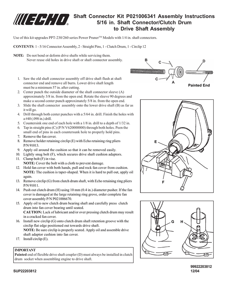 Shaft Connector Kit P021006341 Assembly Instructions 5/16 in. Shaft Connector/Clutch Drum to Drive Shaft Assembly Use of this kit upgrades PPT-230/260 series Power PrunerTM Models with 1/4 in. shaft connectors. CONTENTS: 1 - 5/16 Connector Assembly, 2 - Straight Pins, 1 - Clutch Drum, 1 - Circlip 12 NOTE: Do not bend or deform drive shafts while servicing them. Never reuse old holes in drive shaft or shaft connector assembly. 1. Saw the old shaft connector assembly off drive shaft flush at shaft connector end and remove all burrs. Lower drive shaft length must be a minimum 57 in. after cutting. 2. Center punch the outside diameter of the shaft connector sleeve (A) approximately 3/8 in. from the open end. Rotate the sleeve 90 degrees and make a second center punch approximately 5/8 in. from the open end. 3. Slide the shaft connector assembly onto the lower drive shaft (B) as far as it will go. 4. Drill through both center punches with a 5/64 in. drill. Finish the holes with a #40 (.098 in.) drill. 5. Countersink one end of each hole with a 1/8 in. drill to a depth of 1/32 in. 6. Tap in straight pins (C) (P/N V620000000) through both holes. Peen the small end of pins in each countersunk hole to properly hold pins. 7. Remove the fan cover. 8. Remove holder retaining circlip (E) with Echo retaining ring pliers P/N 91013. 9. Apply oil around the cushion so that it can be removed easily. 10. Lightly snug bolt (F), which secures drive shaft cushion adaptors. 11. Clamp bolt (F) in vise. NOTE: Cover the bolt with a cloth to prevent damage. 12. Hold fan cover with both hands, pull and rock fan cover from cushion. NOTE: The cushion is taper-shaped. When it is hard to pull out, apply oil again. 13. Remove circlip (G) from clutch drum shaft, with Echo retaining ring pliers P/N 91011. 14. Push out clutch drum (H) using 10 mm (0.4 in.) diameter pusher. If the fan cover is damaged at the large retaining ring grove, order complete fan cover assembly P/N P021006670. 15. Apply oil to new clutch drum bearing shaft and carefully press clutch drum into fan cover bearing until seated. CAUTION: Lack of lubricant and/or over pressing clutch drum may result in a cracked fan cover. 16. Install new circlip (G) onto clutch drum shaft retention groove with the circlip flat edge positioned out towards drive shaft. NOTE: Be sure circlip is properly seated. Apply oil and assemble drive shaft adaptor cushion into fan cover. 17. Install circlip (E). B D C C A Painted End E F G H IMPORTANT Painted end of flexible drive shaft coupler (D) must always be installed in clutch drum socket when assembling engine to drive shaft. SUP22203812 99922203812 12/04 Instrucciones de montaje del juego de conector de eje P021006341 Montaje del conector de eje/tambor de embrague de 5/16” al eje de impulsión El uso de este juego permite actualizar los modelos Power Pruner™ de la serie PPT-230/260 con conectores de eje de 1/4”. CONTENIDO: 1 conjunto de conector de 5/16”, 2 pasadores derecho, 1 tambor de embrague, 1 resorte circular 12 NOTA: No doble ni deforme los ejes de impulsión mientras efectúa el servicio de los mismos. No vuelva a utilizar nunca agujeros viejos en el eje de impulsión o en el conjunto de conector de eje. 1. 2. 3. 4. 5. 6. 7. 8. 9. 10. 11. 12. 13. 14. 15. 16. 17. Sierre el conjunto de conector de eje antiguo del eje de impulsión por el extremo del conector del eje (A) y elimine todas las rebabas. La longitud del eje de impulsión inferior debe ser de 57” como mínimo después de cortarlo. Marque con un punzón el diámetro exterior del manguito del conector del eje aproximadamente a 3/8” del extremo abierto. Gire el manguito 90 grados y haga una segunda marca con el punzón aproximadamente a 5/8” del extremo abierto. Deslice el conjunto del conector del eje por el eje de impulsión inferior (B) tanto como pueda. Perfore ambas marcas con un taladro de 5/64”. Acabe los agujeros con un taladro No. 40 (,098”). Perfore un avellanador en un extremo de cada agujero con un taladro de el 1/8in. a una profundidad de el 1/32". Rosque ambos agujeros con pasadores derecho (C) (N/P V620000000). Flair el extremo pequeño de pasadores en cada agujero avellanado para sujetar correctamente los pasadores. Quite la tapa del ventilador. Quite el resorte circular (E) de sujeción del portador con los alicates de anillos de retención de Echo N/P 91013. Aplique aceite alrededor del amortiguador de modo que pueda quitarse fácilmente. Apriete ligeramente el perno (F), que sujeta los adaptadores de amortiguación del eje de impulsión. Sujete el perno (F) en el tornillo de banco. NOTA: Cubra el perno con un trapo para impedir daños. Sujete la tapa del ventilador con las dos manos, tire de la misma y muévala de uno a otro lado hasta sacarla del amortiguador. NOTA: El amortiguador tiene forma ahusada. Cuando sea difícil sacarlo, vuelva a aplicar aceite. Quite el resorte circular (G) del eje del tambor del embrague, con los alicates de anillos de retención de Echo N/P 91011. Empuje y saque el tambor del embrague (H) usando un impulsor de 10 mm (0,4”) de diámetro. Si la cubierta de ventilador se daña en el área del surco grande del anillo de retención, pida el montaje del completo cubierta del ventilador N/P P021006670. Aplique aceite al nuevo eje del cojinete del tambor del embrague y encaje el tambor del embrague en el cojinete de la tapa del ventilador haciendo fuerza hasta que quede asentado. PRECAUCIÓN: La falta de lubricante y el uso de una fuerza excesiva para encajar el tambor del embrague pueden rajar la tapa del ventilador. Instale el nuevo resorte circular (G) en la ranura de retención del eje del tambor del embrague con el borde plano del resorte circular colocado fuera hacia el eje de impulsión. NOTA: Asegúrese de que el resorte circular esté bien asentado. Aplique aceite y monte el amortiguador del adaptador del eje de impulsión en la tapa del ventilador. Instale el resorte circular (E). B D C C A e