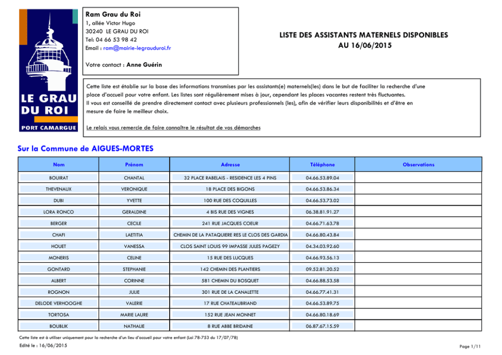 Ram Grau du Roi 1, allée Victor Hugo 30240 LE GRAU DU ROI Tel: 04 66 53 98 42 Email : [email protected] LISTE DES ASSISTANTS MATERNELS DISPONIBLES AU 16/06/2015 Votre contact : Anne Guérin Cette liste est établie sur la base des informations transmises par les assistants(e) maternels(les) dans le but de faciliter la recherche d’une place d’accueil pour votre enfant. Les listes sont régulièrement mises à jour, cependant les places vacantes restent très fluctuantes. Il vous est conseillé de prendre directement contact avec plusieurs professionnels (les), afin de vérifier leurs disponibilités et d’être en mesure de faire le meilleur choix. Le relais vous remercie de faire connaître le résultat de vos démarches Sur la Commune de AIGUES-MORTES Nom Prénom Adresse Téléphone BOUIRAT CHANTAL 32 PLACE RABELAIS - RESIDENCE LES 4 PINS 04.66.53.89.04 THEVENAUX VERONIQUE 18 PLACE DES BIGONS 04.66.53.86.34 DUBI YVETTE 100 RUE DES COQUILLES 04.66.53.73.02 LORA RONCO GERALDINE 4 BIS RUE DES VIGNES 06.38.81.91.27 BERGER CECILE 241 RUE JACQUES COEUR 04.66.71.63.78 CHAFI LAETITIA 27 CHEMIN DE LA PATAQUIERE RES LE CLOS DES GARDIANS 04.66.80.43.84 HOUET VANESSA CLOS SAINT LOUIS 99 IMPASSE JULES PAGEZY 04.34.03.92.60 MONERIS CELINE 15 RUE DES LUCQUES 04.66.93.56.13 GONTARD STEPHANIE 142 CHEMIN DES PLANTIERS 09.52.81.20.52 ALBERT CORINNE 581 CHEMIN DU BOSQUET 04.66.88.53.58 ROGNON JULIE 301 RUE DE LA CANALETTE 04.66.77.41.31 DELODE VERHOOGHE VALERIE 17 RUE CHATEAUBRIAND 04.66.53.89.75 TORTOSA MARIE LAURE 152 RUE JEAN MONNET 04.66.80.18.69 BOUBLIK NATHALIE 8 RUE ABBE BRIDAINE 06.87.67.15.59 Observations Cette liste est à utiliser uniquement pour la recherche d’un lieu d’accueil pour votre enfant (Loi 78-753 du 17/07/78) Edité le : 16/06/2015 Page 1/11 Sur la Commune de AIGUES-MORTES Nom Prénom Adresse Téléphone MAIRET CELINE APT 2 20 RUE DU VISTRE 04.66.77.72.17 THIRION ELODIE 26 RUE FREDERIC BAZILLE 04.66.51.62.85 FERRAGUT MARIE NOELLE 5 CHEMIN DE IGONZAC 04.11.83.16.91 VENZAL MICHELLE 267 RUE DES COQUILLES LOT DU MAS JENCONTE 04.66.77.33.12 DECERLE NATHALIE 426 CHEMIN D'ESPARON 06.75.65.59.91 ROBERT KARINE 5 RUE AMIRAL COURBET 09.54.40.33.43 BIGONVILLE SYLVIANE 1 IMPASSE LENTHERIC 04.11.83.28.28 BOUVRY CHRISTELLE 24 RUE ANDRE CHAMSON 06.24.59.01.71 MARQUES NATHALIE 188 RUE JEAN REBOUL 04.66.71.43.86 BONNEAU MARYVONNE 4 RUE MARCEL PAUL RESIDENCE LA GABELLE 04.66.53.55.93 DIAZ NATHALIE 37 IMPASSE DE BRUXELLES LOT LES LAURENCIALES 04.66.71.49.84 BECHARD ARLETTE 158 CHEMIN DE CARTOUCHE 04.66.53.77.14 DE KEYSER RENEE 182 CHEMIN D'ESPARON LOT 2A 04.34.04.88.94 GARCIA GUILLAUMETTE 11 RUE DU 19 MARS 04.66.53.69.94 FAGET NADINE 1 BOULEVARD INTERIEUR OUEST 04.30.67.49.02 CAUSERA NATHALIE 84 IMPASSE DE STRASBOURG 04.66.53.04.55 TRAMIER CAROLINE 16 RUE JEANNE DESMESSIEUX 04.34.28.70.13 CROS CELIA 61 RUE DU CABERNET 09.84.06.68.46 PIERRON STEPHANIE 68 RUE ANTOINE BIGOT 04.66.88.51.47 MICHEL SANDRINE CHEMIN DE TROUCHAUD VILLA MAIA 04.66.71.54.05 SAUVAIRE MAITE 9 RUE DU LANGUEDOC 06.59.29.77.93 CROZE MARTINEZ MYRIAM 15 A RUE DE LA CAVIDOULE 09.66.83.68.46 HONORINE REY ANAIS 2 QUAI DES BATELIERS 06.30.63.08.00 BENAIGES MARTINE 151 RUE DES TAMARIS 04.66.71.96.89 ROUSSEAUX SABRINA 277 RUE DES COQUILLES 04.66.53.59.36 FRILEUX FLORA 97 RUE DU CABERNET 06.71.09.36.05 Observations Cette liste est à utiliser uniquement pour la recherche d’un lieu d’accueil pour votre enfant (Loi 78-753 du 17/07/78) Edité le : 16/06/2015 Page 2/11 Sur la Commune de AIGUES-MORTES Nom Prénom Adresse Téléphone TOURNAIRE FREDERICA 13 RUE ROGER SALENGRO 04.66.53.76.96 REBOUL ODILE CHEMIN L'ESPARON LOT LA FLEUR DE SEL N°5 04.66.88.49.80 Observations Sur la Commune de AIMARGUES Nom Prénom Adresse Téléphone BRIOUDES CAROLE 5 RUE DU BASSIN 04.11.83.27.17 SOULLIER EVE 6 IMPASSE DES PRUNIERS 06.79.41.92.98 GIRARDET FLORENCE 19 RUE CARNOT 07.86.17.70.41 SMACQUE MAEVA 11 RUE DU POMMIER ZAC LA GARRIGUE 09.52.03.69.08 ANVESIO NATHALIE 1 BOULEVARD JUES FERRY 06.03.99.07.74 RUBIO ODILE IMPASSE DU GARDIAN LOT LES VIGNES BLANCHES 06.31.13.59.10 DECAGNY CHRISTINE 9 HAMEAU DES SOLEILLADES 06.62.30.06.63 DANNHOFFER MANUELLA ROUTE DE LA PETITE CAMARGUE 04.66.80.27.54 DALLEAU PATRICIA 21 RUE DU CINSAULT 09.67.12.04.08 BEAUNE PASCALE 10 IMPASSE DE L'ABRICOTIER 04.66.88.35.21 TOMAS AMANDINE 50 RUE CINSAULT 06.18.61.83.11 JHAMALODINE BARBARA 17 RUE DU FLAMANT ROSE 06.59.01.81.40 BRAZILLIER CELINE 23 PLACE DE LA PICHOULINE LOT LES OLIVIADES 04.66.88.57.79 SABATIER AUDREY 3 BOULEVARD DU TEMPLE 06.10.85.20.12 FAURE VALERIE RUE DE LA TREILLE LOTISSEMENT LE VERGER 04.66.35.09.72 PIOVAN MARIA ISABEL 4 RUE CHANTE SOLEIL 04.66.88.01.67 GRIMA CAROLINE 19 ESPLANADE DES JUJUBIERS 09.51.79.35.45 RUMIAC JESSICA 12 ESPLANADE DES JUJUBIERS 09.53.15.34.62 CAMPO ALEXIA CHEMIN GRAND CABANE 04.66.80.39.07 RIGARD STEPHANIE 16 ESPLANADE DES JUJUBIERS 04.66.93.72.49 RALLIER ELODIE 7 IMPASSE DU GARDIAN LOT LES VIGNES BLANCHES 06.78.59.39.83 Observations Cette liste est à utiliser uniquement pour la recherche d’un lieu d’accueil pour votre enfant (Loi 78-753 du 17/07/78) Edité le : 16/06/2015 Page 3/11 Sur la Commune de AIMARGUES Nom Prénom Adresse Téléphone MOUNIM BOUCHRA ZAC LA GARRIGUE 12 PLACE DE L ARBOURSIER 06.14.49.31.32 REQUENA SANDRINE 5 ESPLANADE DES JUJUBIERS ZAC LA GARRIGUE 06.24.59.77.35 DE BAERDELACKER OPHELIE 9 RUE DU CERISIER LES CIGALES 06.27.44.52.96 RICO MARIE-FRANCE 16 RUE REMY VALEZ 04.66.88.60.60 DANNA PAOLA 46 PLACE DE LA LUCQUE 04.66.53.30.76 PUECH ELODIE 9 RUE JEANNE D'ARC 06.75.60.96.07 MELLADO DAISY 8 IMPASSE DES ARENES 04.66.88.51.69 DAUTEL MARION 3 ESPLANADE DES JUJUBIERS 06.16.78.24.23 LALLEMAND MELANIE 45 ESPLANADE DES JUJUBIERS ZAC LA GARRIGUE 04.66.53.61.49 AUBRY OPHELIE 9 RUE DU CERISIER LES CIGALES 04.66.93.58.66 BUENO NATHALIE RESIDENCE LES VERGERS LOT 9 06.26.47.95.34 VIGOUROUX ANNIE 47 RUE CINSAULT 04.66.53.59.04 CHAMPAGNE KAREN 4 IMPASSE DE SOLEILLADES 04.34.04.99.27 ALTOBELLI CARINE 12 RUE GASTON BECHARD 04.
