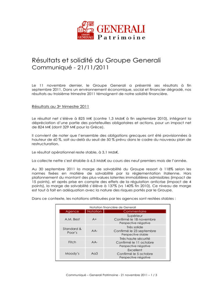 Résultats et solidité du Groupe Generali Communiqué - 21/11/2011 Le 11 novembre dernier, le Groupe Generali a présenté ses résultats à fin septembre 2011. Dans un environnement économique, social et financier dégradé, nos résultats au troisième trimestre 2011 témoignent de notre solidité financière. Résultats au 3e trimestre 2011 Le résultat net s’élève à 825 M€ (contre 1,3 Mds€ à fin septembre 2010), intégrant la dépréciation d’une partie des portefeuilles obligataires et actions, pour un impact net de 824 M€ (dont 329 M€ pour la Grèce). Il convient de noter que l’ensemble des obligations grecques ont été provisionnées à hauteur de 60 %, soit au-delà du seuil de 50 % prévu dans le cadre du nouveau plan de restructuration. Le résultat opérationnel reste stable, à 3,1 Mds€. La collecte nette s’est établie à 6,5 Mds€ au cours des neuf premiers mois de l’année. Au 30 septembre 2011 la marge de solvabilité du Groupe ressort à 118% selon les normes fixées en matière de solvabilité par la réglementation italienne. Hors plafonnement du montant des plus-values latentes immobilières admissibles (impact de 15 points), et après prise en compte des effets de la régulation anticrise (impact de 4 points), la marge de solvabilité s’élève à 137% (vs 140% fin 2010). Ce niveau de marge est tout à fait en adéquation avec la nature des risques portés par le Groupe. Dans ce contexte, les notations attribuées par les agences sont restées stables : Notation financière de Generali Agence Notation A.M. Best A+ Commentaire Supérieur Confirmé le 18 novembre Perspective négative Standard & Poor’s Fitch AA- Très solide Confirmé le 23 septembre AA- Très haute sécurité Confirmé le 11 octobre Perspective stable Perspective négative Moody’s Aa3 Excellent Confirmé le 5 octobre Perspective négative Communiqué – Generali Patrimoine - 21 novembre 2011 – 1 / 3 Confiance des actionnaires L’actionnariat est stable, et maintient sa confiance dans la solidité de l’entreprise, comme en témoigne l’évolution comparée des cours depuis le début de l’année. Du 3/1/2011 au 8/11/2011 le titre Generali (- 12,08%) a, malgré la crise, fait mieux que les indices de référence italien (FTSE MIB : - 23,35%), français (CAC 40 : - 19,65%) et européen (DJ Euro Stoxx Insurance : - 16,13). La lecture de l’évolution des cours des titres / indices sur les marchés montre que les investisseurs gardent leur confiance en l’entreprise Generali, dont le titre n’a pas subi les mêmes variations que celui des autres acteurs financiers, notamment des valeurs bancaires. Notre activité d’assurance ne nous expose pas à un risque de liquidités comme il se pose pour les banques, notamment en termes de couverture du passif (les banques financent des crédits long terme par des investissements court terme). Sur la situation de l’Italie Rappelons enfin que la situation économique de l’Italie ne peut en aucune manière être assimilée à celle de la Grèce ; l’économie italienne est beaucoup plus solide que celle des autres pays confrontés à des problèmes d’endettement, et dispose de fondamentaux nettement meilleurs que ne le suggèrent les récentes tensions sur les marchés : • Un faible endettement des ménages, • Un ratio dette / PIB de 120% du PIB, très élevé et un coût du service de la dette assez lourd (4.5% du PIB, vs 2,8 % pour la zone euro) mais : • Une échéance moyenne de la dette italienne relativement longue, à un peu plus de 7 ans (7,1 ans pour la France, 5,7 ans pour l’Allemagne, 5,1 ans pour les ÉtatsUnis, environ 6 ans pour le Portugal, l’Espagne et l’Irlande), et par conséquent un impact limité à court terme de la hausse des taux sur les charges d’intérêts • Un solde primaire (solde budgétaire hors coût du service de la dette) équilibré en 2010, (vs déficit légèrement supérieur à 3 % pour la zone euro) • Un patrimoine public privatisable de plus de 400 Mds€ La défiance actuelle des marchés, et la sanction des agences de notation, résulte notamment de l’instabilité politique et du manque de confiance dans la capacité de l’ex-gouvernement de Silvio Berlusconi à réaliser les réformes nécessaires au retour de la croissance. Le changement de gouvernement est de nature à lever les incertitudes à ce sujet. Gestion des portefeuilles de Generali France (1) Le montant des encours en euros gérés au sein de Generali France s’élève à 76 Mds€. Les sociétés de gestion, Generali Investments France et Generali France Immobilier, pilotent leurs placements avec la plus grande prudence en veillant à disposer d’un portefeuille d’actifs diversifié et liquide. Au cours de l’année 2011, Generali a pris des décisions importantes dans la gestion de ses portefeuilles d’actifs. Au sein de la poche obligations d’États, l’exposition à la dette Communiqué – Generali Patrimoine - 21 novembre 2011 – 2 / 3 des pays ayant bénéficié d’un plan de soutien (Portugal, Grèce et Irlande) est à ce jour limitée à 2,51% de ces mêmes encours, alors qu’à fin 2010 elle représentait 3.86% du total des actifs. Les dettes de l’Italie et de l’Espagne représentent respectivement 5,76% et 1,66% des encours. Generali, un assureur solide Comme l’a déclaré Giovanni Perissinotto, Directeur Général et CEO du Groupe lors de la publication des résultats, « malgré un environnement financier et économique difficile, le Groupe poursuit sa progression en terme de performance opérationnelle (…). Cette performance souligne la solidité de notre modèle économique, basé sur une diversification aux niveaux des produits, des zones géographiques et des canaux de distribution ». Notre métier est construit pour gérer sur le long terme les différents risques que nous assurons au travers de la protection des biens et des personnes et de l’épargne. N
