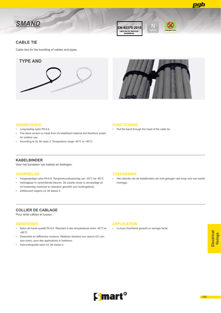SMAND Cl Br Halogen Free CABLE TIE &DEOHWLHVIRUWKHEXQGOLQJRIFDEOHVDQGSLSHV TYPE AND ADVANTAGES FUNCTIONING /RQJODVWLQJQ\ORQ3$ 3XOOWKHEDQGWKURXJKWKHKHDGRIWKHFDEOHWLH 7KHEODFNYHUVLRQLVPDGHIURP89VWDELOLVHGPDWHULDODQGWKHUHIRUHVXLWHG IRURXWGRRUXVH $FFRUGLQJWR8/FODVV7HPSHUDWXUHUDQJH&WR& KABELBINDER 9RRUKHWEXQGHOHQYDQNDEHOVHQOHLGLQJHQ VOORDELEN TOEPASSING +RRJZDDUGLJHQ\ORQ3$7HPSHUDWXXUVEHVWHQGLJYDQ&WRW& +HWXLWHLQGHYDQGHNDEHOELQGHUV]LMQOLFKWJHERJHQZDW]RUJWYRRUHHQVQHOOH 9HUNULMJEDDULQYHUVFKLOOHQGHNOHXUHQ'H]ZDUWHYHUVLHLVYHUYDDUGLJGXLW PRQWDJH 89EHVWHQGLJPDWHULDDOHQGDDUGRRUJHVFKLNWYRRUEXLWHQJHEUXLN =HOIGRYHQGYROJHQV8/NODVVH COLLIER DE CABLAGE AVANTAGES APPLICATION 1\ORQGHKDXWHTXDOLWp3$5pVLVWDQWjGHVWHPSpUDWXUHVHQWUH&HW /HERXWFKDQIUHLQpJDUDQWLWXQVHUUDJHIDFLOH (OHFWULFDO ¿[LQJV 3RXUUHOLHUFkEOHVHWWX\DX[ & 'LVSRQLEOHHQGLIIpUHQWHVFRXOHXUV0DWpULDXUpVLVWDQWDX[UD\RQV89YHUVLRQQRLUHSRXUGHVDSSOLFDWLRQVjO¶H[WpULHXU $XWRH[WLQJXLEOHVHORQ8/FODVVH 235 (OHFWULFDO ¿[LQJV INFO 236 E l EPD[ NJPD[ >PP@ >PP@ >PP@ >PP@ 100 22 8 200 53 8 140 33 18 200 53 18 302 76 18 200 50 22 302 76 22 370 102 22 430 110 22 300 76 54 370 102 54 540 140 54 9 710 190 79 VL]H SJEFRGH EAN13 [ 60$1'1= 5902134803937 [ 60$1'1= [ l b VL]H SJEFRGH EAN13 1000 [ 60$1'1: 5902134803920 1000 5902134803951 1000 [ 60$1'1: 5902134803944 1000 60$1'1= 5902134803999 1000 [ 60$1'1: 5902134803982 1000 [ 60$1'1= 5902134804019 1000 [ 60$1'1: 5902134804002 1000 [ 60$1'1= 5902134804033 1000 [ 60$1'1: 5902134804026 1000 [ 60$1'1= 5902134804156 1000 [ 60$1'1: 5902134804132 1000 [ 60$1'1= 5902134804170 1000 [ 60$1'1: 5902134804163 1000 [ 60$1'1= 5902134804200 1000 [ 60$1'1: 5902134804194 1000 [ 60$1'1= 5902134804224 1000 [ 60$1'1: 5902134804217 1000 [ 60$1'1= 5902134804248 600 [ 60$1'1: 5902134804231 600 [ 60$1'1= 5902134804262 600 [ 60$1'1: 5902134804255 600 [ 60$1'1= 5902134722382 600 [ 60$1'1: 5902134722375 600 [ 60$1'1= 5902134713816 100 INFO G l G0 K1 >PP@ >PP@ >PP@ >PP@ FRORXU 200 50 22 %URZQ 200 50 22 %OXH 200 50 22 *UHHQ 200 50 22 *UH\ 200 50 22 2UDQJH 200 50 22 3XUSOH 200 50 22 5HG 200 50 22 <HOORZ VL]H SJEFRGH EAN13 [ 60$1'1% 5902134804064 1000 [ 60$1'1%/ 5902134804071 1000 [ 60$1'1* 5902134804088 1000 [ 60$1'1*5 5902134804095 1000 [ 60$1'12 5902134804101 1000 [ 60$1'13$ 5902134804118 1000 [ 60$1'15 5902134804125 1000 [ 60$1'1< 5902134804149 1000 VL]H SJEFRGH EAN13 [ 60$1'3 5902134803357 100 [ 60$1'3 5902134803364 100 [ 60$1'3 5902134803371 100 [ 60$1'3 5902134803388 100 VL]H SJEFRGH EAN13 [ 60$1'$ 5902134803395 100 [ 60$1'$ 5902134803401 100 [ 60$1'$ 5902134803418 100 [ 60$1'$ 5902134803425 100 INFO E l EPD[ NJPD[ >PP@ >PP@ >PP@ >PP@ 9 180 45 55 9 260 62 55 9 360 93 55 9 510 140 55 E l NJPD[ >PP@ >PP@ >PP@ 360 45 360 45 360 114 360 114 (OHFWULFDO ¿[LQJV INFO 237 9HOFURVWULS³EDFNWREDFN´ .OLWWHQEDQGYHOFUR 9HOFURGRXEOHIDFH 6HOIDGKHVLYHEDVHIRUFDEOHWLHV =HOINOHYHQGSODN]DGHOYRRUNDEHOELQGHUV %DVHFDUUpHDXWRFROODQWHSRXUFROOLHUGHFDEODJH VL]H SJEFRGH EAN13 [ 603=91: 5902134803609 100 [ 603=91: 5902134803623 100 [ 603=91= 5902134803616 100 [ 603=91= 5902134803630 100 VL]H SJEFRGH EAN13 [ 609(/1= 5902134803531 1 6HWWLQJWRROIRUFDEOHWLHV',<W\SH 7DQJYRRUNDEHOELQGHU',< 3LQFHSRXUFROOLHUGHFkEOH',< VL]H SJEFRGH EAN13 XSWRPP 6071*167 5902134803647 1 ZD\PRXQWLQJEDVH 6FKURHI]DGHOYRRUNDEHOELQGHU 6HWWLQJWRROIRUFDEOHWLHV352W\SH %DVHjYLVVHUSRXUFROOLHUGHFDEODJH 7DQJYRRUNDEHOELQGHU352 3LQFHSRXUFROOLHUGHFkEOH352 VL]H SJEFRGH EAN13 [ 606=51: 5902134803562 100 [ 606=51: 5902134803586 100 VL]H SJEFRGH EAN13 XSWRPP 6071*167 5902134803654 1 6HWWLQJWRROIRUFDEOHWLHVIRU$FDEOHWLHV 3OXJIRUPRXQWLQJEDVH 7DQJYRRUNDEHOELQGHUYRRU$NDEHOELQGHUV 6FKURHISOXJYRRUSODN]DGHO 3LQFHSRXUFROOLHUGHFkEOHSRXUFROOLHUV$ &KHYLOOH¿OHWpSRXUHPEDVH SJEFRGH EAN13 [ 6063/1= 5902134803555 (OHFWULFDO ¿[LQJV VL]H VL]H SJEFRGH EAN13 XSWRPP 6071*167 5902134803661 3OXJIRUFDEOHWLH 6HWWLQJWRROIRUFDEOHWLHVIRU3$FDEOHWLHV 3OXJYRRUNDEHOELQGHU 7DQJYRRUNDEHOELQGHUYRRU3$NDEHOELQGHUV &KHYLOOHSRXUFROOLHUGHFDEODJH 238 1 100 VL]H SJEFRGH EAN13 [ 603/*1= 5902134803548 3LQFHSRXUFROOLHUGHFkEOHSRXUFROOLHUV3$ 100 VL]H SJEFRGH EAN13 PP 6071*167 5902134803678 1