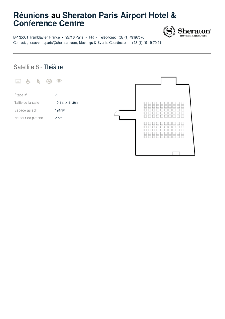 Réunions au Sheraton Paris Airport Hotel & Conference Centre BP 35051 Tremblay en France • 95716 Paris • FR • Téléphone: (33)(1) 49197070 Contact: , [email protected], Meetings & Events Coordinator, +33 (1) 49 19 70 91 Satellite 8 • Théâtre Étage nº -1 Taille de la salle 10.1m x 11.9m Espace au sol 124m² Hauteur de plafond 2.5m