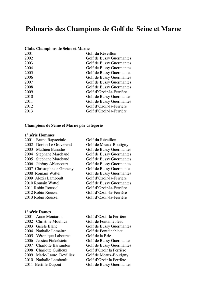 Palmarès des Champions de Golf de Seine et Marne Clubs Champions de Seine et Marne 2001 Golf du Réveillon 2002 Golf de Bussy Guermantes 2003 Golf de Bussy Guermantes 2004 Golf de Bussy Guermantes 2005 Golf de Bussy Guermantes 2006 Golf de Bussy Guermantes 2007 Golf de Bussy Guermantes 2008 Golf de Bussy Guermantes 2009 Golf d’Ozoir-la-Ferrière 2010 Golf de Bussy Guermantes 2011 Golf de Bussy Guermantes 2012 Golf d’Ozoir-la-Ferrière 2013 Golf d’Ozoir-la-Ferrière Champions de Seine et Marne par catégorie 1° série Hommes 2001 Bruno Rapacciulo 2002 Dorian Le Graverend 2003 Mathieu Baroche 2004 Stéphane Marchand 2005 Stéphane Marchand 2006 Jérémy Ablancourt 2007 Christophe de Grancey 2008 Romain Wattel 2009 Alexis Lamboult 2010 Romain Wattel 2011 Robin Roussel 2012 Robin Roussel 2013 Robin Roussel Golf du Réveillon Golf de Meaux-Boutigny Golf de Bussy Guermantes Golf de Bussy Guermantes Golf de Bussy Guermantes Golf de Bussy Guermantes Golf de Bussy Guermantes Golf de Bussy Guermantes Golf d’Ozoir-la-Ferrière Golf de Bussy Guermantes Golf d’Ozoir-la-Ferrière Golf d’Ozoir-la-Ferrière Golf d’Ozoir-la-Ferrière 1° série Dames 2001 Anne Montaron 2002 Christine Mouhica 2003 Gisèle Blanc 2004 Nathalie Lemaitre 2005 Véronique Laboureau 2006 Jessica Finkelstein 2007 Charlotte Barrandon 2008 Charlotte Guilleux 2009 Marie-Laure Devilliez 2010 Nathalie Lamboult 2011 Bertille Dupont Golf d’Ozoir la Ferrière Golf de Fontainebleau Golf de Bussy Guermantes Golf de Fontainebleau Golf de la Brie Golf de Bussy Guermantes Golf de Bussy Guermantes Golf d’Ozoir la Ferrière Golf de Meaux-Boutigny Golf d’Ozoir la Ferrière Golf de Bussy Guermantes 2012 Bertille Dupont 2013 Charlotte Guilleux Golf de Bussy Guermantes Golf d’Ozoir la Ferrière Seniors Hommes 2001 Alain Taddéi 2002 Gérard Barré 2003 Yves Recouvreur 2004 Daniel Ly Congh Trinh 2005 Philippe Breuillard 2006 Augustin Cochin 2007 Robert Pinteau 2008 Augustin Cochin 2009 Xavier Paris 2010 Yves Recouvreur 2011 Fabrice Sarazzin 2012 Christian Burgert 2013 Thierry Devilliez Golf de Bussy Guermantes Golf de La Forteresse ASPTT Corbuches Golf d’Ozoir la Ferrière Golf d’Ozoir la Ferrière Golf d’Ozoir la Ferrière Golf de Bussy Guermantes Golf d’Ozoir la Ferrière Golf de Fontainebleau ASPTT Corbuches Golf de Bussy Guermantes Golf de Fontainebleau Golf de Meaux-Boutigny Seniors Dames 2001 Kornélia Horty 2002 Michèle Ricard 2003 Dant Aubert 2004 Sylvie Armand 2005 Françoise Jouault 2006 Anne Montaron 2007 Françoise Jouault 2008 Sania Rozier 2009 Laurence Ngo 2010 Françoise Jouault 2011 Frédérique Vendéou 2012 Barbara Vernay 2013 Filomena Da Silva Golf d’Ozoir la Ferrière Golf d’Ozoir la Ferrière Golf de Fontainebleau Golf du Réveillon Golf de la Forteresse Golf d’Ozoir la Ferrière Golf de la Forteresse Golf d’Ozoir la Ferrière Golf de Bussy Guermantes Golf de la Forteresse Golf de la Forteresse Golf d’Ozoir la Ferrière Golf d’Ozoir la Ferrière Mid-Amateur Hommes 2006 Sami Zerarka 2007 Martial Voillot 2008 Martial Voillot 2009 Bertrand Szechter 2010 Denis Toulis 2011 Jérômr Leymarie 2012 Julien Brocas 2013 Grégoire Brizay Golf de Bussy Guermantes Golf de Bussy Guermantes Golf de Bussy Guermantes ASPTT Corbuches Golf de la Forteresse Golf d’Ozoir la Ferrière Golf d’Ozoir la Ferrière Golf de Bussy Guermantes Mid-Amateur Dames 2006 Christine Corbrion 2007 Véronique Barré 2008 Véronique Barré 2009 Alice Brunel 2010 Christine Mouhica 2011 Nathalie Lemaître Golf de Meaux-Boutigny Golf de la Forteresse Golf de la Forteresse Golf d’Ozoir la Ferrière Golf de Fontainebleau Golf de Fontainebleau 2012 Nathalie Lemaître 2013 Marie-Laure Devilliez Golf de Fontainebleau Golf de Bussy Guermantes Minimes Garçons 2001 Arthur Goisset 2002 Clément Nargoux 2003 Alexandre Bakkalian 2004 Guillaume Salgado 2005 Alexis Lamboult 2006 Fabien Soler 2007 Nicolas Foschia 2008 Valentin Fouilhous 2009 Pierre Renard 2010 Marc Cohen 2011 Seoyo Lee 2012 Antoine Guerraud 2013 Jeong-Weon Ko Golf de Bussy Guermantes Golf de La Forteresse Golf d’Ozoir la Ferrière Golf de la Brie Golf d’Ozoir la Ferrière Golf de Meaux-Boutigny Golf de Bussy Guermantes Golf de Bussy Guermantes Golf d’Ozoir la Ferrière Golf d’Ozoir la Ferrière Golf de Bussy Guermantes Golf de Meaux-Boutigny Golf de Bussy Guermantes Minimes Filles 2001 Mélissa Urbino 2002 Carole Decaix 2003 Marine Jouet 2004 Marion Mouhica 2005 Charlotte Guilleux 2006 Fleur Ducastel 2007 Bénédicte Parcelier 2008 Marine Zaghbouni 2009 Fiona Toulis 2010 Charlotte Pichon 2011 Solène Le Coz 2012 Claudia Chemin 2013 Alexandra Desjeunes Golf de Meaux-Boutigny Golf d’Ozoir la Ferrière Golf de Fontainebleau Golf de Fontainebleau Golf d’Ozoir la Ferrière Golf de Meaux-Boutigny Golf de Bussy Guermantes Golf d’Ozoir la Ferrière Golf de La Forteresse Golf de Bussy Guermantes Golf d’Ozoir la Ferrière Golf de Bussy Guermantes Golf d’Ozoir la Ferrière Benjamins Garçons 2001 Alexandre Bakkalian 2002 Romain Schneider 2003 Alexis Lamboult 2004 Romain Wattel 2005 Anthony Simpson 2006 Thomas Gotfryd 2007 Robin Roussel 2008 Romain Oliveira 2009 Lucas Beltrami 2010 Corentin Bouby 2011 Jeong-Weon Ko 2012 Arthur Prevot 2013 Lucas Abrial Golf de Clément Ader Golf d’Ozoir la Ferrière Golf d’Ozoir la Ferrière Golf de Bussy Guermantes Golf de Meaux Boutigny Golf de la Forteresse Golf d’Ozoir la Ferrière Golf du Réveillon Golf de Bussy Guermantes Golf de Meaux Boutigny Golf de Bussy Guermantes Golf de Bussy Guermantes Golf d’Ozoir la Ferrière Benjamines Filles 2001 Charlotte Stiers 2002 Elsa Friscira 2003 Alexandra Hatiez 2004 Charlotte Guilleux 2005 Clémence Juignet 2006 Marine Zaghbouni 2007 Bertille Dupont 2008 Bertille Dupont 2009 Solène Le Coz 2010 Kelly Cornet 2011 Anaïs Galas 2012 Anaïs Galas 2013 Jade Tondreau Golf du Réveillon Golf de Bussy Guermantes Golf du Réveillon Golf d’Ozoir la Ferrière Golf de Fontainebleau Golf d