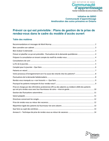 Initiative de QSSO Communauté d’apprentissage Amélioration des soins primaires en Ontario Prévoir ce qui est prévisible : Plans de gestion de la prise de rendez-vous dans le cadre du modèle d’accès ouvert Table des matières Recommandations et messages de Mark Murray ........................................................................................ 2 Bien connaître son cabinet ........................................................................................................................... 3 Bien évaluer la demande .............................................................................................................................. 3 Prévoir et planifier ce qui est prévisible : Fluctuations de la demande quotidienne ................................... 4 Préparer la consultation en tenant compte du motif du rendez-vous ......................................................... 4 Consultations de suivi ................................................................................................................................... 5 La fin de la journée........................................................................................................................................ 5 Complet pour la journée – Que faire ............................................................................................................ 6 Patients en retard ......................................................................................................................................... 7 Votre processus d’enregistrement est-il la cause des retards chez les patients? ........................................ 8 Fluctuations de la demande hebdomadaire ................................................................................................. 8 Rendez-vous manqués ou « non honorés » – Que faire ............................................................................... 9 Pourquoi les patients manquent-ils leur rendez-vous? ................................................................................ 9 Prise en charge par des infirmières praticiennes (IP) ou des adjoints au médecin (AM) des patients qui ont pris rendez-vous avec leur fournisseur de soins – mise en garde .................................................. 10 Gestion des fluctuations saisonnières ........................................................................................................ 11 Saison grippale ............................................................................................................................................ 11 Directives concernant les congés................................................................................................................ 12 Prise de rendez-vous au retour des vacances............................................................................................. 12 Répartition égale des patients du fournisseur de soins absent.................................................................. 13 Que faire au sujet des extrêmes ................................................................................................................. 13 Annexe A – Technique de prise de rendez-vous au retour de vacances .................................................... 14 Prévoir ce qui est prévisible : Plans de gestion de la prise de rendezvous dans le cadre du modèle d’accès ouvert Recommandations et messages de Mark Murray Au cours de la journée, des incidents surviendront qui sont susceptibles de perturber même les emplois du temps les mieux équilibrés. Les fournisseurs de soins partent en vacances ou participent à des congrès. Parfois, les gens doivent quitter le cabinet plus tôt, des patients manquent leurs rendez-vous ou sont en retard. D’autres fois, les journées sont tout simplement surchargées. Il n’y a rien d’extraordinaire à cela; cela fait partie du quotidien des cabinets. Voici quelques méthodes, appelées plans de gestion, que nous recommandons pour gérer les problèmes fréquents dans les cabinets de soins primaires. Pour que la machine soit bien huilée, vous devez établir des plans de gestion des événements susceptibles de perturber le bon déroulement des activités quotidiennes. Ce document décrit les principes qui sous-tendent les méthodes recommandées par Mark Murray, MD MPA. À propos de Mark Murray, MD MPA* Directeur, Mark Murray and Associates Conseiller technique, Idealized Design of Clinical Office Practices (IDCOP), Institute for Healthcare Improvement Sacramento (Californie) Mark Murray a publié de nombreux ouvrages et est reconnu dans le monde entier comme une autorité en création de systèmes d’accès et de flux dans le domaine de la santé. Son savoir-faire et ses compétences ont été sollicités en Alberta, Colombie-Britannique, Saskatchewan et, dernièrement, par Qualité des services de santé Ontario (QSSO) et l’ancien Partenariat de l’amélioration de la qualité et de l’innovation (PAmQI). Les instructeurs en amélioration de la qualité des soins primaires de QSSO et les défenseurs de l’AQ désignés pour participer aux équipes de soins primaires de QSSO dans le domaine ont eu le privilège de recevoir une formation intensive et des conseils de M. Murray. Celui-ci est bien connu pour son enthousiasme et son esprit logique et pragmatique quand il s’agit d’améliorer l’accès et la qualité des soins; il est l’auteur du précepte « Recevez vos patients et ne les faites pas attendre ». *Remerciements Le présent document a été compilé et adapté à partir de la correspondance non publiée de Mark Murray, MD MPA, avec son aimable autorisation. QSSO remercie chaleureusement M. Murray de lui avoir permis de partager son excellent travail avec la communauté des soins primaires de l’Ontario. 2 Qualité des services de santé Ontario MESSAGE DE MARK MURRAY « De nombreux événements qui, a priori, sem