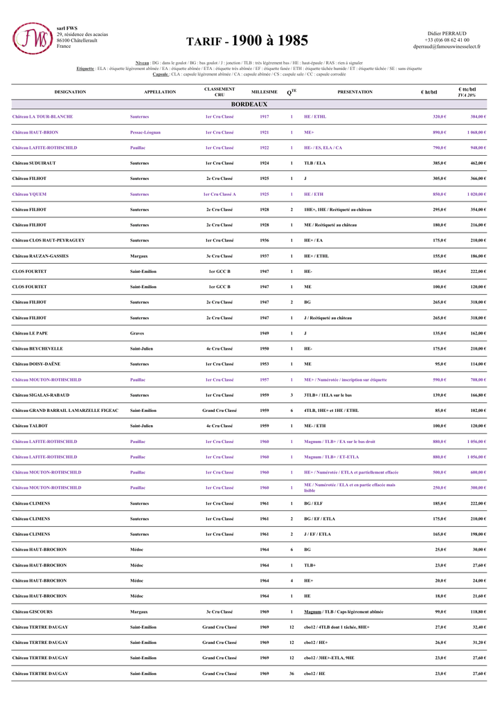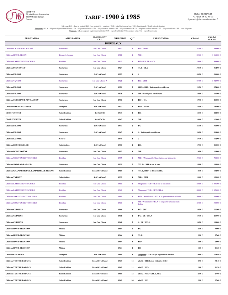 sarl FWS 29, résidence des acacias 86100 Châtellerault France TARIF - 1900 Didier PERRAUD +33 (0)6 08 62 41 00 [email protected] à 1985 Niveau : DG : dans le goulot / BG : bas goulot / J : jonction / TLB : très légèrement bas / HE : haut-épaule / RAS : rien à signaler Etiquette : ELA : étiquette légèrement abîmée / EA : étiquette abîmée / ETA : étiquette très abîmée / EF : étiquette fanée / ETH : étiquette tâchée humide / ET : étiquette tâchée / SE : sans étiquette Capsule : CLA : capsule légèrement abîmée / CA : capsule abîmée / CS : caspule sale / CC : capsule corrodée DESIGNATION APPELLATION CLASSEMENT CRU MILLESIME QTE PRESENTATION € ht/btl € ttc/btl TVA 20% BORDEAUX Château LA TOUR-BLANCHE Sauternes 1er Cru Classé 1917 1 HE / ETHL 320,0 € 384,00 € Château HAUT-BRION Pessac-Léognan 1er Cru Classé 1921 1 ME+ 890,0 € 1 068,00 € Château LAFITE-ROTHSCHILD Pauillac 1er Cru Classé 1922 1 HE- / ES, ELA / CA 790,0 € 948,00 € Château SUDUIRAUT Sauternes 1er Cru Classé 1924 1 TLB / ELA 385,0 € 462,00 € Château FILHOT Sauternes 2e Cru Classé 1925 1 J 305,0 € 366,00 € Château YQUEM Sauternes 1er Cru Classé A 1925 1 HE / ETH 850,0 € 1 020,00 € Château FILHOT Sauternes 2e Cru Classé 1928 2 1HE+, 1HE / Reétiqueté au château 295,0 € 354,00 € Château FILHOT Sauternes 2e Cru Classé 1928 1 ME / Reétiqueté au château 180,0 € 216,00 € Château CLOS HAUT-PEYRAGUEY Sauternes 1er Cru Classé 1936 1 HE+ / EA 175,0 € 210,00 € Château RAUZAN-GASSIES Margaux 3e Cru Classé 1937 1 HE+ / ETHL 155,0 € 186,00 € CLOS FOURTET Saint-Emilion 1er GCC B 1947 1 HE- 185,0 € 222,00 € CLOS FOURTET Saint-Emilion 1er GCC B 1947 1 ME 100,0 € 120,00 € Château FILHOT Sauternes 2e Cru Classé 1947 2 BG 265,0 € 318,00 € Château FILHOT Sauternes 2e Cru Classé 1947 1 J / Reétiqueté au château 265,0 € 318,00 € Château LE PAPE Graves 1949 1 J 135,0 € 162,00 € Château BEYCHEVELLE Saint-Julien 4e Cru Classé 1950 1 HE- 175,0 € 210,00 € Château DOISY-DAËNE Sauternes 1er Cru Classé 1953 1 ME 95,0 € 114,00 € Château MOUTON-ROTHSCHILD Pauillac 1er Cru Classé 1957 1 ME+ / Numérotée / inscription sur étiquette 590,0 € 708,00 € Château SIGALAS-RABAUD Sauternes 1er Cru Classé 1959 3 3TLB+ / 1ELA sur le bas 139,0 € 166,80 € Château GRAND BARRAIL LAMARZELLE FIGEAC Saint-Emilion Grand Cru Classé 1959 6 4TLB, 1HE+ et 1HE / ETHL 85,0 € 102,00 € Château TALBOT Saint-Julien 4e Cru Classé 1959 1 ME- / ETH 100,0 € 120,00 € Château LAFITE-ROTHSCHILD Pauillac 1er Cru Classé 1960 1 Magnum / TLB+ / EA sur le bas droit 880,0 € 1 056,00 € Château LAFITE-ROTHSCHILD Pauillac 1er Cru Classé 1960 1 Magnum / TLB+ / ET-ETLA 880,0 € 1 056,00 € Château MOUTON-ROTHSCHILD Pauillac 1er Cru Classé 1960 1 HE+ / Numérotée / ETLA et partiellement effacée 500,0 € 600,00 € Château MOUTON-ROTHSCHILD Pauillac 1er Cru Classé 1960 1 ME / Numérotée / ELA et en partie effacée mais lisible 250,0 € 300,00 € Château CLIMENS Sauternes 1er Cru Classé 1961 1 BG / ELF 185,0 € 222,00 € Château CLIMENS Sauternes 1er Cru Classé 1961 2 BG / EF / ETLA 175,0 € 210,00 € Château CLIMENS Sauternes 1er Cru Classé 1961 2 J / EF / ETLA 165,0 € 198,00 € Château HAUT-BROCHON Médoc 1964 6 BG 25,0 € 30,00 € Château HAUT-BROCHON Médoc 1964 1 TLB+ 23,0 € 27,60 € Château HAUT-BROCHON Médoc 1964 4 HE+ 20,0 € 24,00 € Château HAUT-BROCHON Médoc 1964 1 HE 18,0 € 21,60 € Château GISCOURS Margaux 3e Cru Classé 1969 1 Magnum / TLB / Caps légèrement abîmée 99,0 € 118,80 € Château TERTRE DAUGAY Saint-Emilion Grand Cru Classé 1969 12 cbo12 / 4TLB dont 1 tâchée, 8HE+ 27,0 € 32,40 € Château TERTRE DAUGAY Saint-Emilion Grand Cru Classé 1969 12 cbo12 / HE+ 26,0 € 31,20 € Château TERTRE DAUGAY Saint-Emilion Grand Cru Classé 1969 12 cbo12 / 3HE+-ETLA, 9HE 23,0 € 27,60 € Château TERTRE DAUGAY Saint-Emilion Grand Cru Classé 1969 36 cbo12 / HE 23,0 € 27,60 € 1969 12 cbo12 / HE dont 8 avec accrocs 22,0 € 26,40 € 1970 1 TLB 13,0 € 15,60 € Cru Bourgeois 1970 12 7BG, 4J, 1TLB 21,0 € 25,20 € 1er Cru Classé 1972 1 BG 350,0 € 420,00 € 1974 6 CBO6 Magnums / BG ou mieux / 2ELA 16,0 € 19,20 € Cru Bourgeois Supérieur 1974 11 TLB / ETHL 12,0 € 14,40 € Cru Bourgeois Supérieur 1974 8 HE+ / ETHL 11,0 € 13,20 € 5e Cru Classé 1975 12 cbo12 / ETHL / 3BG, 1J, 5TLB, 3HE 44,0 € 52,80 € Saint-Emilion 1er Cru Classé B 1975 4 ETHL / J 45,0 € 54,00 € Château TROPLONG-MONDOT Saint-Emilion 1er Cru Classé B 1975 12 2HE+, 8HE, 2HE- 36,0 € 43,20 € Château GRUAUD LAROSE Saint-Julien 2e Cru Classé 1975 1 ETHL / BG 60,0 € 72,00 € Château GRUAUD LAROSE Saint-Julien 2e Cru Classé 1975 8 TLB / ETHL - RP89 59,0 € 70,80 € Château CAMBON LA PELOUSE Haut-Médoc Cru Bourgeois Supérieur 1978 12 cbo12 / 10BG à J, 2TLB 15,0 € 18,00 € Château DE LAMARQUE Haut-Médoc Cru Bourgeois 1978 12 cbo12 / 8BG à J, 1HE+, 1HE 15,0 € 18,00 € Château BEL AIR MARQUIS D'ALIGRE Margaux 1978 1 45,0 € 54,00 € Château BEL AIR MARQUIS D'ALIGRE Margaux 1978 3 ETHL 43,0 € 51,60 € Château LYNCH-BAGES Pauillac 5e Cru Classé 1978 24 37,5cl / cbo24 / 3BG, 3J, 10TLB, 5HE, 2HE-, 1BE 700€ pour le lot 840€ pour le lot Château PIBRAN Pauillac Cru Bourgeois 1978 6 cbo6 / Magnum 39,0 € 46,80 € Château PIBRAN Pauillac Cru Bourgeois 1978 6 cbo6 / Magnum / 6BG / 3ETHL, 1ETLA, 1ETH/ELA 36,0 € 43,20 € Château PICHON COMTESSE DE LALANDE Pauillac 2e Cru Classé 1978 1 RP92 98,0 € 117,60 € Château HAUT-BAILLY Pessac-Léognan Cru Classé 1978 24 37,5cl / cbo24 / 17BG ou mieux , 7J 27,5 € 33,00 € Château HAUT-BAILLY Pessac-Léognan Cru Classé 1978 24 37,5cl / cbo24 / 5J, 13TLB, 6HE 23,0 € 27,60 € Château PAPE CLEMENT Pessac-Léognan Cru Classé 1978 12 cbo12 / 3BG-capsTLA, 1BG-capA, 1BG-ELA-capLA, 3J, 2J-capsLA, 1TLB-capLA, 1TLB