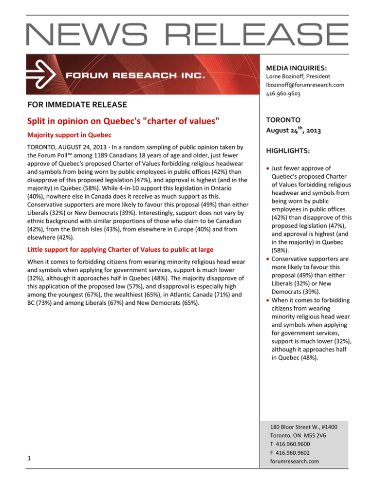 MEDIA INQUIRIES: Lorne Bozinoff, President [email protected] 416.960.9603 FOR IMMEDIATE RELEASE Split in opinion on Quebec's "charter of values" Majority support in Quebec TORONTO, AUGUST 24, 2013 - In a random sampling of public opinion taken by the Forum Poll™ among 1189 Canadians 18 years of age and older, just fewer approve of Quebec's proposed Charter of Values forbidding religious headwear and symbols from being worn by public employees in public offices (42%) than disapprove of this proposed legislation (47%), and approval is highest (and in the majority) in Quebec (58%). While 4-in-10 support this legislation in Ontario (40%), nowhere else in Canada does it receive as much support as this. Conservative supporters are more likely to favour this proposal (49%) than either Liberals (32%) or New Democrats (39%). Interestingly, support does not vary by ethnic background with similar proportions of those who claim to be Canadian (42%), from the British Isles (43%), from elsewhere in Europe (40%) and from elsewhere (42%). Little support for applying Charter of Values to public at large When it comes to forbidding citizens from wearing minority religious head wear and symbols when applying for government services, support is much lower (32%), although it approaches half in Quebec (48%). The majority disapprove of this application of the proposed law (57%), and disapproval is especially high among the youngest (67%), the wealthiest (65%), in Atlantic Canada (71%) and BC (73%) and among Liberals (67%) and New Democrats (65%). 1 TORONTO August 24th, 2013 HIGHLIGHTS: Just fewer approve of Quebec's proposed Charter of Values forbidding religious headwear and symbols from being worn by public employees in public offices (42%) than disapprove of this proposed legislation (47%), and approval is highest (and in the majority) in Quebec (58%). Conservative supporters are more likely to favour this proposal (49%) than either Liberals (32%) or New Democrats (39%). When it comes to forbidding citizens from wearing minority religious head wear and symbols when applying for government services, support is much lower (32%), although it approaches half in Quebec (48%). 180 Bloor Street W., #1400 Toronto, ON M5S 2V6 T 416.960.9600 F 416.960.9602 forumresearch.com MEDIA INQUIRIES: Lorne Bozinoff, President [email protected] 416.960.9603 “If you define a nation by social cohesiveness, then Quebec is a true nation. They resemble the Swiss in their eagerness to protect their, forgive the term, historic social monoculture. Canadians at large, used to years of immigration, don't understand this, but Quebec is always in mortal fear for its soul," said Forum Research President, Dr. Lorne Bozinoff. Lorne Bozinoff, Ph.D. is the president and founder of Forum Research. He can be reached at [email protected] or at (416) 960-9603. 2 TORONTO August 24th, 2013 HIGHLIGHTS: “If you define a nation by social cohesiveness, then Quebec is a true nation. They resemble the Swiss in their eagerness to protect their, forgive the term, historic social monoculture. Canadians at large, used to years of immigration, don't understand this, but Quebec is always in mortal fear for its soul," said Forum Research President, Dr. Lorne Bozinoff. 180 Bloor Street W., #1400 Toronto, ON M5S 2V6 T 416.960.9600 F 416.960.9602 forumresearch.com MEDIA INQUIRIES: Lorne Bozinoff, President [email protected] 416.960.9603 Methodology The Forum Poll™ was conducted by Forum Research with the results based on an interactive voice response telephone survey of 1,189 randomly selected Canadians 18 years of age and older. The poll was conducted on August 23rd, 2013. TORONTO August 24th, 2013 Results based on the total sample are considered accurate +/- 3%, 19 times out of 20. Subsample results will be less accurate. Margins of error for subsample (such as age, gender) results are available at www.forumresearch.com/samplestim.asp Where appropriate, the data has been statistically weighted to ensure that the sample reflects the actual population according to the latest Census data. This research is not necessarily predictive of future outcomes, but rather, captures opinion at one point in time. Forum Research conducted this poll as a public service and to demonstrate our survey research capabilities. With offices across Canada and around the world, 100% Canadian-owned Forum Research is one of the country’s leading survey research firms. This Forum Poll™and other polls may be found at Forum's poll archive at www.forumresearch.com/polls.asp 3 180 Bloor Street W., #1400 Toronto, ON M5S 2V6 T 416.960.9600 F 416.960.9602 forumresearch.com MEDIA INQUIRIES: Lorne Bozinoff, President [email protected] 416.960.9603 Quebec Legislation – Government Employees TORONTO August 24th, 2013 ‘The Quebec provincial government is considering legislation outlawing religious clothing and symbols such as hijabs, turbans and skullcaps from being worn by public employees in schools, hospitals and other government buildings in Quebec. Do you approve or disapprove of this?’ [All Respondents] Age / Gender % Total 18-34 35-44 45-54 55-64 65+ Male Female Sample Approve Disapprove Don't know 1189 42 47 11 104 38 53 9 138 47 47 6 222 41 45 14 325 44 46 10 400 44 42 14 562 49 42 9 627 36 52 12 % Total Atl Que ON Man/Sask AB BC Sample Approve Disapprove Don't know 1189 42 47 11 132 30 56 14 237 58 33 10 388 40 51 9 116 35 51 14 132 39 47 14 184 35 55 10 Region Household Income % Total <S20K S20-40K S40-60K S60-80K S80-100K S100-250K S250K+ Sample Approve Disapprove Don't know 1189 42 47 11 111 47 39 14 208 44 42 14 194 39 47 14 155 40 55 5 111 46 45 9 187 36 54 9 30 56 43 1 4 180 Bloor Street W., #1400 Toronto, ON M5S 2V6 T 416.960.9600 F 416.960.9602 forumresearch.com MEDIA INQUIRIES: Lorne Bozinoff, President [email protected] 416.960.9603 Current Federal Party Preference % Total Cons Lib NDP Green Bloc Other Parties Sample Approve Disapprove Don't know 1189 42 47 11 338 49 