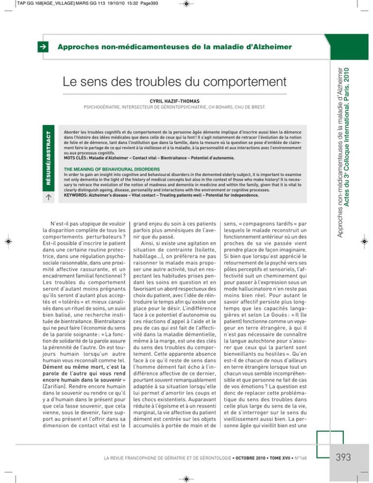 TAP GG 168[AGE_VILLAGE]:MARS GG 113 19/10/10 15:32 Page393 > Le sens des troubles du comportement CYRIL HAZIF-THOMAS > RÉSUMÉ/ABSTRACT PSYCHOGÉRIATRE, INTERSECTEUR DE GÉRONTOPSYCHIATRIE, CH BOHARS, CHU DE BREST. Aborder les troubles cognitifs et du comportement de la personne âgée démente implique d’inscrire aussi bien la démence dans l’histoire des idées médicales que dans celle de ceux qui la font! Il s’agit notamment de retracer l’évolution de la notion de folie et de démence, tant dans l’institution que dans la famille, dans la mesure où la question se pose d'emblée de clairement faire le partage de ce qui revient à la vieillesse et à la maladie, à la personnalité et aux interactions avec l’environnement ou aux processus cognitifs. MOTS CLÉS: Maladie d’Alzheimer – Contact vital – Bientraitance – Potentiel d’autonomie. THE MEANING OF BEHAVIOURAL DISORDERS In order to gain an insight into cognitive and behavioural disorders in the demented elderly subject, it is important to examine not only dementia in the light of the history of medical concepts but also in the context of those who make history! It is necessary to retrace the evolution of the notion of madness and dementia in medicine and within the family, given that it is vital to clearly distinguish ageing, disease, personality and interactions with the environment or cognitive processes. KEYWORDS: Alzheimer’s disease – Vital contact – Treating patients well – Potential for independence. N’est-il pas utopique de vouloir la disparition complète de tous les comportements perturbateurs ? Est-il possible d’inscrire le patient dans une certaine routine protectrice, dans une régulation psychosociale raisonnable, dans une proximité affective rassurante, et un encadrement familial fonctionnel ? Les troubles du comportement seront d’autant moins prégnants qu’ils seront d’autant plus acceptés et « tolérés » et mieux canalisés dans un rituel de soins, un suivi bien balisé, une recherche instituée de bientraitance. Bientraitance qui ne peut faire l’économie du sens de la parole soignante : « La fonction de solidarité de la parole assure la pérennité de l’autre. On est toujours humain lorsqu’un autre humain vous reconnaît comme tel. Dément ou même mort, c’est la parole de l’autre qui vous rend encore humain dans le souvenir » (Zarifian). Rendre encore humain dans le souvenir ou rendre ce qu’il y a d’humain dans le présent pour que cela fasse souvenir, que cela vienne, sous le devenir, faire support au présent et l’offrir dans sa dimension de contact vital est le grand enjeu du soin à ces patients parfois plus amnésiques de l’avenir que du passé. Ainsi, si existe une agitation en situation de contrainte (toilette, habillage…), on préfèrera ne pas raisonner le malade mais proposer une autre activité, tout en respectant les habitudes prises pendant les soins en question et en favorisant un abord respectueux des choix du patient, avec l’idée de réintroduire le temps afin qu’existe une place pour le désir. L’indifférence face à ce potentiel d’autonomie ou ces réactions d’appel à l’aide et le peu de cas qui est fait de l’affectivité dans la maladie démentielle, même à la marge, est une des clés du sens des troubles du comportement. Cette apparente absence face à ce qu’il reste de sens dans l’homme dément fait écho à l’indifférence affective de ce dernier, pourtant souvent remarquablement adaptée à sa situation lorsqu’elle lui permet d’amortir les coups et les chocs existentiels. Auparavant réduite à l’égoïsme et à un ressenti marginal, la vie affective du patient dément est centrée sur les objets accumulés à portée de main et de sens, « compagnons tardifs » par lesquels le malade reconstruit un fonctionnement antérieur où un des proches de sa vie passée vient prendre place de façon imaginaire. Si bien que lorsqu’est apprécié le retournement de la psyché vers ses pôles perceptifs et sensoriels, l’affectivité suit un cheminement qui pour passer à l’expression sous un mode hallucinatoire n’en reste pas moins bien réel. Pour autant le savoir affectif persiste plus longtemps que les capacités langagières et selon Le Gouès : « Il (le patient) fonctionne comme un voyageur en terre étrangère, à qui il n’est pas nécessaire de connaître la langue autochtone pour s’assurer que ceux qui la parlent sont bienveillants ou hostiles ». Qu’en est-il de chacun de nous d’ailleurs en terre étrangère lorsque tout un chacun vous semble incompréhensible et que personne ne fait de cas de vos émotions ? La question est donc de replacer cette problématique du sens des troubles dans celle plus large du sens de la vie, et de s’interroger sur le sens du vieillissement aussi bien. La personne âgée qui vieillit bien est une LA REVUE FRANCOPHONE DE GÉRIATRIE ET DE GÉRONTOLOGIE • OCTOBRE 2010 • TOME XVII • N°168 Approches non-médicamenteuses de la maladie d’Alzheimer Actes du 3e Colloque International. Paris. 2010 Approches non-médicamenteuses de la maladie d’Alzheimer 393 TAP GG 168[AGE_VILLAGE]:MARS GG 113 19/10/10 15:32 Page394 Approches non-médicamenteuses de la maladie d’Alzheimer Actes du 3e Colloque International. Paris. 2010 > 394 personne âgée dont le « souffrir » ne s’arrête pas à elle-même (Lévinas). Cette compassion, cette ouverture à la transcendance et à sa descendance, est une motivation essentielle à la construction d’une anticipation positive dans l’âge avancé. On donnera quelques exemples qui montrent que cette fonction peut être conservée ce qui remet en cause les théories affirmant l’atteinte irréversible de la conscience de soi chez le patient dément. En se reprenant là où elle est vulnérable pour consolider autrui, elle sauve son avenir et échappe à l’étiquette de personne vulnérable qui fait d’elle 
