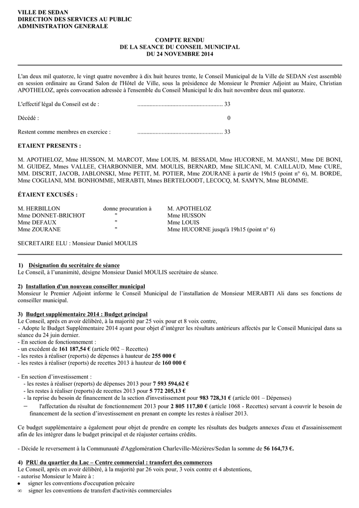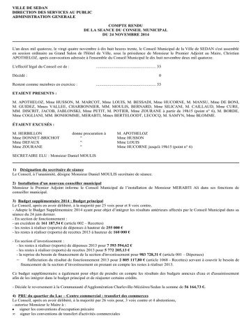 VILLE DE SEDAN DIRECTION DES SERVICES AU PUBLIC ADMINISTRATION GENERALE COMPTE RENDU DE LA SEANCE DU CONSEIL MUNICIPAL DU 24 NOVEMBRE 2014 L'an deux mil quatorze, le vingt quatre novembre à dix huit heures trente, le Conseil Municipal de la Ville de SEDAN s'est assemblé en session ordinaire au Grand Salon de l'Hôtel de Ville, sous la présidence de Monsieur le Premier Adjoint au Maire, Christian APOTHELOZ, après convocation adressée à l'ensemble du Conseil Municipal le dix huit novembre deux mil quatorze. L'effectif légal du Conseil est de : ........................................................ 33 Décédé : 0 Restent comme membres en exercice : ........................................................ 33 ETAIENT PRESENTS : M. APOTHELOZ, Mme HUSSON, M. MARCOT, Mme LOUIS, M. BESSADI, Mme HUCORNE, M. MANSU, Mme DE BONI, M. GUIDEZ, Mmes VALLEE, CHARBONNIER, MM. MOULIS, BERNARD, Mme SILICANI, M. CAILLAUD, Mme CURE, MM. DISCRIT, JACOB, JABLONSKI, Mme PETIT, M. POTIER, Mme ZOURANE à partir de 19h15 (point n° 6), M. BORDE, Mme COGLIANI, MM. BONHOMME, MERABTI, Mmes BERTELOODT, LECOCQ, M. SAMYN, Mme BLOMME. ÉTAIENT EXCUSÉS : M. HERBILLON Mme DONNET-BRICHOT Mme DEFAUX Mme ZOURANE donne procuration à " " " M. APOTHELOZ Mme HUSSON Mme LOUIS Mme HUCORNE jusqu'à 19h15 (point n° 6) SECRETAIRE ELU : Monsieur Daniel MOULIS 1) Désignation du secrétaire de séance Le Conseil, à l’unanimité, désigne Monsieur Daniel MOULIS secrétaire de séance. 2) Installation d'un nouveau conseiller municipal Monsieur le Premier Adjoint informe le Conseil Municipal de l’installation de Monsieur MERABTI Ali dans ses fonctions de conseiller municipal. 3) Budget supplémentaire 2014 : Budget principal Le Conseil, après en avoir délibéré, à la majorité par 25 voix pour et 8 voix contre, - Adopte le Budget Supplémentaire 2014 ayant pour objet d’intégrer les résultats antérieurs affectés par le Conseil Municipal dans sa séance du 24 juin dernier. - En section de fonctionnement : - un excédent de 161 187,54 € (article 002 – Recettes) - les restes à réaliser (reports) de dépenses à hauteur de 255 000 € - les restes à réaliser (reports) de recettes 2013 à hauteur de 160 000 € - En section d’investissement : - les restes à réaliser (reports) de dépenses 2013 pour 7 593 594,62 € - les restes à réaliser (reports) de recettes 2013 pour 5 772 205,13 € - la reprise du besoin de financement de la section d'investissement pour 983 728,31 € (article 001 – Dépenses) − l'affectation du résultat de fonctionnement 2013 pour 2 805 117,80 € (article 1068 - Recettes) servant à couvrir le besoin de financement de la section d’investissement en prenant en compte les restes à réaliser 2013. Ce budget supplémentaire a également pour objet de prendre en compte les résultats des budgets annexes d'eau et d'assainissement afin de les intégrer dans le budget principal et de réajuster certains crédits. - Décide le reversement à la Communauté d'Agglomération Charleville-Mézières/Sedan la somme de 56 164,73 €. 4) PRU du quartier du Lac – Centre commercial : transfert des commerces Le Conseil, après en avoir délibéré, à la majorité par 26 voix pour, 3 voix contre et 4 abstentions, - autorise Monsieur le Maire à : ● signer les conventions d'occupation précaire • signer les conventions de transfert d'activités commerciales • signer la convention de cessation d'activité. 5) Affectation de subventions Le Conseil, après en avoir délibéré, à la majorité par 28 voix pour et 4 abstentions, - affecte la subvention suivante : Imputation Intitulé Montant budgétaire Comité de Bassin d'Emploi 6745-90 A la majorité par 29 pour, 2 contre et 1 abstention, − affecte les subventions suivantes : Imputation Intitulé budgétaire OCCE Coopérative Scolaire Ecole 6574-213 Primaire Georges Ouvrard OCCE 08 coop scolaire Ecole 6574-213 primaire de l’Esplanade OCCE 08 Coopérative Scolaire 6574-213 Ecole primaire quartier de Frénois OCCE 08 Coopérative Scolaire 6574-213 Ecole maternelle La Plage OCCE 08 Coopérative Scolaire 6574-213 Ecole maternelle Prairie OCCE 08 Coopérative Scolaire 6574-213 Ecole primaire Bellevue OCCE 08 Coopérative Scolaire 6574-213 Ecole mixte Fond de Givonne OCCE 08 Coopérative Scolaire 6574-213 Ecole maternelle Résidence OGEC de Sedan 1 6574-213 OGEC de Sedan 6574-213 OCCE 08 coop scolaire – Ecole 6574-213 primaire de l’Esplanade OCCE 08 coop scolaire – Ecole 6574-213 primaire de l’Esplanade OCCE 08 Coopérative Scolaire 6574-213 Ecole primaire Bellevue OCCE 08 Coopérative Scolaire 6574-213 Ecole primaire Bellevue OCCE 08 Coopérative Scolaire 6574-213 Ecole primaire Bellevue 23 307 € Reversement DDU 2013 Montant Observations 515,10 € Crédits de Noël 2014 – École maternelle G. Ouvrard 489,85 € Crédits de Noël 2014 – École maternelle Esplanade 111,10 € Crédits de Noël 2014 – École maternelle de Frénois 363,60 € Crédits de Noël 2014 – École maternelle La Plage 262,60 € Crédits de Noël 2014 – École maternelle Prairie 484,80 € Crédits de Noël 2014 – École maternelle Louise Michel 333,30 € Crédits de Noël 2014 – École maternelle P. Congar 353,50 € Crédits de Noël 2014 – École maternelle Résidence 292,90 € Crédits de Noël 2014 – École du Sacré Cœur 328,25 € Crédits de Noël 2014 – Ecole de La Salle Participation au projet « Ecole et Cinéma » en partenariat avec le 332,50 € cinéma Turenne Participation au spectacle « Anita le clown » pour les élèves de 370,00 € maternelle 201,00 € Participation au projet « Football des princesses » 420,00 € 569,50 € Participation au projet « Ecole et Cinéma » en partenariat avec le cinéma Turenne Participation au projet « Microcosmos » mené avec la MJC Calonne Reversement subvention CAF pour les actions développées au titre du Contrat Enfance Jeunesse 2011-2014 pour l'année 2013 Reversemen