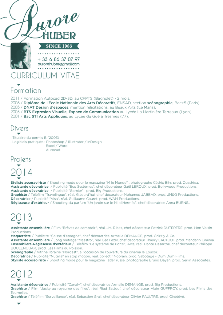 CURRICULUM VITAE Formation 2011 2008 2005 2003 2001 / / / / / Formation Autocad 2D-3D, au CFPTS (Bagnolet) - 2 mois. Diplôme de l'École Nationale des Arts Décoratifs, ENSAD, section scénographie, Bac+5 (Paris). DNAT Design d'espaces, mention félicitations, au Beaux Arts (Le Mans). BTS Expresion Visuelle, Espace de Communication au Lycée La Martinière Terreaux (Lyon). Bac STI Arts Appliqués, au Lycée du Gué à Tresmes (77). Divers . Titulaire du permis B (2003) . Logiciels pratiqués : Photoshop / Illustrator / InDesign Excel / Word Autocad Projets 2014 Styliste accessoiriste / Shooting mode pour le magazine "M le Monde" , photographe Cédric Bihr, prod. Quadriga. Assistante décoratrice / Publicité "Eco Systèmes", chef décorateur Gaël LEROUX, prod. Bollywood Productions. Assistante décoratrice / Publicité "Garnier", prod. Big Productions. Graphiste / Téléfilm "Travelingue", réal. G.Jourd'hui, chef décorateur Mohamed JABBAD, prod. JM&G Productions. Décoratrice / Publicité "Visa", réal. Guillaume Couret, prod. WAM Productions. Régisseuse d’extérieur / Shooting du parfum "Un jardin sur le Nil d’Hermès", chef décoratrice Anna BURNS.. 2013 Assistante ensemblière / Film "Brèves de comptoir", réal. JM. Ribes, chef décorateur Patrick DUTERTRE, prod. Mon Voisin Productions Maquettiste / Publicité "Caisse d’épargne", chef décoratrice Armelle DEMANGE, prod. Grizzly & Co. Assistante ensemblière / Long métrage "Maestro", réal. Léa Fazer, chef décorateur Thierry LAUTOUT, prod. Mandarin Cinéma. Ensemblière-Régisseuse d'extérieur / Téléfilm "Le système de Ponzi", Arte, réal. Dante Desarthe, chef décorateur Philippe BOULENOUAR, prod. Les Films du Poisson. Scénographe / Vitrine librairie "Nordest", à l'occasion de l'ouverture du cinéma le Louxor. Décoratrice / Publicité "Nutella" en stop motion, réal. collectif Nobrain, prod. Sabotage - Dum Dum Films. Styliste accessoiriste / Shooting mode pour le magazine Tatler russe, photographe Bruno Dayan, prod. Serlin Associates. 2012 Assistante décoratrice / Publicité "Canal+", chef décoratrice Armelle DEMANGE, prod. Big Productions. Graphiste / Film "Jacky au royaume des filles", réal. Riad Sattouf, chef décorateur Alain GUFFROY, prod. Les Films des Tournelles. Graphiste / Téléfilm "Surveillance", réal. Sébastien Grall, chef décorateur Olivier PAULTRE, prod. Cinétévé. Graphiste / Série TV "Alice Nevers", TF1, chef décorateur Denis CHAMPENOIS, prod. Ego Production Chef décoratrice / Film "Swim little fish swim" (partie française), réal. Lola Bessis et Ruben Amar. Graphiste / Publicité "Monabanq", chef décorateur Gaël LEROUX. Seconde assistante décoratrice / Téléfilm "Miroir, mon amour", Arte, réal. Sigried Alnoy, chef décoratrice Véronique BARNÉOUD, prod. Flach Film Production. 2011 Chef décoratrice / Shooting photo "Autumn leaves", photographe Alessandro Clemanza. Assistante décoratrice / Téléfilm "Le déclin de l'empire masculin", Arte, réal. A. Cianci, chef décorateur Hérald NAJAR, prod. Nelka Films. Seconde assistante décoratrice / Film "De l'usage du sextoy en temps de crise", réal. E.Pittard, chef décoratrice Véronique BARNÉOUD, prod. ADR Productions. Seconde assistante décoratrice / Téléfilm "Les crapuleuses", France 2, réal. M. Richard-Serrano, chef décorateur Arnaud LE ROCH, prod. Kwaï. Assistante décoratrice / Publicité web "Numéricable", chef décoratrice Émeline STRANART, prod. Change Digital. 2010 Assistante décoratrice adjointe / Série TV "Au siècle de Maupassant, contes et nouvelles du 19ème siècle", France 2, chef décorateur Régis NICOLINO, prod. JM. Productions. "En famille", réal. D.Malleval - "Boule de Suif", réal. P.Béranger - "Mon oncle Sosthène", réal. G.Jourd'hui - "Yvette", réal. O.Schatzky. Graphiste / Film "Rien à déclarer", réal. D. Boon, chef décorateur Alain VEISSIER, prod. Pathé Films. Chef décoratrice / Court-métrage "La réparation", réal. C.Ramos et J.Boustani, prod. La Voie Lactée Production. 2008/2009 Assistante décoratrice adjointe / Série TV "Au siècle de Maupassant", France 2, chef décorateur Régis NICOLINO, prod. JM. Productions. "On purge bébé", réal. G.Jourd'hui - "Un gentilhomme", réal. L.Heynemann - "Crainquebille", réal. P.Monnier - "Le fauteuil hanté", réal. C.Chabrol - "Pour une nuit d'amour", réal. G.Jourd'hui - "Claude Gueux", réal. O.Schatzky. Assistante décoratrice adjointe / Téléfilm "Les méchantes", France 2, réal P.Monnier, chef décorateur Régis NICOLINO, prod. JM. Productions. Ensemblière / Campagne d'affichage contre le mal-logement, Fondation Abbé Pierre, agence BDDP Unlimited. 2005/2013 2005/2008 Et encore avant Accessoiriste / Stock Acccesoires de la SFP-Euromédia France par intermittence (Bry sur Marne). Hôtesse d'accueil / Théâtre National de Chaillot (Paris). Stagiaire déco plasticienne / "Boliloc" (théâtre, danse et marionnette), compagnie Philippe Genty. Scénographe / Pièce de théâtre avec des comédiens handicapés, Association Arnaud Productions. Scénographe / "Soifs d'amour - trois nô modernes de Moshima", au théâtre de Chaillot, mise en sc. G.Freixe (Paris). Stagiaire déco / Théâtre des Amandiers, service décoration (Nanterre). Stagiaire déco / Opéra Bastille, service décoration (Paris). Stagiaire déco / Société Française de Production, service décoration (Bry sur Marne). Scénographe / Pièce de théâtre "Trois version de la vie, de Y.Reza", +voix off, au théâtre de l'Actalia (Le Mans). Stagiaire déco / TV " Top 50, élection Miss France, ..." Hôtesse d'accueil / Opéra Garnier (Paris). Stagiaire / Cabinet d'architectes DPLG et scénographes "D.Onde et S.Thomas" (Paris). Stagiaire déco / "Cousu Main", entreprise de décor ( TV, évènement, spectacle...).
