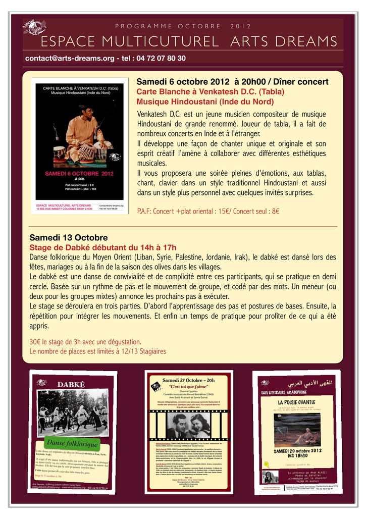 P RO G R A M ME OC TO B R E 2 0 1 2 ESPAC E M U LT I C UTUREL ARTS DREAMS [email protected] - tel : 04 72 07 80 30 Samedi 6 octobre 2012 à 20h00 / Dîner concert Carte Blanche à Venkatesh D.C. (Tabla) Musique Hindoustani (Inde du Nord) hlll SAMEDI 16 JUIN 2012 Venkatesh D.C. est un jeune musicien compositeur de musique Hindoustani de grande renommé. Joueur de tabla, il a fait de nombreux concerts en Inde et à l'étranger. Il développe une façon de chanter unique et originale et son esprit créatif l’amène à collaborer avec différentes esthétiques musicales. Il vous proposera une soirée pleines d'émotions, aux tablas, chant, clavier dans un style traditionnel Hindoustani et aussi dans un style plus personnel avec quelques invités surprises. P.A.F: Concert +plat oriental : 15€/ Concert seul : 8€ JEUDI 28 JUIN 2012 Samedi 13 Octobre Stage de Dabké débutant du 14h à 17h Danse folklorique du Moyen Orient (Liban, Syrie, Palestine, Jordanie, Irak), le dabké est dansé lors des fêtes, mariages ou à la fin de la saison des olives dans les villages. Le dabké est une danse de convivialité et de complicité entre ces participants, qui se pratique en demi cercle. Basée sur un rythme de pas et le mouvement de groupe, et codé par des mots. Un meneur (ou deux pour les groupes mixtes) annonce les prochains pas à exécuter. Le stage se déroulera en trois parties. D'abord l'apprentissage des pas et postures de bases. Ensuite, la répétition pour intégrer les mouvements. Et enfin un temps de pratique pour profiter de ce qui a été appris. 30€ le stage de 3h avec une dégustation. Le nombre de places est limités à 12/13 Stagiaires Samedi 20 Octobre - Café littéraire arabophone Dés 18h30 «La poésie chantée» La musique dans la poésie arabe, variété de métriques et variété de rythmes. Cette nouvelle édition du café littéraire arabophone accueillera Anas ALAILI ( Poète et parolier) sur le thème de la poésie chantée. La poésie arabe contient 16 métriques. Pour cela cette poésie est très riche par sa musicalité et par ces différents rythmes. Anas ALAILI nous parlera de cette richesse musicale et de son expérience en tant que parolier et poète. Il sera accompagné par le chanteur YAZAN AL-mashni. Adhésion annuelle : 5€ Samedi 27 Octobre Cinéma Égyptien 20h « C'EST TOI QUE J’AIME» de Ahmad Badrakhan Comédie musicale de 1949. Avec Farid Al-atrach et Samia Gamal. Mounir, télégraphiste, rencontre une danseuse nommée Nadia dont il tombe vite amoureux. Quelques jours plus tard, il la surprend dans les bras de son meilleur ami... Ahmad Badrakhan (1909-1969) Réalisateur égyptien, il est l'auteur notamment de Fatma (1947), Dernier mensonge (1950) et de Taxi de l'amour. Samia Gamal (1924-1994) Danseuse égyptienne surnommée « le papillon dansant ». Farid Al-atrach (1915-1974) Artiste Syro-Egyptien aux multiples talents. Auteur, compositeur, interprète, virtuose de l'oud, et acteur. Surnommé « le chanteur triste ». LE MOIS D’OCTOBRE EST AUSSUI LE MOIS DE REPRISE DES COURS ET ATELIERS Si vous n’êtes pas inscris, il est encore possible de le faire, sur notre site ou en venant nous voir pour le cours d’essai. Théâtre multilingue: Cours et stages basés sur des techniques de l’improvisation autour d'une pédagogie douce . Adultes / Enfants Tea Time : Améliorer sa pratique orale de l’anglais dans une ambiance conviviale autour d’un thé, à l’image du « British Tea Time ». Intermédiaire Arabe littéraire : Le contenu du cours est axé sur la maîtrise de l'alphabet arabe, des faits de langue élémentaires (conjugaison des ESPACE ARTS DREAMS , 15 BIS RUE IMBERT COLOMES 69001 LYON TEL : 04 72 07 80 30 - www.arts-dreams.org [email protected]