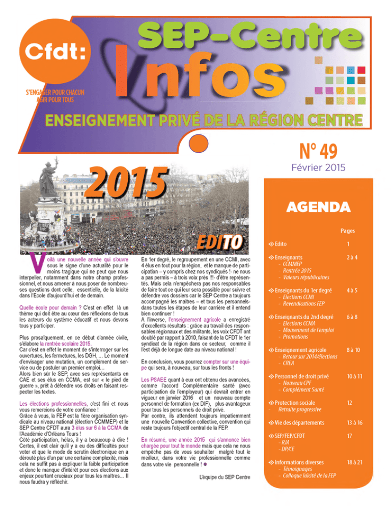 re ON CENTRE DE BAR N° 49 201 F évrier 2015 iì TTt4 , i'CTm A w S AGENDA Pages oilà une nouvelle année qui s'ouvre sous le signe d'une actualité pour le moins tragique qui ne peut que nous interpeller, notamment dans notre champ profes sionnel, et nous amener à nous poser de nombreu ses questions dont celle, essentielle, de la laïcité dans l'Ecole d'aujourd'hui et de demain. Quelle école pour demain ? C'est en effet là un thème qui doit être au cœur des réflexions de tous les acteurs du système éducatif et nous devons tous y participer. Plus prosaïquement, en ce début d'année civile, s'élabore la rentrée scolaire 2015. Car c'est en effet le moment de s'interroger sur les ouvertures, les fermetures, les DGH, ... Le moment d'envisager une mutation, un complément de ser vice ou de postuler un premier emploi. Alors bien sûr le SEP, avec ses représentants en CAE et ses élus en CCMA, est sur « le pied de guerre », prêt à défendre vos droits en faisant res pecter les textes. Les élections professionnelles, c'est fini et nous vous remercions de votre confiance ! Grâce à vous, la FEP est la 1ère organisation syn dicale au niveau national (élection CCMMEP) et le SEP Centre CFDT aura 3 élus sur 6 à la CCMA de l'Académie d'Orléans Tours ! Côté participation, hélas, il y a beaucoup à dire ! Certes, il est clair qu'il y a eu des difficultés pour voter et que le mode de scrutin électronique en a dérouté plus d'un par une certaine complexité, mais cela ne suffit pas à expliquer la faible participation et donc le manque d'intérêt pour ces élections aux enjeux pourtant cruciaux pour tous les m a ître s. Il nous faudra y réfléchir. En 1er degré, le regroupement en une CCMI, avec 4 élus en tout pour la région, et le manque de parti cipation - y compris chez nos syndiqués !- ne nous a pas permis - à trois voix près !!!- d'être représen tés. Mais cela n'empêchera pas nos responsables de faire tout ce qui leur sera possible pour suivre et défendre vos dossiers car le SEP Centre a toujours accompagné les maitres - et tous les personnelsdans toutes les étapes de leur carrière et il entend bien continuer ! A l'inverse, l'enseignement agricole a enregistré d'excellents résultats : grâce au travail des respon sables régionaux et des militants, les voix CFDT ont doublé par rapport à 2010, faisant de la CFDT le 1er syndicat de la région dans ce secteur, comme il l'est déjà de longue date au niveau national ! lE d it o 1 1 2 à 4 E n s e ig n a n t s - CCM M EP - Rentrée 2015 - Valeurs républicaines 1 E n s e ig n a n t s d u 1er d e g r é 4 à 5 - Elections C CM I - Revendications FEP 1 E n s e ig n a n t s d u 2 n d d e g r é 6 à 8 - Elections CCMA - M ou vem ent de l'em plo i - Prom otions 1 E n s e ig n e m e n t a g ric o le 8 à 10 - Retour su r 2014/élections En conclusion, vous pourrez compter sur une équi pe qui sera, à nouveau, sur tous les fronts ! Les PSAEE quant à eux ont obtenu des avancées, comme l'accord Complémentaire santé (avec participation de l'employeur) qui devrait entrer en vigueur en janvier 2016 et un nouveau compte personnel de formation (ex DIF), plus avantageux pour tous les personnels de droit privé. Par contre, ils attendent toujours impatiemment une nouvelle Convention collective, convention qui reste toujours l'objectif central de la FEP. En résumé, une année 2015 qui s'annonce bien chargée pour tout le monde mais que cela ne nous empêche pas de vous souhaiter malgré tout le meilleur, dans votre vie professionnelle comme dans votre vie personnelle ! • - CREA 1 P e r s o n n e l d e d r o it p riv é 1 0 à 11 - N o u ve au CPF - C om plém ent Sa n té 1 - P ro te c tio n so c ia le 12 Retraite progressive I V i e d e s d é p a rte m e n ts 13 à 16 1SEP/FEP/CFDT 17 - RJA - DP/CE 1 1 n f o r m a t i o n s d iv e r s e s 1 8 à 21 - T ém oign age s L'équipe du SEP Centre - Colloque laïcité de la FEP ï Enseignants ELECTIONS COMITÉ CONSULTATIF MINISTÉRIEL DES MAÎTRES DE L'ENSEIGNEMENT PRIVÉ CCMMEP ■ Comité Consultatif Ministériel des Maîtres de l'Enseignement Privé (CCMMEP) Cette instance de concertation avait été réclamée de longue date par la FEP CFDT en signe d'équité avec les autres agents de la Fonction publique. Nous l'avons présentée dans nos précé dents journaux. Ce Comité sera le lieu où seront discutés et négociés avec le Ministère de l'Edu cation nationale et les représentants des enseignants, les textes ministériels s'ap pliquant aux enseignants sous contrat, notamment sur : ■ • La gestion prévisionnelle des effectifs, des emplois et des compétences. • Les règles statutaires et les règles relatives à l'échelonne ment indiciaire. • Les orientations en matière de politique indemnitaire. • La formation, le développe ment des compétences et qua lifications professionnelles. • La parité, la lutte contre toutes les discriminations ... Elections C'était la première fois que tous les ensei gnants du privé dépendant du Ministère de l'Education nationale (environ 135 000 personnels) étaient appelés à voter pour un même organisme. La FEP CFDT a recueilli 31,6% des suffra ges exprimés aux élections du CCMMEP Elle se place ainsi en première position et sera la seule organisation syndicale dispo sant de 4 élus* sur les 10 de l'instance. Les deux autres organisations représen tées au CCMMEP sont la CFTC et le SPELC (3 élus titulaires chacun). La FEP CFDT remercie toutes les électrices et tous les électeurs qui lui ont fait confiance ! *Elus titulaires FEP CFDT : Bruno Lamour (syndicat du Nord), Valérie Ginet (syndicat de Paris), Christian Dougé (syndicat de Vendée), Fabienne Bresse-Monteil (syndicat de l'Ardèche). Suppléants : André Jeffroy (Côtes d'Armor), Monique Bergamelli (Bourgogne), Patrick Vasseur (Nord), Bernadette Charmoille (Franche Comté). ■ Réunion du CCMMEP Le tout nouveau CCMMEP a été installé