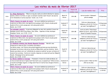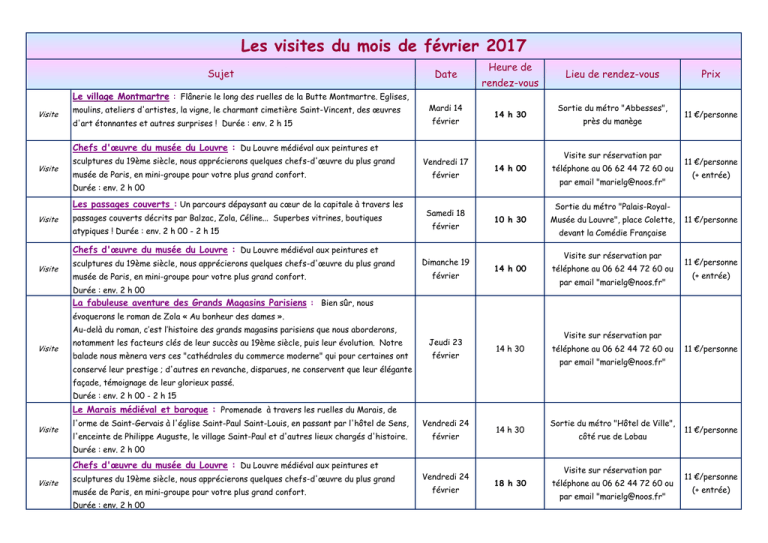 Les visites du mois de février 2017 Sujet Date Heure de rendez-vous Lieu de rendez-vous Prix Le village Montmartre : Flânerie le long des ruelles de la Butte Montmartre. Eglises, Visite moulins, ateliers d'artistes, la vigne, le charmant cimetière Saint-Vincent, des œuvres d'art étonnantes et autres surprises ! Durée : env. 2 h 15 Mardi 14 février 14 h 30 Chefs d'œuvre du musée du Louvre : Du Louvre médiéval aux peintures et Visite sculptures du 19ème siècle, nous apprécierons quelques chefs-d'œuvre du plus grand musée de Paris, en mini-groupe pour votre plus grand confort. Vendredi 17 février Visite passages couverts décrits par Balzac, Zola, Céline... Superbes vitrines, boutiques atypiques ! Durée : env. 2 h 00 - 2 h 15 Samedi 18 février 14 h 00 Visite musée de Paris, en mini-groupe pour votre plus grand confort. Dimanche 19 février téléphone au 06 62 44 72 60 ou par email "[email protected]" 11 €/personne 11 €/personne (+ entrée) Sortie du métro "Palais-Royal10 h 30 Musée du Louvre", place Colette, 11 €/personne devant la Comédie Française Chefs d'œuvre du musée du Louvre : Du Louvre médiéval aux peintures et sculptures du 19ème siècle, nous apprécierons quelques chefs-d'œuvre du plus grand près du manège Visite sur réservation par Durée : env. 2 h 00 Les passages couverts : Un parcours dépaysant au cœur de la capitale à travers les Sortie du métro "Abbesses", Visite sur réservation par 14 h 00 téléphone au 06 62 44 72 60 ou par email "[email protected]" Durée : env. 2 h 00 11 €/personne (+ entrée) La fabuleuse aventure des Grands Magasins Parisiens : Bien sûr, nous évoquerons le roman de Zola « Au bonheur des dames ». Au-delà du roman, c’est l’histoire des grands magasins parisiens que nous aborderons, Visite notamment les facteurs clés de leur succès au 19ème siècle, puis leur évolution. Notre balade nous mènera vers ces "cathédrales du commerce moderne" qui pour certaines ont Jeudi 23 février Visite sur réservation par 14 h 30 téléphone au 06 62 44 72 60 ou 11 €/personne par email "[email protected]" conservé leur prestige ; d'autres en revanche, disparues, ne conservent que leur élégante façade, témoignage de leur glorieux passé. Durée : env. 2 h 00 - 2 h 15 Le Marais médiéval et baroque : Promenade à travers les ruelles du Marais, de Visite l'orme de Saint-Gervais à l'église Saint-Paul Saint-Louis, en passant par l'hôtel de Sens, Vendredi 24 l'enceinte de Philippe Auguste, le village Saint-Paul et d'autres lieux chargés d'histoire. février 14 h 30 Sortie du métro "Hôtel de Ville", côté rue de Lobau 11 €/personne Durée : env. 2 h 00 Chefs d'œuvre du musée du Louvre : Du Louvre médiéval aux peintures et Visite sculptures du 19ème siècle, nous apprécierons quelques chefs-d'œuvre du plus grand musée de Paris, en mini-groupe pour votre plus grand confort. Durée : env. 2 h 00 Vendredi 24 février Visite sur réservation par 18 h 30 téléphone au 06 62 44 72 60 ou par email "[email protected]" 11 €/personne (+ entrée) Les visites du mois de février 2017 Sujet Date Heure de rendez-vous Lieu de rendez-vous Prix Balade architecturale dans le 16ème arrondissement - art nouveau, art déco, architecture moderne - : Découverte de l'architecture de la fin du 19ème Visite siècle jusque dans les années 1930 dans un quartier cossu de la capitale. Un parcours le long de rues paisibles bordées de bâtiments originaux conçus par des architectes de Samedi 25 février Visite sur réservation par 14 h 30 téléphone au 06 62 44 72 60 ou 11 €/personne par email "[email protected]" renom tels que Hector Guimard, Henri Sauvage, Robert Mallet-Stevens, les frères Perret, Le Corbusier... Durée : environ 2 h 30 Maigret pris en filature ! (marque déposée) : L'univers parisien du célèbre commissaire revisité de son domicile à son bureau. Un périple jalonné d'enquêtes à suspens ! Randonnée "Pendant les trente années passées à la Police Judiciaire, il avait l'habitude, lorsqu'une urbaine enquête ne le retenait pas la nuit dehors, de se lever vers sept heures du matin et il Dimanche 26 février 14 h 30 Sortie du métro "Parmentier", devant le chausseur aimait parcourir à pied le chemin assez long séparant le boulevard Richard-Lenoir, où il habitait, du quai des Orfèvres" ("Maigret à New-York", Georges Simenon). Durée : env. 3 h 00 Les visites sont assurées quel que soit le temps (sauf fermeture de sites indépendante de la volonté de votre guide-conférencière). Les visites sont en langue française. Le paiement se fait en début de visite. 11 €/personne