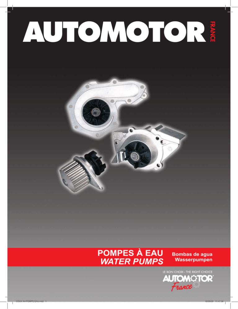 POMPES à EAU WATER PUMPS COUV A4 POMPE EAU.indd 1 Bombas de agua Wasserpumpen 18/09/09 11:47:56 REFERENCE AUTOMOTOR PART NUMBER OE APPLICATIONS / APPLICATIONS EQUIVALENT A / TO Equipement moteur / Engine parts Pompes à eau / Water pumps APPLICATIONS PEUGEOT - CITROEN / CAR APPLICATIONS PEUGEOT - CITROEN AWP0269 (ex 99 02 12 69) PEU 1202 69 PEUGEOT 404 ESS:,NON DEBRAY, 404 CONVENT,COOLING FAN SKF VKPC 83402 504 ESS, AXE COURT 504 ESS SHORT AXLE PEUGEOT AWP0271 (ex 99 02 12 71) PEU 1202 71 504/404 ESS, DEBRAY, axe long 504 ESS, self disengaging cooling fan, long axle AWP0297 (ex 99 02 12 97) PEU 1202 97 VAL 506254 SKF VKPC 83612 PEUGEOT SKF VKPC 83618 504/505 ESS, débrayable, axe long VAL 506122 504/505 ESS, self disengaging cooling fan, long axle AWP0298 (ex 99 02 12 98) PEU 1202 98 PEUGEOT SKF VKPC 83403 505, non Debray, axe court VAL 506121 505, convent cooling , short axle AWP2342 (ex 99 02 12 67) AWP3221 AWP5005 AWP6189 AWP9262 PEU 1201 29 PEU 1202 67 PEU 1202 55 PEUGEOT 305, débrayable 305, self disengaging cooling fan 1,1-1,2-1,4 ESS/GAS (78/87) 1,6 DIESEL (80/83) PEU 120137 PEUGEOT J5 2.5 D (09/81>12/04) CITROEN CX 2.5 GTI ; C25 2.5 D / TD SKF VKPC 83617 PEU 120135 PEUGEOT 505 2.5 D FORD GRANADA / SCORPIO / SIERRA SKF VKPC 83423 PEU 120140 PEUGEOT J5 1.8 ; J5 2.0 CITROEN C25 1.8 ; C25 2.0 SKF VKPC 83630 PEUGEOT 205 1.6 GTI / 1.9i / 1.9 GTI 305 1.9 309 1.9 / 1.9D 405 1.6 CITROEN BX 1.7D / 1.9D VISA 1.6 GTI / 1.7D ZX 1.6 / 1.9 C15 1.7D SKF VKPC 83401 PEU 120139 PEU 120163 3 VAL 506108 REFERENCE AUTOMOTOR PART NUMBER OE APPLICATIONS / APPLICATIONS EQUIVALENT A / TO Equipement moteur / Engine parts Pompes à eau / Water pumps AWP0718 PEU 1207 18 / 1201 E3 PEUGEOT 205/405 SKF VKPC 83205 AWP0628 PEU 1201 38 / 1201 75 PEUGEOT J9 KARSAN VAL 506170 AWP9710 PEU 1201 C4 PEUGEOT 206/306/406 HDI SKF VKPC 83639 AWP5012 PEU 1201 G0 PEUGEOT 206 1.1 ESS SKF VKPC 83644 CIT 0000120161 CITROEN BERLINGO, BX,EVASION, XANTIA, XSARA, ZX (ESS/GAS 1,6-1,8-1,9) PEUGEOT 205/306/309/405/406, PARTNER (ESS/GAS 1,6-1,8-1,9) SKF VKPC 83615 VAL 506 029 AWP9741 APPLICATIONS RENAULT / CAR APPLICATIONS RENAULT RENAULT AWP2493 REN 77 01 457 671 R4 1,1 R5 1,0-1,1-1,3-1,4 R6 1,1 SKF VKPC 86201 AWP2525 REN 77 01 467 223 RENAULT TRAFIC SKF VKPC 86603 AWP5013 REN 77 01 473 327 / 77 01 476 496 RENAULT T.5DCI SKF VKPC 86417 DACIA AWP9689 REN 77 01 478 018 12 4 LOGAN SANDERO (ESS 1,4-1,6) SKF VKPC 86415 REFERENCE AUTOMOTOR PART NUMBER OE APPLICATIONS / APPLICATIONS EQUIVALENT A / TO Equipement moteur / Engine parts Pompes à eau / Water pumps AWP9715 REN 77 00 274 330 / 82 00 428 447/ 82 00 582 675 RENAULT MEGANE ÈSS SKF VKPC 86416 AWP9752 REN 82 00 088 663 / 77 00 864 596 / 82 00 397 735 / 82 00 702 755 RENAULT CLIO 1.2ESS SKF VKPC 86215 AWP9755 REN 77 00 866 518 / 82 00 146 301 RENAULT ENERGY SKF VKPC 86216 AWP9391 REN 77 01 633 125 RENAULT CLIO I 1.4 EXPRESS 1.4 R19 1.2 / 1.4 AWP9491 REN 77 01 465 816 RENAULT CHAMADE, CLIO, LAGUNA, R11/19/21, EXPRESS (ESS/GAS 1,7-1,8-2,0-DIESEL 1,6-1,9) REN 77 01 466 419 AWP9581 5 RENAULT CLIO, R11/19/21 NEVADA, R5 SUPER, R9, EXPRESS (ESS/GAS, 1,1-1,2-1,4 DIESEL 1,1-1,2-1,4) SKF VKPC 86409 SKF VKPC 86413 SKF 86206 VAL 506022 REFERENCE AUTOMOTOR PART NUMBER OE APPLICATIONS / APPLICATIONS EQUIVALENT A / TO Equipement moteur / Engine parts Pompes à eau / Water pumps AUTRES APPLICATIONS / OTHER CAR APPLICATIONS DWP4201 MER 102 200 4301 MERCEDES SERIE W123 (200, 200T, 200BVA, 230E 230CE, 230TE) LEM 113 48 01 MEY 013 026 9001 DWP4301 MER 102 200 4201 MERCEDES SERIE W123 (200, 200T, 230E, 230 CE, 230TE) LEM 108 23 01 MEY 013 026 9000 DWP1741 MER 102 200 05 20 MERCEDES SERIE 124 (200, 200E, 200CE, 200T, 230E, 230TE) LEM 524 269 015 MEY 013 026 9002 DWP2189 MER 110 200 01 20 MERCEDES SERIE W123 (200, 230, 230TE, 230C ; DIESEL : 200D, 220 D, 240 D, 240 TD, 300 D, 300 TD, 300 CD, 300 CD Turbodiesel) SKF VKPC 88807 MEY 013 026 0630 LEM 111 35 01 AWP0502 HYU 25100 02502 6 HYUNDAI ATOS / ATOS PRIME VOTRE DISTRIBUTEUR / YOUR DISTRIBUTOR LE BON CHOIX - THE RIGHT CHOICE 14, Terrasse Bellini - La Défense 11 - 92807 Puteaux Cedex - France Tél. : (33) 1 55 91 05 91 - Fax : (33) 1 55 91 05 40 - Email : [email protected] - www.automotor-france.com LE BON CHOIX - THE RIGHT CHOICE COUV A4 POMPE EAU.indd 2 18/09/09 11:47:58