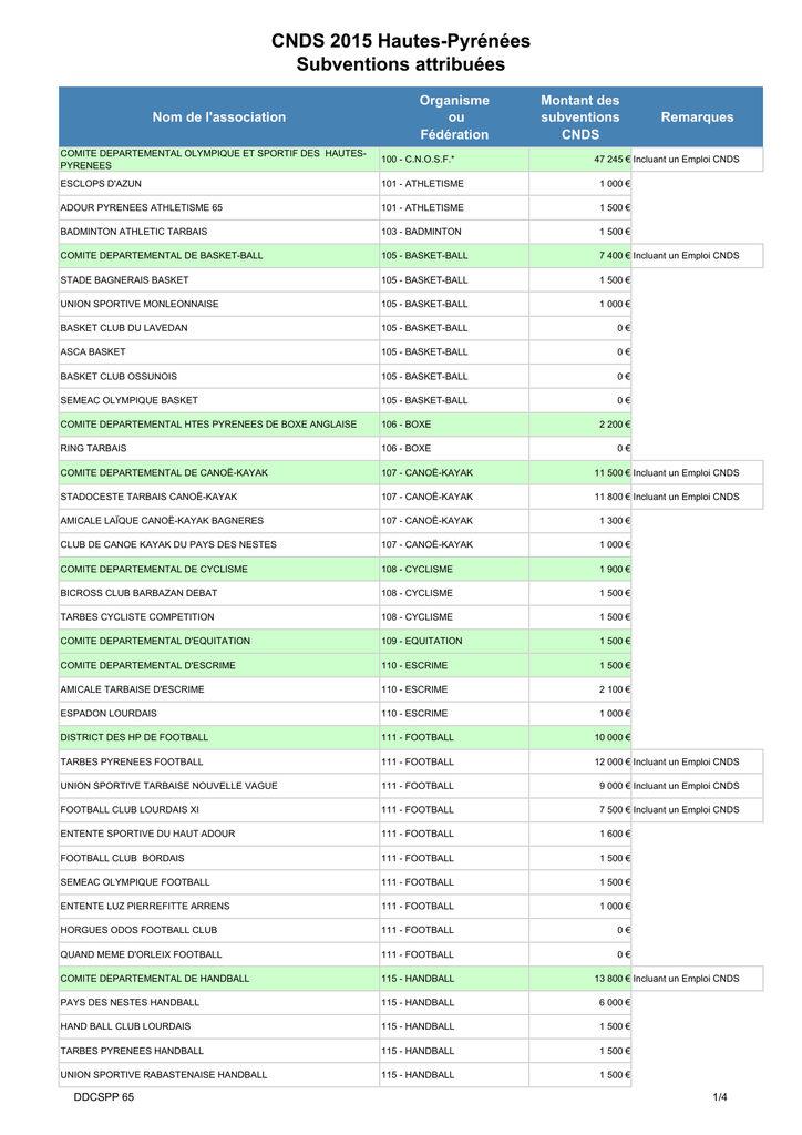 CNDS 2015 Hautes-Pyrénées Subventions attribuées Nom de l'association Organisme ou Fédération Montant des subventions CNDS Remarques COMITE DEPARTEMENTAL OLYMPIQUE ET SPORTIF DES HAUTESPYRENEES 100 - C.N.O.S.F.* ESCLOPS D'AZUN 101 - ATHLETISME 1 000 € ADOUR PYRENEES ATHLETISME 65 101 - ATHLETISME 1 500 € BADMINTON ATHLETIC TARBAIS 103 - BADMINTON 1 500 € COMITE DEPARTEMENTAL DE BASKET-BALL 105 - BASKET-BALL 7 400 € Incluant un Emploi CNDS STADE BAGNERAIS BASKET 105 - BASKET-BALL 1 500 € UNION SPORTIVE MONLEONNAISE 105 - BASKET-BALL 1 000 € BASKET CLUB DU LAVEDAN 105 - BASKET-BALL 0€ ASCA BASKET 105 - BASKET-BALL 0€ BASKET CLUB OSSUNOIS 105 - BASKET-BALL 0€ SEMEAC OLYMPIQUE BASKET 105 - BASKET-BALL 0€ COMITE DEPARTEMENTAL HTES PYRENEES DE BOXE ANGLAISE 106 - BOXE 2 200 € RING TARBAIS 106 - BOXE 0€ COMITE DEPARTEMENTAL DE CANOË-KAYAK 107 - CANOË-KAYAK 11 500 € Incluant un Emploi CNDS STADOCESTE TARBAIS CANOË-KAYAK 107 - CANOË-KAYAK 11 800 € Incluant un Emploi CNDS AMICALE LAÏQUE CANOË-KAYAK BAGNERES 107 - CANOË-KAYAK 1 300 € CLUB DE CANOE KAYAK DU PAYS DES NESTES 107 - CANOË-KAYAK 1 000 € COMITE DEPARTEMENTAL DE CYCLISME 108 - CYCLISME 1 900 € BICROSS CLUB BARBAZAN DEBAT 108 - CYCLISME 1 500 € TARBES CYCLISTE COMPETITION 108 - CYCLISME 1 500 € COMITE DEPARTEMENTAL D'EQUITATION 109 - EQUITATION 1 500 € COMITE DEPARTEMENTAL D'ESCRIME 110 - ESCRIME 1 500 € AMICALE TARBAISE D'ESCRIME 110 - ESCRIME 2 100 € ESPADON LOURDAIS 110 - ESCRIME 1 000 € DISTRICT DES HP DE FOOTBALL 111 - FOOTBALL 10 000 € TARBES PYRENEES FOOTBALL 111 - FOOTBALL 12 000 € Incluant un Emploi CNDS UNION SPORTIVE TARBAISE NOUVELLE VAGUE 111 - FOOTBALL 9 000 € Incluant un Emploi CNDS FOOTBALL CLUB LOURDAIS XI 111 - FOOTBALL 7 500 € Incluant un Emploi CNDS ENTENTE SPORTIVE DU HAUT ADOUR 111 - FOOTBALL 1 600 € FOOTBALL CLUB BORDAIS 111 - FOOTBALL 1 500 € SEMEAC OLYMPIQUE FOOTBALL 111 - FOOTBALL 1 500 € ENTENTE LUZ PIERREFITTE ARRENS 111 - FOOTBALL 1 000 € HORGUES ODOS FOOTBALL CLUB 111 - FOOTBALL 0€ QUAND MEME D'ORLEIX FOOTBALL 111 - FOOTBALL 0€ COMITE DEPARTEMENTAL DE HANDBALL 115 - HANDBALL PAYS DES NESTES HANDBALL 115 - HANDBALL 6 000 € HAND BALL CLUB LOURDAIS 115 - HANDBALL 1 500 € TARBES PYRENEES HANDBALL 115 - HANDBALL 1 500 € UNION SPORTIVE RABASTENAISE HANDBALL 115 - HANDBALL 1 500 € DDCSPP 65 47 245 € Incluant un Emploi CNDS 13 800 € Incluant un Emploi CNDS 1/4 CNDS 2015 Hautes-Pyrénées Subventions attribuées Nom de l'association Organisme ou Fédération Montant des subventions CNDS COMITE DEPARTEMENTAL JUDO H.P 117 - JUDO DOJO LOURDAIS 117 - JUDO 2 800 € STADOCESTE TARBAIS ARTS MARTIAUX JUDO 117 - JUDO 1 500 € JUDOJO LANNEMEZAN 117 - JUDO 1 000 € AUREILHAN JUDO CLUB 117 - JUDO 0€ JUDO ODOS 117 - JUDO 0€ COMITE DEPARTEMENTAL DE LUTTE 118 - LUTTE TARBES PYRENEES LUTTE 118 - LUTTE 1 500 € COMITE DEPARTEMENTAL DE NATATION 119 - NATATION 2 000 € TARBES NAUTIC CLUB 119 - NATATION DAUPHINS DU STADE BAGNERAIS 119 - NATATION 1 800 € ENTENTE PYRENEES SEMEAC TARBES NATATION 119 - NATATION 0€ COMITE DEPARTEMENTAL DE SKI DES HAUTES PYRENEES 121 - SKI 3 100 € SKI CLUB SAINT LARY 121 - SKI 1 600 € SKI TOY 121 - SKI 1 600 € CLUB DES SPORTS LOURDES HAUTACAM 121 - SKI 1 100 € SKI CLUB CAUTERESIEN 121 - SKI 1 100 € SKI CLUB D'AZUN 121 - SKI 1 000 € SKI CLUB PIAU ENGALY 121 - SKI 1 000 € SKI CLUB CAMPAN TOURMALET 121 - SKI 0€ SKI CLUB VAL LOURON 121 - SKI 0€ COMITE DEPARTEMENTAL DE TENNIS DES HAUTES-PYRENEES 123 - TENNIS* 4 000 € MAGNOAC TENNIS CLUB 123 - TENNIS* 8 000 € GESPE TENNIS SPORTS 123 - TENNIS* 1 500 € SEMEAC OLYMPIQUE TENNIS 123 - TENNIS* 1 500 € TENNIS CLUB IBOS 123 - TENNIS* 1 500 € TENNIS CLUB JEUNESSE SPORTIVE ODOSSÉENNE 123 - TENNIS* 1 500 € TENNIS CLUB VICQUOIS 123 - TENNIS* 1 500 € TENNIS UNION ATHLETIQUE TARBES 123 - TENNIS* 1 500 € TENNIS CLUB DE LA NESTE 123 - TENNIS* 1 000 € TENNIS CLUB DE SAINT LARY 123 - TENNIS* 1 000 € TENNIS CLUB DU LAVEDAN 123 - TENNIS* 1 000 € TENNIS CLUB LOURDAIS 123 - TENNIS* 1 000 € TENNIS SQUASH LES PEUPLIERS 123 - TENNIS* 1 000 € TENNIS TOY 123 - TENNIS* 1 000 € TENNIS CLUB DE BAGNERES 123 - TENNIS* 0€ TENNIS COMPETITION LOISIR 123 - TENNIS* 0€ DDCSPP 65 Remarques 15 300 € Incluant un Emploi CNDS 14 300 € Incluant un Emploi CNDS 12 850 € Incluant Emplois CNDS 2/4 CNDS 2015 Hautes-Pyrénées Subventions attribuées Nom de l'association Organisme ou Fédération Montant des subventions CNDS COMITE DEPARTEMENTAL DES HAUTES PYRENEES DE TENNIS DE TABLE 124 - TENNIS DE TABLE* 2 000 € ETOILE SPORTIVE POUZACAISE 124 - TENNIS DE TABLE* 1 000 € TARBES-ODOS PYRENEES TENNIS DE TABLE (TOP T.T) 124 - TENNIS DE TABLE* 0€ COMITE DEPARTEMENTAL DE TIR A L'ARC 126 - TIR A L'ARC 1 500 € LES ARCHERS DE BIGORRE 126 - TIR A L'ARC 1 500 € LES ARCHERS BANDOULIERS 126 - TIR A L'ARC 1 000 € COMITE DEPARTEMENTAL DE VOLLEY-BALL 129 - VOLLEY-BALL IBOS VOLLEY 129 - VOLLEY-BALL 1 500 € TARBES ODOS PYRENEES VOLLEY BALL 129 - VOLLEY-BALL 1 500 € VOLLEY BALL LOURDAIS 129 - VOLLEY-BALL 1 000 € AERO CLUB DE BIGORRE 202 - AERONAUTIQUE 0€ COMITE BOULISTE DEPARTEMENTAL DES HP 211 - SPORT BOULES 3 000 € COMITE DEPARTEMENTAL DE CYCLOTOURISME 218 - CYCLOTOURISME 1 500 € ASSOCIATION DES CYCLOTOURISTES DU MADIRANAIS 218 - CYCLOTOURISME 0€ COMITE DEPARTEMENTAL DE DANSE 219 - DANSE 0€ COMITE DEPARTEMENTAL DU JEU D'ECHECS DES HP 220 - ECHECS CLUB LAMAILHERK TARBAIS CLUB SUBAQUATIQUE TARBAIS 221 - ETUDES et SPORTS SOUSMARINS 221 - ETUDES et SPORTS SOUSMARINS Remarques 14 700 € Incluant un Emploi CNDS 8 700 € Incluant un Emploi CNDS 1 500 € 0€ COMITE DEPARTEMENTAL DE GOLF DES HP 225 - GOLF 2 300 € NOUVELLE ASSOCIATION GOLF DE LANNEMEZAN 225 - GOLF 2 200 € COMITE DEPARTEMENTAL DE KARATE 229 - KARATE 3 000 € TARBES GEIJUTSU KARATE 229 - KARATE 2 200 € ECOLE DE KARATE-DO DE LA BAROUSSE (EKDB) 229 - KARATE 1 000 € SHOTOKAN KARATE 