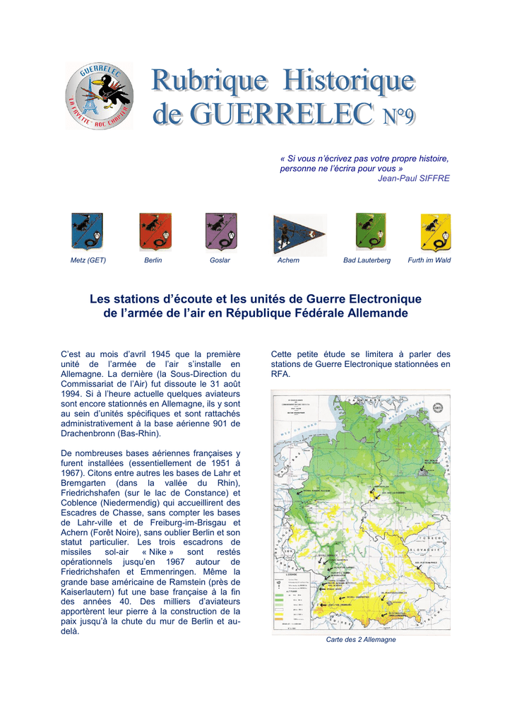 « Si vous n’écrivez pas votre propre histoire, personne ne l’écrira pour vous » Jean-Paul SIFFRE Metz (GET) Berlin Goslar Achern Bad Lauterberg Furth im Wald Les stations d’écoute et les unités de Guerre Electronique de l’armée de l’air en République Fédérale Allemande C’est au mois d’avril 1945 que la première unité de l’armée de l’air s’installe en Allemagne. La dernière (la Sous-Direction du Commissariat de l’Air) fut dissoute le 31 août 1994. Si à l’heure actuelle quelques aviateurs sont encore stationnés en Allemagne, ils y sont au sein d’unités spécifiques et sont rattachés administrativement à la base aérienne 901 de Drachenbronn (Bas-Rhin). Cette petite étude se limitera à parler des stations de Guerre Electronique stationnées en RFA. De nombreuses bases aériennes françaises y furent installées (essentiellement de 1951 à 1967). Citons entre autres les bases de Lahr et Bremgarten (dans la vallée du Rhin), Friedrichshafen (sur le lac de Constance) et Coblence (Niedermendig) qui accueillirent des Escadres de Chasse, sans compter les bases de Lahr-ville et de Freiburg-im-Brisgau et Achern (Forêt Noire), sans oublier Berlin et son statut particulier. Les trois escadrons de missiles sol-air « Nike » sont restés opérationnels jusqu’en 1967 autour de Friedrichshafen et Emmenringen. Même la grande base américaine de Ramstein (près de Kaiserlautern) fut une base française à la fin des années 40. Des milliers d’aviateurs apportèrent leur pierre à la construction de la paix jusqu’à la chute du mur de Berlin et audelà. Carte des 2 Allemagne La Guerre Electronique Les origines de la GE Air en Allemagne se confondent avec l’histoire du site aéronautique er de Fribourg où fut créée le 1 septembre 1951 la compagnie de moyens généraux 817 qui avait, entre autres missions, l’administration de l’Escadron de Guerre Electronique EGE 31.813, rattaché au Groupement Tactique des ème Transmissions GTT 00.813. La 54 Escadre er Electronique Tactique (EET), créée le 1 janvier 1988 et stationnée sur la base aérienne 128 de Metz, trouve ses racines dans l’EGE 30.813. Fonctionnellement rattachée à la 54 EET, les unités de GE oeuvrant en Allemagne devinrent respectivement : . Escadron Electronique Sol 02.054 de Berlin . Escadron Electronique Sol 03.054 de Goslar . Escadron Electronique Sol 04.054 de Achern . Escadron Electronique Sol 06.054 de Bad Lauterberg . Escadron Electronique Sol 07.054 de Furth im Wald ainsi que . Détachement Electronique 08.054 de Baden-Oos . Détachement Electronique 09.054 de Fürstenfeldbruck. er Appelées les « sonnettes d’alarme » du 1 CATac puis de la FATac, ces unités spécialisées avaient pour missions : de bombardement automatique sans visibilité (Knickebein, plot n°22, indicatif Hermes-Y) et par une station radar équipée de 2 radars Freya-Egon. Cette station permit à l’aviation allemande d’effectuer des bombardements précis alors que les pilotes n’avaient pas la vue du sol. De nombreux objectifs furent détruits et notamment la ville de Coventry qui fut presque entièrement rasée le 14 novembre 1940. Au mois d’avril 1945, lors de l’avancée de la ère 1 Armée française, venant de Karlsruhe, les Tabors s’emparèrent du Hornisgrinde. L’armée de l’air installa aussitôt un goniomètre ; le personnel fut hébergé dans l’hôtel réquisitionné sur le site. Après le grand incendie qui ravagea une partie du Hornisgrinde au mois de mai 1945, le détachement de l’armée de l’air prit ses quartiers dans l’hôtel Mummelsee (hôtel qui ème servait pendant la 2 GM de centre de repos pour les pilotes de la Luftwaffe), en contrebas, où il poursuivit sa mission jusqu’en 1947. Fut alors créé le Centre de Contrôle aérien 2.72 qui prit l’indicatif « Boxcar » et travaillait en triangulation avec les goniomètres du Feldberg, de Friedrichshafen, du Kaiserstuhl et du Hornisgrinde. L’indicatif « Foreno » (Forêt Noire) fut attribué à Hornisgrinde en 1949. Le secteur, dissous en 1961, fut remplacé par le Centre de Contrôle 22.904 dont la mission était le guidage sous contrôle radar de patrouilles aériennes en bombardement aveugle ; le point haut prit alors l’appellation de base aérienne 904. En 1963, le centre fut dissous et l’escadron électronique 40.450 fut créé. . Le recueil et la diffusion du renseignement d’origine électromagnétique relatif aux Forces Aériennes du Pacte de Varsovie (MRE) . La mise en œuvre de contre-mesures électroniques d’appui des forces aériennes offensives (CME) . L’instruction en matière de Guerre Electronique dans le cadre des exercices planifiés (MPE). Plusieurs missions furent dévolues à ce centre : - Le centre d’interception (des émissions HF) occupait un ouvrage en béton semi enterré appelé le « sousmarin ». ACHERN et son point haut, le Hornisgrinde Unité du 1 CATac, l’escadron recevait les orientations de GE et de transmissions du Centre de Détection et de Contrôle Secteur tactique de Drachenbronn : Avant la seconde guerre mondiale, le site de Hornisgrinde était un lieu touristique avec un Hôtel-Gasthaus. La tour de pierre, construite en 1910, servait vraisemblablement d’observatoire de la vallée du Rhin. Pendant la guerre, le site était occupé par des batteries de défense aérienne dont il reste quelques vestiges, par une station de guidage - Le centre de contre-mesures actives fut placé dans des cabines portées par des camions GMC. er - Campagnes de brouillage et intrusion au profit des escadres de combat, organismes de contrôle et de détection, opérateurs de réseaux de er commandement du 1 CATac Rubrique Historique – Novembre/Décembre 2006 2 Secours des moyens de transmissions de Drachenbronn. - La mission de l’escadron évolua en octobre 1971 avec la mission de recueil de renseignement des émissions travaillant en graphie. Elle devint la mission 