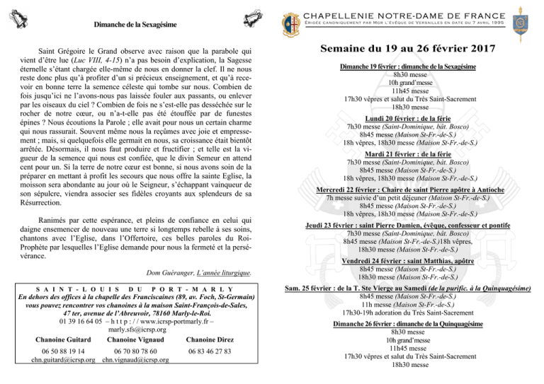 C H A P E L L E N I E N O T R E - DA M E D E F R A N C E É r i g é e c a n o n i q u e m e n t p a r M g r l ’ é v ê q u e d e V e r s a i l l e s e n d a t e d u 7 av r i l 19 9 5 Dimanche de la Sexagésime Saint Grégoire le Grand observe avec raison que la parabole qui vient d’être lue (Luc VIII, 4-15) n’a pas besoin d’explication, la Sagesse éternelle s’étant chargée elle-même de nous en donner la clef. Il ne nous reste donc plus qu’à profiter d’un si précieux enseignement, et qu’à recevoir en bonne terre la semence céleste qui tombe sur nous. Combien de fois jusqu’ici ne l’avons-nous pas laissée fouler aux passants, ou enlever par les oiseaux du ciel ? Combien de fois ne s’est-elle pas desséchée sur le rocher de notre cœur, ou n’a-t-elle pas été étouffée par de funestes épines ? Nous écoutions la Parole ; elle avait pour nous un certain charme qui nous rassurait. Souvent même nous la reçûmes avec joie et empressement ; mais, si quelquefois elle germait en nous, sa croissance était bientôt arrêtée. Désormais, il nous faut produire et fructifier ; et telle est la vigueur de la semence qui nous est confiée, que le divin Semeur en attend cent pour un. Si la terre de notre cœur est bonne, si nous avons soin de la préparer en mettant à profit les secours que nous offre la sainte Eglise, la moisson sera abondante au jour où le Seigneur, s’échappant vainqueur de son sépulcre, viendra associer ses fidèles croyants aux splendeurs de sa Résurrection. Ranimés par cette espérance, et pleins de confiance en celui qui daigne ensemencer de nouveau une terre si longtemps rebelle à ses soins, chantons avec l’Eglise, dans l’Offertoire, ces belles paroles du RoiProphète par lesquelles l’Eglise demande pour nous la fermeté et la persévérance. Dom Guéranger, L’année liturgique. S A I N T - L O U I S D U P O R T - M A R L Y En dehors des offices à la chapelle des Franciscaines (89, av. Foch, St-Germain) vous pouvez rencontrer vos chanoines à la maison Saint-François-de-Sales, 47 ter, avenue de l’Abreuvoir, 78160 Marly-le-Roi. 01 39 16 64 05 – h t t p : / / www.icrsp-portmarly.fr – [email protected] Chanoine Guitard Chanoine Vignaud Chanoine Direz 06 50 88 19 14 06 70 80 78 60 [email protected] [email protected] 06 83 46 27 83 Semaine du 19 au 26 février 2017 Dimanche 19 février : dimanche de la Sexagésime 8h30 messe 10h grand’messe 11h45 messe 17h30 vêpres et salut du Très Saint-Sacrement 18h30 messe Lundi 20 février : de la férie 7h30 messe (Saint-Dominique, bât. Bosco) 8h45 messe (Maison St-Fr.-de-S.) 18h vêpres, 18h30 messe (Maison St-Fr.-de-S.) Mardi 21 février : de la férie 7h30 messe (Saint-Dominique, bât. Bosco) 8h45 messe (Maison St-Fr.-de-S.) 18h vêpres, 18h30 messe (Maison St-Fr.-de-S.) Mercredi 22 février : Chaire de saint Pierre apôtre à Antioche 7h messe suivie d’un petit déjeuner (Maison St-Fr.-de-S.) 8h45 messe (Maison St-Fr.-de-S.) 18h vêpres, 18h30 messe (Maison St-Fr.-de-S.) Jeudi 23 février : saint Pierre Damien, évêque, confesseur et pontife 7h30 messe (Saint-Dominique, bât. Bosco) 8h45 messe (Maison St-Fr.-de-S.)18h vêpres, 18h30 messe (Maison St-Fr.-de-S.) Vendredi 24 février : saint Matthias, apôtre 8h45 messe (Maison St-Fr.-de-S.) 18h30 messe (Maison St-Fr.-de-S.) Sam. 25 février : de la T. Ste Vierge au Samedi (de la purific. à la Quinquagésime) 8h45 messe (Maison St-Fr.-de-S.) 11h messe (Maison St-Fr.-de-S.) 17h30-19h adoration du Très Saint-Sacrement Dimanche 26 février : dimanche de la Quinquagésime 8h30 messe 10h grand’messe 11h45 messe 17h30 vêpres et salut du Très Saint-Sacrement 18h30 messe C HANTS Messe de 10h Aspérges me I, page 45 Kyriale XI A, page 62 Credo I, page 73 Sortie : Victoire, tu règneras, p. 130 N OS Messe de 11h45 Kyriale XI A, page 62 Credo I, page 73 Comm. : Lauda Sion, p. 168 Sortie : Victoire, tu règneras, p. 130 JOIES ET NOS PEINES B APTÊME Espérance Miquel Lundi 20 février SOIRÉE DE LA SAINTE FAMILLE À la Maison Saint-François-de-Sales Messe à 18h30 ; chapelet Dîner à 19h30 suivi d’un film. Rens. : Marie-Claude du Boullay 06 77 75 29 00 [email protected] Mardi 21 février à 20h COURS DE FORMATION POUR ÉTUDIANTS ET JEUNES PROFESSIONNELS à 20h à Paris « Pour mieux comprendre Vatican II » (suite) Page facebook : « les étudiants de la Chapellenie » Samedi 25 février RÉUNION DE PRÉPARATION À LA CONFIRMATION de 9h30 à 10h30 (St-Fr.-de-S.) Réunion suivante le 4 mars. Dimanche 26 février « RETOUR DES RAMEAUX » Les rameaux que vous pourrez déposer dimanche prochain, C ONFESSIONS samedi de 17h30 à 19h (chapelle des Franciscaines) Le chanoine se tient à votre disposition après les messes. PROCHAINES DATES À RETENIR 9 mars : récollection pour les dames 18 mars : sortie des enfants de chœur 25 mars : récollection pour tous 25 mars : dîner de la Chapellenie PÈLERINAGE À FATIMA AVEC L’INSTITUT du 2 au 4 novembre 2017 : 455 € du 31 octobre au 4 novembre : 595 € (visite de Lisbonne et Coimbra, avant de rejoindre le pèlerinage à Fatima). - S’inscrire en ligne : www.odeia.fr <http://www.odeia.fr/>. Aller dans la rubrique Espace dédié et entrer le mot de passe (2 fois) ICRSP. - par bulletin à renvoyer à l’agence Odeia (disponible au fond de l’église). (plus les réservations seront rapides, plus les tarifs seront intéressants) Renseignements : [email protected] P ETITES ANNONCES Je cherche à former en stage (dans le cadre d’une formation universitaire type licence, master d’histoire ou de droit, BTS secrétariat), ou en CDD, un(e) jeune qui désirerait se lancer dans la généalogie successorale. La volonté de cette annonce serait de garder la personne par la suite. Le poste serait basé sur Charnay-lès-Mâcon (71850), mais nécessiterait des déplacements. Ce type de poste conviendrait parfaitement à une personne domiciliée entre, DIJON et LYON, voir au-delà en fonction 