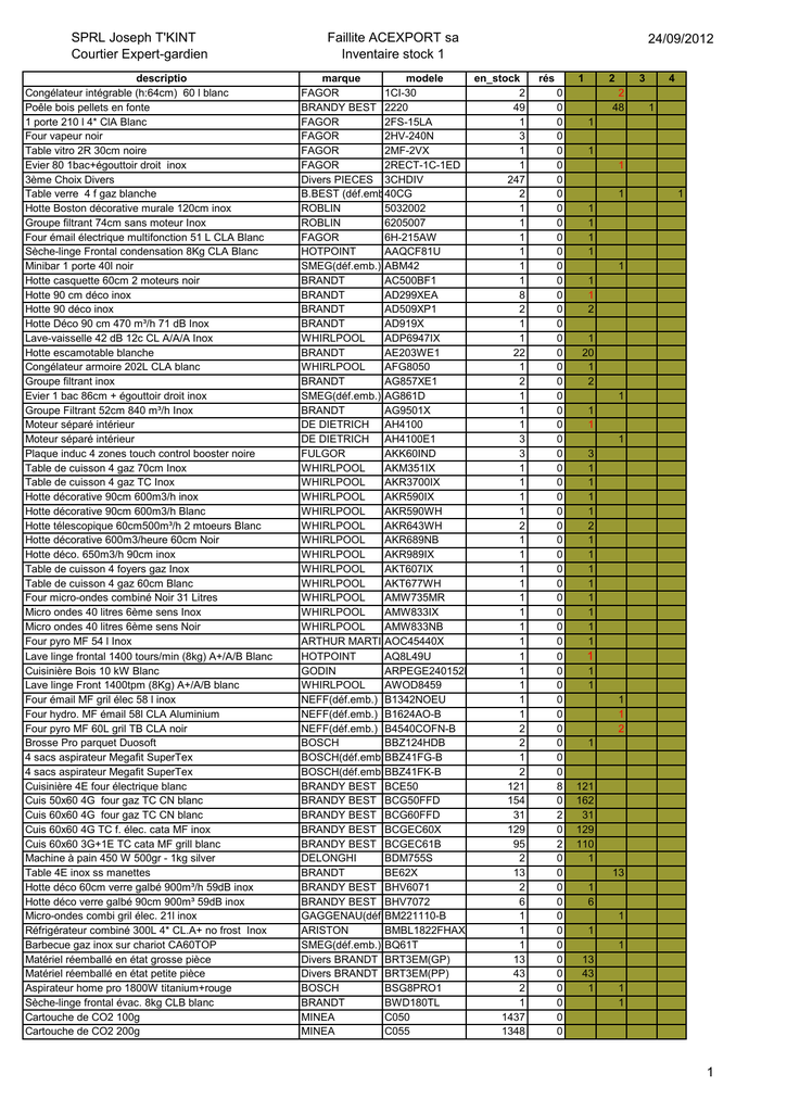 SPRL Joseph T'KINT Courtier Expert-gardien descriptio Congélateur intégrable (h:64cm) 60 l blanc Poêle bois pellets en fonte 1 porte 210 l 4* ClA Blanc Four vapeur noir Table vitro 2R 30cm noire Evier 80 1bac+égouttoir droit inox 3ème Choix Divers Table verre 4 f gaz blanche Hotte Boston décorative murale 120cm inox Groupe filtrant 74cm sans moteur Inox Four émail électrique multifonction 51 L CLA Blanc Sèche-linge Frontal condensation 8Kg CLA Blanc Minibar 1 porte 40l noir Hotte casquette 60cm 2 moteurs noir Hotte 90 cm déco inox Hotte 90 déco inox Hotte Déco 90 cm 470 m³/h 71 dB Inox Lave-vaisselle 42 dB 12c CL A/A/A Inox Hotte escamotable blanche Congélateur armoire 202L CLA blanc Groupe filtrant inox Evier 1 bac 86cm + égouttoir droit inox Groupe Filtrant 52cm 840 m³/h Inox Moteur séparé intérieur Moteur séparé intérieur Plaque induc 4 zones touch control booster noire Table de cuisson 4 gaz 70cm Inox Table de cuisson 4 gaz TC Inox Hotte décorative 90cm 600m3/h inox Hotte décorative 90cm 600m3/h Blanc Hotte télescopique 60cm500m³/h 2 mtoeurs Blanc Hotte décorative 600m3/heure 60cm Noir Hotte déco. 650m3/h 90cm inox Table de cuisson 4 foyers gaz Inox Table de cuisson 4 gaz 60cm Blanc Four micro-ondes combiné Noir 31 Litres Micro ondes 40 litres 6ème sens Inox Micro ondes 40 litres 6ème sens Noir Four pyro MF 54 l Inox Lave linge frontal 1400 tours/min (8kg) A+/A/B Blanc Cuisinière Bois 10 kW Blanc Lave linge Front 1400tpm (8Kg) A+/A/B blanc Four émail MF gril élec 58 l inox Four hydro. MF émail 58l CLA Aluminium Four pyro MF 60L gril TB CLA noir Brosse Pro parquet Duosoft 4 sacs aspirateur Megafit SuperTex 4 sacs aspirateur Megafit SuperTex Cuisinière 4E four électrique blanc Cuis 50x60 4G four gaz TC CN blanc Cuis 60x60 4G four gaz TC CN blanc Cuis 60x60 4G TC f. élec. cata MF inox Cuis 60x60 3G+1E TC cata MF grill blanc Machine à pain 450 W 500gr - 1kg silver Table 4E inox ss manettes Hotte déco 60cm verre galbé 900m³/h 59dB inox Hotte déco verre galbé 90cm 900m³ 59dB inox Micro-ondes combi gril élec. 21l inox Réfrigérateur combiné 300L 4* CL.A+ no frost Inox Barbecue gaz inox sur chariot CA60TOP Matériel réemballé en état grosse pièce Matériel réemballé en état petite pièce Aspirateur home pro 1800W titanium+rouge Sèche-linge frontal évac. 8kg CLB blanc Cartouche de CO2 100g Cartouche de CO2 200g Faillite ACEXPORT sa Inventaire stock 1 marque modele en_stock FAGOR 1CI-30 2 BRANDY BEST 2220 49 FAGOR 2FS-15LA 1 FAGOR 2HV-240N 3 FAGOR 2MF-2VX 1 FAGOR 2RECT-1C-1ED 1 Divers PIECES 3CHDIV 247 B.BEST (déf.emb.) 40CG 2 ROBLIN 5032002 1 ROBLIN 6205007 1 FAGOR 6H-215AW 1 HOTPOINT AAQCF81U 1 SMEG(déf.emb.) ABM42 1 BRANDT AC500BF1 1 BRANDT AD299XEA 8 BRANDT AD509XP1 2 BRANDT AD919X 1 WHIRLPOOL ADP6947IX 1 BRANDT AE203WE1 22 WHIRLPOOL AFG8050 1 BRANDT AG857XE1 2 SMEG(déf.emb.) AG861D 1 BRANDT AG9501X 1 DE DIETRICH AH4100 1 DE DIETRICH AH4100E1 3 FULGOR AKK60IND 3 WHIRLPOOL AKM351IX 1 WHIRLPOOL AKR3700IX 1 WHIRLPOOL AKR590IX 1 WHIRLPOOL AKR590WH 1 WHIRLPOOL AKR643WH 2 WHIRLPOOL AKR689NB 1 WHIRLPOOL AKR989IX 1 WHIRLPOOL AKT607IX 1 WHIRLPOOL AKT677WH 1 WHIRLPOOL AMW735MR 1 WHIRLPOOL AMW833IX 1 WHIRLPOOL AMW833NB 1 ARTHUR MARTINAOC45440X 1 HOTPOINT AQ8L49U 1 GODIN ARPEGE240152BL 1 WHIRLPOOL AWOD8459 1 NEFF(déf.emb.) B1342NOEU 1 NEFF(déf.emb.) B1624AO-B 1 NEFF(déf.emb.) B4540COFN-B 2 BOSCH BBZ124HDB 2 BOSCH(déf.emb.)BBZ41FG-B 1 BOSCH(déf.emb.)BBZ41FK-B 2 BRANDY BEST BCE50 121 BRANDY BEST BCG50FFD 154 BRANDY BEST BCG60FFD 31 BRANDY BEST BCGEC60X 129 BRANDY BEST BCGEC61B 95 DELONGHI BDM755S 2 BRANDT BE62X 13 BRANDY BEST BHV6071 2 BRANDY BEST BHV7072 6 GAGGENAU(déf.emb.) BM221110-B 1 ARISTON BMBL1822FHAX 1 SMEG(déf.emb.) BQ61T 1 Divers BRANDT BRT3EM(GP) 13 Divers BRANDT BRT3EM(PP) 43 BOSCH BSG8PRO1 2 BRANDT BWD180TL 1 MINEA C050 1437 MINEA C055 1348 24/09/2012 rés 1 0 0 0 0 0 0 0 0 0 0 0 0 0 0 0 0 0 0 0 0 0 0 0 0 0 0 0 0 0 0 0 0 0 0 0 0 0 0 0 0 0 0 0 0 0 0 0 0 8 0 2 0 2 0 0 0 0 0 0 0 0 0 0 0 0 0 2 3 2 48 4 1 1 1 1 1 1 1 1 1 1 1 1 1 2 1 20 1 2 1 1 1 1 3 1 1 1 1 2 1 1 1 1 1 1 1 1 1 1 1 1 1 2 1 121 162 31 129 110 1 13 1 6 1 1 1 13 43 1 1 1 1 SPRL Joseph T'KINT Courtier Expert-gardien Faillite ACEXPORT sa Inventaire stock 1 Lave vaisselle 12 couverts 49dB A/A/A blanc LADEN C1009BL Réfrigérateur combiné 284 L CLA+ Blanc BRANDT C28710 1 porte 275l tt utile CLA blanc BRANDY BEST C290-1704A M.O. Innowave 1000W 36l Noir pesée auto. NEFF C57W40S0 M.O. Innowave 1000W 36l Blanc pesée auto. NEFF C57W40W0 Couv. Bellini noir pr plaque de cuisson 90cm SMEG(déf.emb.) C90CNE Hotte 90 cm déco inox ASPES CA490X Chariot 90cm Inox brossé pour barbecue SMEG(déf.emb.) CA90TOP Chariot 90cm Inox SMEG(déf.emb.) CA91S Cave à cigares 200 pièces Brun/bois MINEA CAG1 Poêle 9kW bois BRANDY BEST CAPRI Hotte casq. 60 fitre charb. 300m3/h blanc TEKA CC60 Cave à vin 330l brun porte verre anti-UV BRANDY BEST CD350-0311 MO combi 37L Gril Steam clean Leds Argenté SAMSUNG CE137NEM-S Micro ondes combiné 32 litres silver BRANDT CE3252S Cuis 6G 90cm 2f élec MF pyro TC CLA inox SMEG(déf.emb.) CE92GPX Lave-vaisselle 55dB 12c. A/A/A blanc CANDY CED110 Cuis. mixte 3G+1E four émail MF gril blanc FAGOR(def.asp.)CFF-931M Cuisinière mixte 50*60 3G+1E catalyse blanche FAGOR CFF1521A Hotte 90 déco murale orange FAGOR CFT-90YO Cuis 50x60 4G four gaz TC CN blanc ROXWEL CG50FFD Cuis 60x90 5G four gaz TC CN inox ROXWEL CG90TBX Table vitro 4R noir BRANDT CH600CM Cafetière à l'Italienne 400W sans fil inox BRANDT CI-B30PX Congélateur int. (h:54cm) CLC FAGOR CIV40 Table vitro 4R sensit. Brun INDESIT CK-04SBR Table vitro ss manettes 4R sensit. blanc INDESIT CK-64S(WH) Seche linge évacuation 6kg CLC Blanc WHITE KNIGHT CL446 Coupe veille TV et périphériques Coxiwatt MO combi 36L Gril Steam clean Leds Crust Blanc SAMSUNG CP1370EWX/XEN Poêle 9kW bois BRANDY BEST CREMONA Cuis. 6G 120cm 2 f. élect. cata MF TC TB PF CLA/B inox SMEG(déf.emb.) CS120-6 Panier d'évier rect