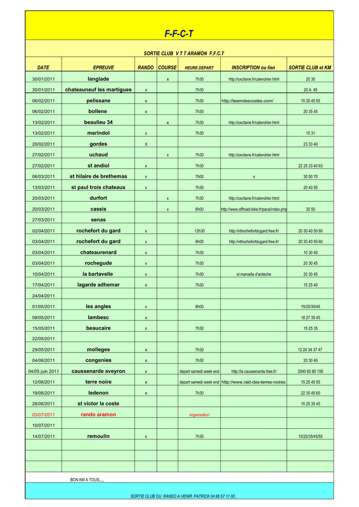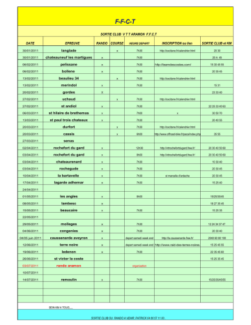 CALENDRIER RANDOS F-F-C-T SORTIE CLUB V T T ARAMON F.F.C.T DATE EPREUVE RANDO COURSE HEURE DEPART INSCRIPTION ou lien SORTIE CLUB et KM 7h30 http://oxcitane.fr/calendrier.html 20 30 30/01/2011 langlade 30/01/2011 chateauneuf les martigues x 7h30 06/02/2011 pelissane x 7h30 06/02/2011 bollene x 7h30 13/02/2011 beaulieu 34 13/02/2011 merindol x 20/02/2011 gordes X 27/02/2011 uchaud 27/02/2011 st andiol x 7h30 06/03/2011 st hilaire de brethemas x 7h00 13/03/2011 st paul trois chateaux x 7h30 20/03/2011 durfort x 7h30 http://oxcitane.fr/calendrier.html 20/03/2011 cassis x 6h00 http://www.offroad-bike.fr/paca/index.php 35 55 27/03/2011 senas 02/04/2011 rochefort du gard x 12h30 http://vttrochefortdugard.free.fr/ 20 30 40 50 60 03/04/2011 rochefort du gard x 8h00 http://vttrochefortdugard.free.fr/ 20 30 40 50 60 03/04/2011 chateaurenard x 7h30 10 30 40 03/04/2011 rochegude x 7h30 20 30 45 10/04/2011 la bartavelle x 7h30 17/04/2011 lagarde adhemar x 7h30 15 25 40 01/05/2011 les angles x 8h00 15/25/35/45 08/05/2011 lambesc x 15/05/2011 beaucaire x 7h30 15 25 35 29/05/2011 molleges x 7h30 12 24 34 37 47 04/06/2011 congenies x 7h30 20 30 40 04/05 juin 2011 caussenarde aveyron x depart samedi week end 12/06/2011 terre noire x depart samedi week end http://www.raid-des-terres-noires.com/ 19/06/2011 ledenon x 26/06/2011 st victor la coste 03/07/2011 rando aramon x x 7h30 20 A 45 http://teamdescostes.com/ 15 30 45 55 20 35 45 http://oxcitane.fr/calendrier.html 7h30 15 31 23 33 40 x 7h30 http://oxcitane.fr/calendrier.html 22 25 33 40 63 x 30 50 70 20 40 55 st marcelle d'ardeche 20 30 45 24/04/2011 18 27 35 45 22/05/2011 http://la.caussenarde.free.fr/ 7h30 2040 60 80 100 15 25 45 55 22 35 45 60 15 25 35 45 organisation 10/07/2011 14/07/2011 remoulin x 7h30 BON KM A TOUS,,,,, SORTIE CLUB OU RANDO A VENIR. PATRICK 04 66 57 11 00 , 15/25/35/45/55