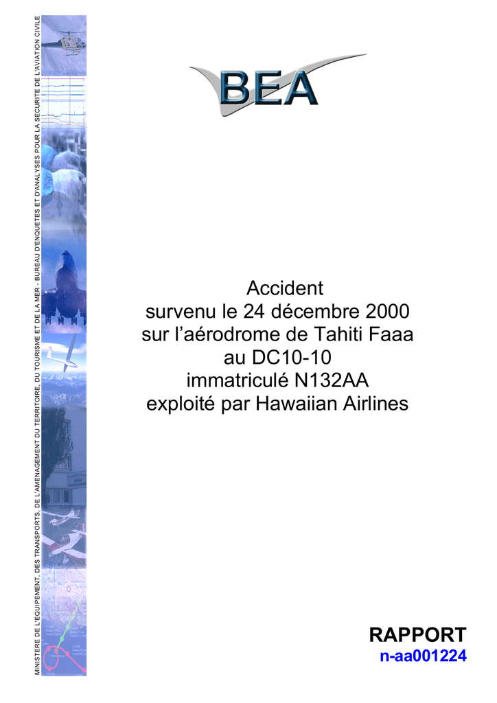 MINISTERE DE L'EQUIPEMENT, DES TRANSPORTS, DE L’AMENAGEMENT DU TERRITOIRE, DU TOURISME ET DE LA MER - BUREAU D'ENQUETES ET D'ANALYSES POUR LA SECURITE DE L'AVIATION CIVILE Accident survenu le 24 décembre 2000 sur l’aérodrome de Tahiti Faaa au DC10-10 immatriculé N132AA exploité par Hawaiian Airlines RAPPORT n-aa001224 AVERTISSEMENT Ce rapport exprime les conclusions du BEA sur les circonstances et les causes de cet accident. Conformément à l'Annexe 13 à la Convention relative à l'aviation civile internationale, à la Directive 94/56/CE et au Code de l’Aviation Civile (Livre VII), l'enquête n'est pas conduite de façon à établir des fautes ou à évaluer des responsabilités individuelles ou collectives. Son seul objectif est de tirer de cet événement des enseignements susceptibles de prévenir de futurs accidents. En conséquence, l'utilisation de ce rapport à d'autres fins que la prévention pourrait conduire à des interprétations erronées. N132AA – 24 décembre 2000 -2- Table des matières AVERTISSEMENT................................................................................................. 2 GLOSSAIRE .......................................................................................................... 6 SYNOPSIS ............................................................................................................. 7 ORGANISATION DE L'ENQUETE ........................................................................ 8 1 - RENSEIGNEMENTS DE BASE........................................................................ 9 1.1 Déroulement du vol ........................................................................................ 9 1.2 Tués et blessés............................................................................................. 10 1.3 Dommages à l'aéronef ................................................................................. 10 1.4 Autres dommages ........................................................................................ 10 1.5 Renseignements sur le personnel .............................................................. 10 1.5.1 Commandant de bord .............................................................................. 10 1.5.2 Copilote.................................................................................................... 11 1.5.3 Mécanicien navigant ................................................................................ 11 1.6 Renseignements sur l'aéronef .................................................................... 12 1.6.1 Cellule...................................................................................................... 12 1.6.2 Moteurs.................................................................................................... 12 1.7 Conditions météorologiques....................................................................... 12 1.7.1 Situation générale .................................................................................... 12 1.7.2 Prévisions fournies à l’équipage .............................................................. 13 1.7.3 Conditions météorologiques sur Faaa lors de l’atterrissage .................... 13 1.8 Aides à la navigation.................................................................................... 16 1.9 Télécommunications.................................................................................... 16 1.10 Renseignements sur l'aérodrome............................................................. 17 1.10.1 Caractéristiques ..................................................................................... 17 1.10.2 Documentation à bord............................................................................ 18 1.10.3 Balisage lumineux.................................................................................. 18 1.10.4 Etat de surface de la piste ..................................................................... 19 N132AA – 24 décembre 2000 -3- 1.11 Enregistreurs de bord ................................................................................ 19 1.11.1 Types et opérations de lecture............................................................... 19 1.11.2 Exploitation de l’enregistreur de paramètres.......................................... 20 1.11.3 Exploitation de l’enregistrement phonique ............................................. 22 1.12 Renseignements sur l'épave et sur l'impact ............................................ 22 1.13 Renseignements médicaux et pathologiques.......................................... 23 1.14 Incendie....................................................................................................... 23 1.15 Questions relatives à la survie des occupants........................................ 24 1.16 Essais et recherches.................................................................................. 25 1.16.1 Trajectoire de l’avion sur la piste ........................................................... 25 1.16.2 Piste mouillée et vent traversier ............................................................. 27 1.16.3 Examen des pneumatiques ................................................................... 27 1.16.4 Destructeurs de portance....................................................................... 27 1.16.5 Examen des gilets de sauvetage ........................................................... 28 1.16.6 GFMS .................................................................................................... 29 1.17 Renseignements sur les organismes et la gestion ................................. 29 1.17.1 Préparation du vol.................................................................................. 29 1.17.2 Procédure vent traversier....................................................................... 29 1.17.3 Procédure par vent traversier et piste mouillée..............