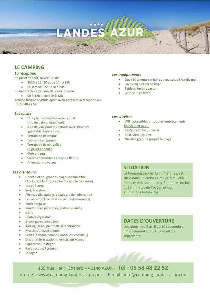 SITUATION LE CAMPING DATES D`OUVERTURE