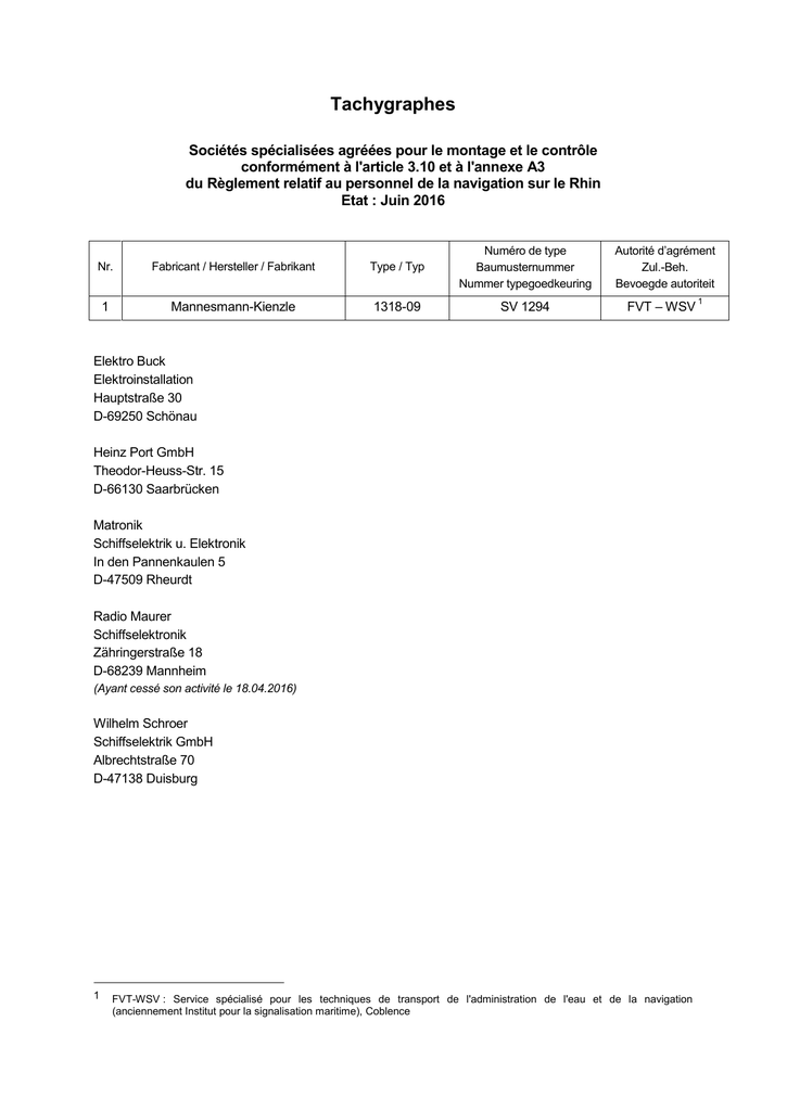 Tachygraphes Sociétés spécialisées agréées pour le montage et le contrôle conformément à l'article 3.10 et à l'annexe A3 du Règlement relatif au personnel de la navigation sur le Rhin Etat : Juin 2016 Nr. Fabricant / Hersteller / Fabrikant Type / Typ Numéro de type Baumusternummer Nummer typegoedkeuring 1 Mannesmann-Kienzle 1318-09 SV 1294 Autorité d’agrément Zul.-Beh. Bevoegde autoriteit FVT – WSV Elektro Buck Elektroinstallation Hauptstraße 30 D-69250 Schönau Heinz Port GmbH Theodor-Heuss-Str. 15 D-66130 Saarbrücken Matronik Schiffselektrik u. Elektronik In den Pannenkaulen 5 D-47509 Rheurdt Radio Maurer Schiffselektronik Zähringerstraße 18 D-68239 Mannheim (Ayant cessé son activité le 18.04.2016) Wilhelm Schroer Schiffselektrik GmbH Albrechtstraße 70 D-47138 Duisburg 1 FVT-WSV : Service spécialisé pour les techniques de transport de l'administration de l'eau et de la navigation (anciennement Institut pour la signalisation maritime), Coblence 1 Nr. Fabricant / Hersteller / Fabrikant Type / Typ Numéro de type Baumusternummer Nummer typegoedkeuring Autorité d’agrément Zul.-Beh. Bevoegde autoriteit 2 Kadlec & Brödlin BSF SV 1297 FVT – WSV , D 2 Kadlec & Brödlin Elektr. Schiffsausrüstungen Krausstraße 21 D-47119 Duisburg Nr. Fabricant / Hersteller / Fabrikant Type / Typ Numéro de type Baumusternummer Nummer typegoedkeuring Autorité d’agrément Zul.-Beh. Bevoegde autoriteit 3 NUFATRON NauticTachograph NA-T-01 45/0209 SRH, CH 3 A&O Schiffselektrik und –elektronik Kastanienstraße 10 D-47447 Moers (Ayant cessé son activité le 18.04.2016) Carl Goldberg Reeperbahn 37 D-21481 Lauenburg (Ayant cessé son activité le 18.04.2016) DSD Hilgers Stahlbau GmbH Hilgersstraße D-56598 Rheinbrohl E&M Engel & Meier Schiffselektronik Duisburg Döbelner Straße 4b D-12627 Berlin Elektro Erles Blauenstraße 4 D-79576 Weil am Rhein (Ayant cessé son activité le 25.03.2014) Elektro Jansen Lange Straße 35 und 44 D-49733 Haren (Ems) 2 FVT-WSV : Service spécialisé pour les techniques de transport de l'administration de l'eau et de la navigation (anciennement Institut pour la signalisation maritime), Coblence 3 SRH : Ports rhénans suisses, Bâle (anciennement : Direction de la navigation rhénane, Bâle (RSD)). Elektrotrechnik Kemming Kirchstraße 21 D-45711 Datteln G und M Tiedemann GbR Auf der Haide 17 D-21039 Börnsen Jentson Nachrichtentechnik Ziegelhofstraße 104 D-26121 Oldenburg K+K Systemtechnik An de Deelen 63 D-28779 Bremen Kadlec & Brödlin Elektr. Schiffsausrüstungen Krausstraße 21 D-47119 Duisburg Krebs Elektrotechnik e.K. Im Martelacker 8 D-79588 Efringen-Kirchen KSE Schiffselektronik Andreas Strake Rother Berg 80 D-47589 Uedem LUX-Werft Moselstraße 10 D-53859 Niederkassel-Mondorf Matronik Schiffselektrik u. Elektronik In den Pannenkaulen 5 D-47509 Rheurdt Mohrs + Hoppe GmbH Marineservice D-Plauener Str. 163-165 K(10) MSG Mainschiffahrts-Genossenschaft Stockgrabenweg D-97904 Dorfprozelten Naval Marine GmbH Schiffselektrik Neumarkt 2 D-47119 Duisburg Prinage + Sohn Elektrotechnik GmbH Arndtstr. 33 D-22085 Hamburg Reystar Elektrotechnik Liebigstraße 17b D-47608 Geldern Wilhelm Schroer Schiffselektrik GmbH Albrechtstraße 70 D-47138 Duisburg-Meiderich Wolfgang Hagelstein Anlagen für die Schifffahrt Alte Heerstraße 63 D-56329 St. Goar-Fellen (Ayant cessé son activité le 19.11.2015) Nautictronic-GmbH Service-Center Tramstrasse 66 CH-4142 Münchenstein Alphatron Marine Deutschland GmbH Nienhöfener Str. 29-37 D-25421 Pinneberg Technik-Service T. Schwerdtfeger Am Streite 10 D-56729 Nachtsheim Elektro Point Markus Mollus Honigstraße 21 D-47137 Duisburg Alpha & Omega Elektrotechnik Landeck & Rohe GbR Schiestlstraße 1 D-97904 Dorfprozelten Josef Braun GmbH & Co. KG Schiffswerft Am neuen Rheinhafen 14 D-67346 Speyer Novio Nautic B.V. Oude-Haven 47 NL-6511 XE Nijmegen Scellé n° NT 29 Snijder Scheepselektro B.V. Sisalstraat 9 NL -8281 JJ Genemuiden Scellé n°: NT20 Nr. Fabricant / Hersteller / Fabrikant Type / Typ Numéro de type Baumusternummer Nummer typegoedkeuring Autorité d’agrément Zul.-Beh. Bevoegde autoriteit 5 VDO Vertriebsgesellschaft FSE 414.745.1 SV 1291 FVT – WSV , D 4 Elektro Buck Elektroinstallation Hauptstraße 30 D-69250 Schönau LUX-Werft Moselstraße 10 D-53859 Niederkassel-Mondorf Matronik Schiffselektrik u. Elektronik In den Pannenkaulen 5 D-47509 Rheurdt Radio Maurer Schiffselektronik Zähringerstraße 18 D-68239 Mannheim (Ayant cessé son activité le 18.04.2016) Wilhelm Schroer Schiffselektrik GmbH Albrechtstraße 70 D-47138 Duisburg 4 FVT-WSV : Service spécialisé pour les techniques de transport de l'administration de l'eau et de la navigation (anciennement Institut pour la signalisation maritime), Coblence Nr. Fabricant / Hersteller / Fabrikant Type / Typ Numéro de type Baumusternummer Nummer typegoedkeuring Autorité d’agrément Zul.-Beh. Bevoegde autoriteit 6 NORIS TG 01 SV 1288 FVT – WSV , D 5 Elektro Erles Blauenstraße 4 D-79576 Weil am Rhein (Ayant cessé son activité le 25.03.2014) Elektro Weber Lessingstr. 1 D-74855 Haßmersheim Kadlec & Brödlin Elektr. Schiffsausrüstungen Krausstraße 21 D-47119 Duisburg Matronik Schiffselektrik u. Elektronik In den Pannenkaulen 5 D-47509 Rheurdt MSG Mainschiffahrts-Genossenschaft Stockgrabenweg D-97904 Dorfprozelten Naval Marine Schiffselektrik Neumarkt 2 D-47119 Duisburg Prinage + Sohn Elektrotechnik GmbH Arndtstr. 33 D-22085 Hamburg Wilhelm Schroer Schiffselektrik GmbH Albrechtstraße 70 D-47138 Duisburg-Meiderich 5 FVT-WSV : Service spécialisé pour les techniques de transport de l'administration de l'eau et de la navigation (anciennement Institut pour la signalisation maritime), Coblence N° Fabricant / Hersteller / Fabrikant Type / Typ Numéro de type Baumusternummer Nummer typegoedkeuring Autorité d’agrément Zul.-Beh. Bevoegde autoriteit 7 VAF CSI control systems bv Chronocon 490 NL-TR-89002 RDWV, NL Gecap Dhr. C. den Breker Postbus 475 NL-2900 AL Capelle