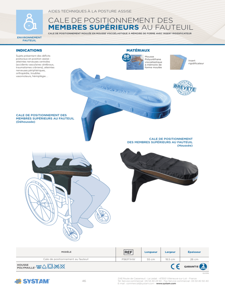 AIDES TECHNIQUES À LA POSTURE ASSISE CALE DE POSITIONNEMENT DES MEMBRES SUPÉRIEURS AU FAUTEUIL CALE DE POSITIONNEMENT MOULÉE EN MOUSSE VISCOÉLASTIQUE À MÉMOIRE DE FORME AVEC INSERT RIGIDIFICATEUR ENVIRONNEMENT FAUTEUIL MATÉRIAUX INDICATIONS 80 Sujets présentant des déficits posturaux en position assise : atteintes nerveuses centrales (accidents vasculaires cérébraux, traumatismes crâniens), atteintes nerveuses périphériques, orthopédie, troubles vasomoteurs, hémiplégie… kg/m3 Mousse Polyuréthane viscoélastique à mémoire de forme moulée Insert rigidificateur CALE DE POSITIONNEMENT DES MEMBRES SUPÉRIEURS AU FAUTEUIL (Déhoussée) CALE DE POSITIONNEMENT DES MEMBRES SUPÉRIEURS AU FAUTEUIL (Houssée) MODÈLE Cale de positionnement au fauteuil HOUSSE POLYMAILLE® P961F1HW Longueur Largeur Épaisseur 55 cm 18,5 cm 26 cm < 1000 ppm 02/2016 46 ZAE Route de Casseneuil - Le Lédat - 47300 Villeneuve-sur-Lot - France Tél. Service commercial : 05 53 40 23 50 - Fax Service commercial : 05 53 40 50 40 E-mail : [email protected] - www.systam.com AIDES TECHNIQUES À LA POSTURE ASSISE ENVIRONNEMENT FAUTEUIL CALE DE POSITIONNEMENT DES MEMBRES SUPÉRIEURS CONCEPT INNOVANT ET TOTALEMENT INDÉPENDANT DU FAUTEUIL ROULANT Ê Installation et réglage simple, rapide, et sans outils. Ê Transferts des patients facilités. Ê Poids du membre supérieur transmis directement à la cuisse et non plus à l’accoudoir du fauteuil, ce qui garantit le suivi de la correction, quelle que soit la position et/ou la mobilité du sujet. Ê Compatibilité avec la plupart des modèles de fauteuil (fixe, roulant, électrique, siège auto, chaise perçée), notamment avec les fauteuils pliants. 1 1 Butée : assurant le maintien du bras dans le dispositif. 2 Elément support : reprend le galbe naturel de la cuisse. 3 Gouttière de forme anatomique : respecte le positionnement morphologique du bras. 4 Zone de positionnement de la paume de la main 3 FORME ANATOMIQUE ET MOUSSE À MÉMOIRE DE FORME 4 Ê Confort optimisé pour le patient. Ê Galbes qui respectent le positionnement morphologique naturel du bras et de la main (notamment de l’angulation naturelle coudepoignet). 2 AIDE AU MAINTIEN EN POSITION Ê Système de fixation par bande auto-agripante : simple et efficace. HOUSSE IMPERMÉABILISÉE SYSTÈME DE RÉGLAGE Ê Dispositif simple et rapide à installer. Ê S’adapte aux mouvements du sujet. Ê Compatible avec toutes les tailles et types de morphologie. ZONE DE DÉCHARGE DU COUDE Ê Pour une diminution des appuis et un meilleur confort. SYSTÈME POLYVALENT Ê Dispositif symétrique droite/gauche. INSERTS RIGIDIFICATEURS Ê Placés sur les faces arrières de chacun des 2 éléments, ils stabilisent le dispositif en position et permettent de soulager l’appui de la cuisse. 02/2016 47 ZAE Route de Casseneuil - Le Lédat - 47300 Villeneuve-sur-Lot - France Tél. Service commercial : 05 53 40 23 50 - Fax Service commercial : 05 53 40 50 40 E-mail : [email protected] - www.systam.com AIDES TECHNIQUES À LA POSTURE ASSISE ENVIRONNEMENT FAUTEUIL CALE DE POSITIONNEMENT DES MEMBRES SUPÉRIEURS POUR EN SAVOIR + INTÉRÊT DU DISPOSITIF DE POSITIONNEMENT DES MEMBRES SUPÉRIEURS AU FAUTEUIL SYST’AM® Les membres supérieurs participent grandement à la stabilité de la position assise. Le soutien des membres supérieurs est une nécessité pour les sujets présentant des déficits posturaux en position assise. Les étiologies sont nombreuses, atteintes nerveuses centrales (accidents vasculaires cérébraux, traumatismes crâniens), atteintes nerveuses périphériques, orthopédie, troubles vasomoteurs... 1 - POSITIONNEMENT DU MEMBRE SUPÉRIEUR DU PATIENT HÉMIPLÉGIQUE 2 - POSITIONNEMENT DES MEMBRES SUPÉRIEURS EN ORTHOPÉDIE Le positionnement des membres supérieurs des sujets hémiplégiques est une préoccupation fréquente des services. La prévalence des complications de l’épaule des sujets hémiplégiques est importante, en particulier les douleurs de l’épaule qui sont présentes dans 70 % des cas. Le syndrome épaule-main associe une limitation articulaire de l’épaule, des troubles vasomoteurs et des douleurs du membre supérieur au repos et à la manipulation. Le déficit musculaire entraîne une incapacité de soutien du bras et de stabilisation de l’articulation gléno-humérale (tête de l’humérus) qui sous l’action du poids du bras s’étire, entraînant une subluxation. On la retrouve avec une incidence variable selon les études, entre 18 et 80 %. Des atteintes nerveuses périphériques peuvent être observées des suites de cette subluxation par étirement, compression des nerfs périphériques. L’apparition de la subluxation gléno-humérale est donc en grande partie due à des phénomènes mécaniques d’étirement liés à l’action conjuguée des manutentions manuelles et de la position assise. La prise en charge de ce phénomène repose donc essentiellement sur les techniques de positionnement du membre supérieur au fauteuil permettant de diminuer le risque de subluxation, mais aussi du syndrome épaule-main en évitant l’étirement capsulaire. Un large consensus existe pour mettre en avant les techniques de positionnement comme facteur essentiel de prévention. La revue de la littérature réalisée par Turner-Stokes et Jackson montre l’importance du soutien systématique du membre supérieur essentiellement en phase flasque. La complication la plus fréquente d’une fracture des membres supérieurs est l’apparition d’un oedème pouvant favoriser une algodystrophie (syndrôme douloureux complexe). La lutte contre cet oedème nécessite le soutien du membre, aussi bien en position allongée qu’en position assise, en favorisant le drainage par une posture en déclive. Le dispositif de positionnement des membres supérieurs favorise le drainage par une déclive de l’avant-bras et permet de soulager les douleurs en limitant les contraintes ostéoarticulaire
