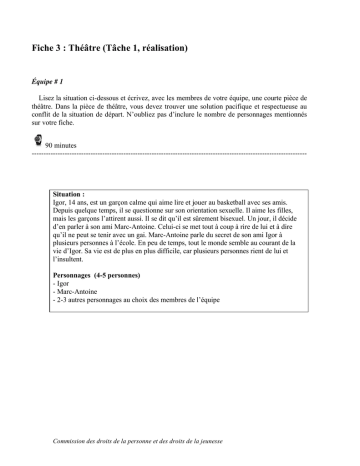 Fiche 3 : Théâtre (Tâche 1, réalisation) Équipe # 1 Lisez la situation ci-dessous et écrivez, avec les membres de votre équipe, une courte pièce de théâtre. Dans la pièce de théâtre, vous devez trouver une solution pacifique et respectueuse au conflit de la situation de départ. N’oubliez pas d’inclure le nombre de personnages mentionnés sur votre fiche. 90 minutes --------------------------------------------------------------------------------------------------------------------- Situation : Igor, 14 ans, est un garçon calme qui aime lire et jouer au basketball avec ses amis. Depuis quelque temps, il se questionne sur son orientation sexuelle. Il aime les filles, mais les garçons l’attirent aussi. Il se dit qu’il est sûrement bisexuel. Un jour, il décide d’en parler à son ami Marc-Antoine. Celui-ci se met tout à coup à rire de lui et à dire qu’il ne peut se tenir avec un gai. Marc-Antoine parle du secret de son ami Igor à plusieurs personnes à l’école. En peu de temps, tout le monde semble au courant de la vie d’Igor. Sa vie est de plus en plus difficile, car plusieurs personnes rient de lui et l’insultent. Personnages (4-5 personnes) - Igor - Marc-Antoine - 2-3 autres personnages au choix des membres de l’équipe Commission des droits de la personne et des droits de la jeunesse Équipe # 2 Lisez la situation ci-dessous et écrivez, avec les membres de votre équipe, une courte pièce de théâtre. Dans la pièce de théâtre, vous devez trouver une solution pacifique et respectueuse au conflit de la situation de départ. N’oubliez pas d’inclure le nombre de personnages mentionnés sur votre fiche. 90 minutes --------------------------------------------------------------------------------------------------------------------- Situation : Camille se promène souvent dans les corridors de l’école en tenant sa blonde, Julie, par la taille. Les deux filles de 14 ans forment un couple depuis peu et ne se cachent pas. Plusieurs élèves leur lancent des insultes. Camille et Julie ignorent les commentaires. Elles se promènent main dans la main. Par contre, avec le temps, les deux filles se sentent isolées, car elles font de plus en plus rire d’elles et n’ont plus d’amis. Personnages (4-5 personnes) - Camille - Julie - 2-3 autres personnages au choix des membres de l’équipe Commission des droits de la personne et des droits de la jeunesse Équipe # 3 Lisez la situation ci-dessous et écrivez, avec les membres de votre équipe, une courte pièce de théâtre. Dans la pièce de théâtre, vous devez trouver une solution pacifique et respectueuse au conflit de la situation de départ. N’oubliez pas d’inclure le nombre de personnages mentionnés sur votre fiche. 90 minutes --------------------------------------------------------------------------------------------------------------------- Situation : John et Alain forment un couple depuis deux ans. Ils ont décidé de se louer un appartement ensemble. Depuis deux semaines, ils cherchent l’appartement idéal dans les petites annonces du Journal de Québec. Un jour, ils trouvent un appartement qui leur plaît : un grand trois et demi avec un patio et une cour arrière. Ils appellent le propriétaire pour prendre rendez-vous. Le jour de la visite, le propriétaire mentionne que cet appartement n’est pas idéal pour deux hommes, car il n’y a qu’une chambre à coucher. John répond aussitôt que ce n’est pas un problème puisque lui et Alain forment un couple. Le propriétaire, surpris, dit qu’il ne peut pas leur louer l’appartement, car les voisins n’aiment pas les homosexuels. Personnages (4-5personnes) - John - Alain - Le propriétaire - 1-2 autres personnages au choix des membres de l’équipe Commission des droits de la personne et des droits de la jeunesse Équipe # 4 Lisez la situation ci-dessous et écrivez, avec les membres de votre équipe, une courte pièce de théâtre. Dans la pièce de théâtre, vous devez trouver une solution pacifique et respectueuse au conflit de la situation de départ. N’oubliez pas d’inclure le nombre de personnages mentionnés sur votre fiche. 90 minutes --------------------------------------------------------------------------------------------------------------------Situation : Plusieurs rumeurs circulent à l’école. Ces jours-ci, tout le monde dit que la nouvelle élève, Marcelle, est lesbienne. Personne n’ose lui parler. Dans le cours d’histoire, l’enseignante, Madame Reyes, fait des équipes pour un travail sur la démocratie. Personne ne veut travailler avec Marcelle. La jeune fille se sent seule et isolée. Personnages (4-5 personnes) - Marcelle - Madame Reyes - 2-3 autres personnages au choix des membres de l’équipe Commission des droits de la personne et des droits de la jeunesse Équipe # 5 Lisez la situation ci-dessous et écrivez, avec les membres de votre équipe, une courte pièce de théâtre. Dans la pièce de théâtre, vous devez trouver une solution pacifique et respectueuse au conflit de la situation de départ. N’oubliez pas d’inclure le nombre de personnages mentionnés sur votre fiche. 90 minutes --------------------------------------------------------------------------------------------------------------------Situation : Les élèves de secondaire 1 du cours d’enseignement moral doivent faire une présentation sur leur famille. Lina, 14 ans, parle honnêtement du fait qu’elle a deux mères, c’est-àdire qu’elle vit dans une famille homoparentale. Ses camarades de classes commencent aussitôt à l’interroger sur ses mères et sur ce type de famille : Qui est ta vraie mère ? Es-tu, toi aussi, lesbienne ? As-tu un père ? Lina répond très calmement aux questions de ses camarades de classe. Tout semble bien se passer. Pourtant, au cours des jours suivants, Lina remarque que les autres la regardent étrangement. Certaines personnes chuchotent lorsqu’elles passent près de Lina, d
