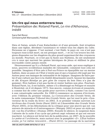 Il Tolomeo Vol. 17 – Dicembre | December | Décembre 2015 [online] ISSN 2499-5975 [print] ISSN 1594-1930 Un rire qui nous enterrera tous Présentation de: Roland Paret, Le rire d’Athanase, inédit Sara Del Rossi (Uniwersytet Warszawki, Polska) Dieu et Satan, armés d’une Kalachnikov et d’une grenade, font irruption dans une église, dérobent l’assistance et volent tous les objets du culte. Personne ne s’oppose. C’est normal, c’est Haïti, le pays où «on n’est pas toujours tout-à-fait mort, on est presque mort…» et où l’on trouve les religions disposées sur les étagères du plus grand supermarché des croyances au monde. Pourtant, ce n’est pas la faute aux Haïtiens, ils ont seulement cru à ceux qui narrent les gestes héroïques de Jésus et édifient le plus incroyable conte jamais existé. Heureusement qu’il y a Roland Paret, qui nous aide, qui nous explique à nous, pauvres occidentaux malades de rationalité, comment tout cela est possible. Imaginez d’être nés à Port-au-Prince ou éparpillés sur un morne haïtien, dans un pays où l’État n’existe pas et qui a toujours été jugé par les Autres pour son manque de rationalité et de logique. Imaginez de faire partie d’une culture qui face à la réalité désarmante sourit, hausse les épaules et dit: Kreyon Bondye pa gen gòm (le crayon du bon Dieu n’a pas de gomme). Être haïtien n’est pas facile et rester haïtien non plus. Pourtant, Roland Paret, lui, il est haïtien, même s’il a déménagé en Pologne et ensuite à Montréal, où il vit depuis 1973. Son œuvre, comme écrivain et essayiste, a comme but de créer une guide pour survivre à Haïti, comme l’on survit à une catastrophe naturelle. En 1999 il commence sa mission d’écrivain, avec l’édition du premier volume, La Convocation des Grands Vents, de la suite romanesque Tribunal des Grands Vents, qui lui vaut le prix «Gouverneur de la rosée du livre» en 2002. À ce premier volume suivront Les Archives des Grands Vents (Paret 2001) et L’Assemblée des Grands Vents (Paret 2005), et les félicitations de la critique pour une œuvre qui est «un univers de miracle et d’extravagance» (Wargny 2002) et pour un style qui est «un feu d’artifice» (Dumas 2000). Ensuite le silence, le suspense dans l’attente de la suite d’un cycle qui prévoit sept volumes et qui est encore inachevé. Le silence est brisé lors de la publication, en 2007, de la nouvelle Le poète et l’architecte, mais surtout avec le pamphlet «Z». L’État haïtien existe, je l’ai même rencontré… (Paret 2012). Le passage de la narrative DOI 10.14277/2499-5975/Tol-17-15-2 37 Il Tolomeo, 17, 2015, pp. 37-42 ISSN 1594-1930 à l’essai socio-historique-politique-philosophique ne change pas la nature de Paret, qui a toujours la même mission, celle d’une perspective complète sur l’univers haïtien. Son œuvre se caractérise par l’éternel jeu d’échange d’un homme qui vit entre l’intérieur et l’extérieur de son pays et aussi par la superposition des plans et des points de vue, qui dérive de son activité parallèle de metteur en scène. Son dernier effort, cet inédit composé de Le rire d’Athanase et de Le temple du Formalisme, l’Église du Saint-Rire du Christ et le Panthéon du sperme sacré de Jésus, résume parfaitement sa production. En effet, dans une vingtaine de pages, l’auteur inclut toutes les caractéristiques de son œuvre, de celles stylistiques et formelles à celles qui appartiennent à son riche imaginaire. L’on retrouve un style particulier qui passe du traité philosophique aux trivialités populaires, grâce au vocabulaire volcanique et à une maîtrise linguistique qui laisse interdit et stupéfait; l’utilisation du dialogue, non seulement dans le texte, mais surtout entre les textes; l’imagination satirique et invective; les thématiques propres à Paret, comme le lien entre le Pouvoir et l’Art, l’exploitation et la vente de l’Art, le rhum comme génie créateur, l’importance de l’imagination personnelle et non communautaire, la désacralisation de toutes forme de religion. Et c’est justement la religion, ou mieux l’importance de la métaphore dans la religion, le point de départ de cet inédit. Le rire d’Athanase se déroule pendant le Concile de Nicée, quand l’Empereur Constantin décide de réunir les évêques de l’empire afin de résoudre les problèmes et les divisions à l’intérieur de la religion chrétienne, mais surtout pour créer une seule religion et satisfaire son credo: «Un seul Dieu au Ciel, un seul Empereur sur terre». La scène se joue sur les dialogues entre l’Empereur et les évêques, en particulier Alexandre et son diacre Athanase, et une voix narrative qui révèle les vraies pensées de Constantin. L’on assiste à la construction, dogme après dogme, de la religion chrétienne: la transsubstantiation, le Credo, les mathématiques célestes, le symbole de la croix, le nombril de Jésus… Tout se lie et s’accorde parfaitement, aucun fil ne sort de cette trame parfaite: «Les événements, le passé, l’histoire, tout ça, ce n’est qu’une série de mensonges sur lesquels on s’accorde». Le but est de parler aux gens pour les convaincre à croire, il faut trouver les symboles expressifs et les images déconcertantes, c’est pour cela que tous les arts doivent contribuer; la peinture, la sculpture, la musique, les mathématiques, chaque artifice, chaque science doit être utilisée pour la «propagande de Dieu». En effet «l’art, la religion et le pouvoir [ne sont] que des hypostases différentes d’une même essence». Qui sinon les théologiens, ces «arpenteurs de l’imaginaire» et «producteurs de concepts et mythes», pourraient y réussir? Eux, qui ont proclamé que «trois fois un fait un» et que «toujours un plus deux égalent un», seulement eux peuvent manipuler la réalité et la transformer en imaginair