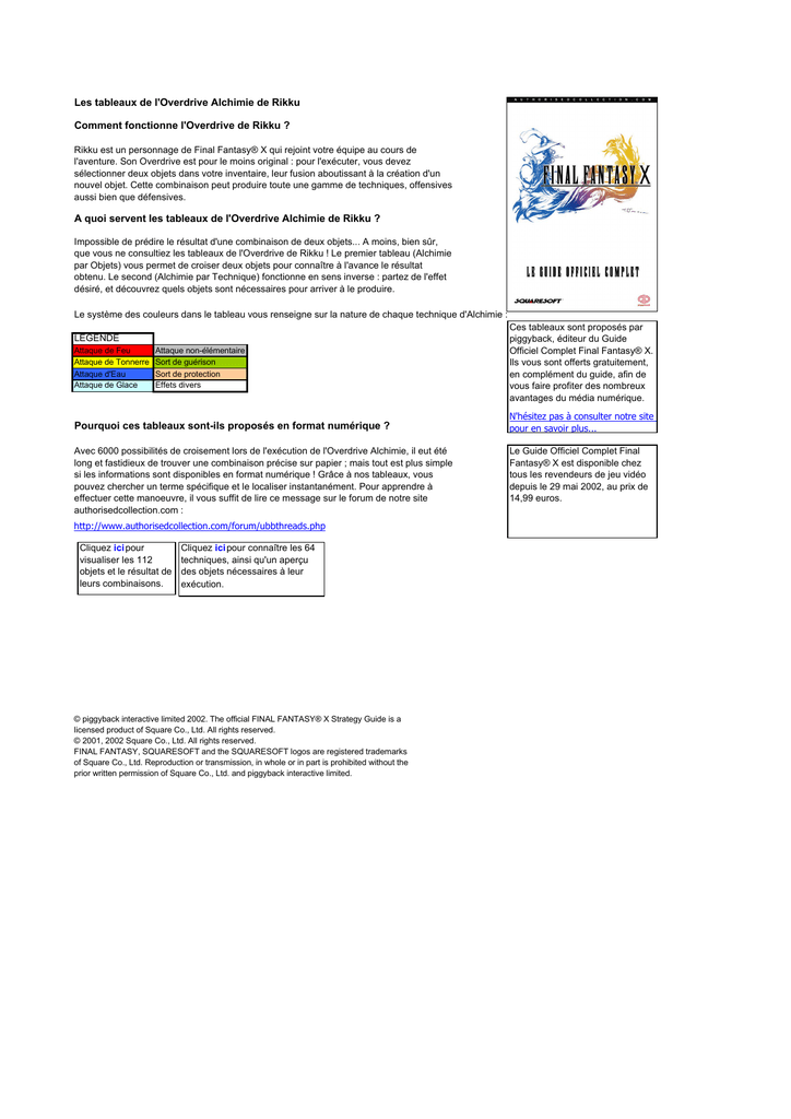Les tableaux de l'Overdrive Alchimie de Rikku Comment fonctionne l'Overdrive de Rikku ? Rikku est un personnage de Final Fantasy® X qui rejoint votre équipe au cours de l'aventure. Son Overdrive est pour le moins original : pour l'exécuter, vous devez sélectionner deux objets dans votre inventaire, leur fusion aboutissant à la création d'un nouvel objet. Cette combinaison peut produire toute une gamme de techniques, offensives aussi bien que défensives. A quoi servent les tableaux de l'Overdrive Alchimie de Rikku ? Impossible de prédire le résultat d'une combinaison de deux objets... A moins, bien sûr, que vous ne consultiez les tableaux de l'Overdrive de Rikku ! Le premier tableau (Alchimie par Objets) vous permet de croiser deux objets pour connaître à l'avance le résultat obtenu. Le second (Alchimie par Technique) fonctionne en sens inverse : partez de l'effet désiré, et découvrez quels objets sont nécessaires pour arriver à le produire. Le système des couleurs dans le tableau vous renseigne sur la nature de chaque technique d'Alchimie : LEGENDE Attaque de Feu Attaque de Tonnerre Attaque d'Eau Attaque de Glace Attaque non-élémentaire Sort de guérison Sort de protection Effets divers Pourquoi ces tableaux sont-ils proposés en format numérique ? Avec 6000 possibilités de croisement lors de l'exécution de l'Overdrive Alchimie, il eut été long et fastidieux de trouver une combinaison précise sur papier ; mais tout est plus simple si les informations sont disponibles en format numérique ! Grâce à nos tableaux, vous pouvez chercher un terme spécifique et le localiser instantanément. Pour apprendre à effectuer cette manoeuvre, il vous suffit de lire ce message sur le forum de notre site authorisedcollection.com : http://www.authorisedcollection.com/forum/ubbthreads.php Cliquez ici pour visualiser les 112 objets et le résultat de leurs combinaisons. Cliquez ici pour connaître les 64 techniques, ainsi qu'un aperçu des objets nécessaires à leur exécution. © piggyback interactive limited 2002. The official FINAL FANTASY® X Strategy Guide is a licensed product of Square Co., Ltd. All rights reserved. © 2001, 2002 Square Co., Ltd. All rights reserved. FINAL FANTASY, SQUARESOFT and the SQUARESOFT logos are registered trademarks of Square Co., Ltd. Reproduction or transmission, in whole or in part is prohibited without the prior written permission of Square Co., Ltd. and piggyback interactive limited. Ces tableaux sont proposés par piggyback, éditeur du Guide Officiel Complet Final Fantasy® X. Ils vous sont offerts gratuitement, en complément du guide, afin de vous faire profiter des nombreux avantages du média numérique. N'hésitez pas à consulter notre site pour en savoir plus... Le Guide Officiel Complet Final Fantasy® X est disponible chez tous les revendeurs de jeu vidéo depuis le 29 mai 2002, au prix de 14,99 euros. PAGE 1 -> 1 2 3 4 5 6 7 8 9 10 11 12 13 14 15 16 17 18 19 20 21 22 23 24 25 26 27 28 29 30 31 32 33 34 35 36 37 38 39 40 41 42 43 44 45 46 47 48 49 50 51 52 53 54 55 56 57 58 59 60 61 62 63 64 65 66 67 68 69 70 71 72 73 74 75 76 77 78 79 80 81 82 83 84 85 86 87 88 89 90 91 92 93 94 95 96 97 98 99 100 101 102 103 104 105 106 107 108 109 110 111 112 113 114 A B Objet Potion Potion Ultra Potion Potion + Ultra Potion Maxipotion Ultra Potion Mégapotion Ultra Potion Ether Bimentale Ether + Méga Bimentale Queue de phénix Méga Phénix Méga phénix Ultra Phénix Elixir Elixir + Mégalixir Elixir X Antidote Guérison X Défigeur Guérison X Collyre Guérison X Bocca Guérison X Eau bénite Guérison X Remède Guérison X Réminifor Ultra Potion Réminimag Ultra Potion Réminivit Ultra Potion Réminicomp Ultra Potion Potion Al Bhede Ultra Potion Onde bénite Guérison X Tétra-élément Guérison X Blizzard AntiElements Nunatak AntiElements Magikoroc Glace AntiElements Bout de bombo AntiElements Esprit de bombo AntiElements Magikoroc Feu AntiElements Globe électrique AntiElements Globe de foudre AntiElements Magikoroc Tonnerre AntiElements Ecaille de poisson AntiElements Ecaille de dragon AntiElements Magikoroc Eau AntiElements Grenade Ultra Potion Grenade antichar Ultra Potion Poudre soporifique Guérison X Poudre onirique Guérison X Grenade motus Guérison X Grenade aveuglanteGuérison X Magikoroc noir Guérison X Magikoroc hyalin Elixir + Magikoroc sacré Elixir + Méga Magikoroc Elixir X Crochet venimeux Guérison X Sablier d'argent Guérison X Sablier d'or Guérison X Cierge de vie Guérison X Grenade pétrifiante Guérison X Ombre de l'Au-delà Elixir + Souffle de l'Au-delà Elixir + Portefeuille luxueux Héroïsme H-Espace Ultra Elixir Aile de chocobo Guérison X Plume de chocobo Guérison X Rideau de lune Guérison X Rideau de lumière Guérison X Rideau d'étoiles Guérison X Source régénéranteGuérison X Source magique Guérison X Source vitale Guérison X Source revigorante Elixir + Sel purificateur Elixir + Onguent vital Méga Bivitale Onguent magique Ultra Bimentale Bistella Méga Freedom Breuvage vital Ultra Bivitale Breuvage magique Ultra Bimentale Tristella Méga Bivitale Sphère Physique Ultra Potion Sphère Mentale Ultra Potion Sphère Agilité Ultra Potion Sphère Comp Ultra Potion Sphère Etoile Héroïsme Sphère Carac Elixir X Sphère Tech Elixir X Sphère Spéc Elixir X Sphère Mag BlancheElixir X Sphère Mag Noire Elixir X Sphère Joker Elixir X Sphère Clé Niv.1 Elixir X Sphère Clé Niv.2 Elixir X Sphère Clé Niv.3 Elixir X Sphère Clé Niv.4 Elixir X Sphère HP Elixir X Sphère MP Elixir X Sphère Force Elixir X Sphère Constitution Elixir X Sphère Magie Elixir X Sphère Esprit Elixir X Sphère Rapidité Elixir X Sphère Esquive Elixir X Sphère Précision Elixir X Sphère Chance Héroïsme Sphère Annulation Elixir X Sphère Retour Elixir X Sphère Réunion Elixir X Sphère Succession Elixir X Sphère Téléport Elixir X Carte Ultra Potion Carte baptême Ultra Potion Remontant Guérison X Potion Hype