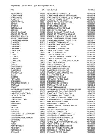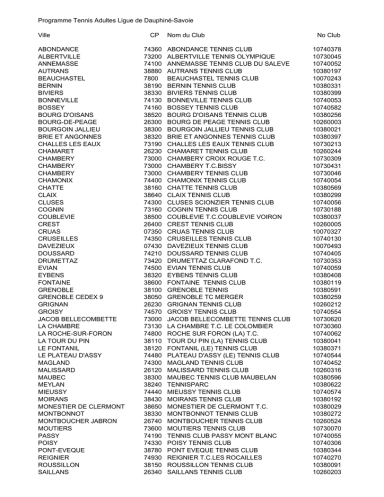 Programme Tennis Adultes Ligue de Dauphiné-Savoie Ville ABONDANCE ALBERTVILLE ANNEMASSE AUTRANS BEAUCHASTEL BERNIN BIVIERS BONNEVILLE BOSSEY BOURG D'OISANS BOURG-DE-PEAGE BOURGOIN JALLIEU BRIE ET ANGONNES CHALLES LES EAUX CHAMARET CHAMBERY CHAMBERY CHAMBERY CHAMONIX CHATTE CLAIX CLUSES COGNIN COUBLEVIE CREST CRUAS CRUSEILLES DAVEZIEUX DOUSSARD DRUMETTAZ EVIAN EYBENS FONTAINE GRENOBLE GRENOBLE CEDEX 9 GRIGNAN GROISY JACOB BELLECOMBETTE LA CHAMBRE LA ROCHE-SUR-FORON LA TOUR DU PIN LE FONTANIL LE PLATEAU D'ASSY MAGLAND MALISSARD MAUBEC MEYLAN MIEUSSY MOIRANS MONESTIER DE CLERMONT MONTBONNOT MONTBOUCHER JABRON MOUTIERS PASSY POISY PONT-EVEQUE REIGNIER ROUSSILLON SAILLANS CP 74360 73200 74100 38880 7800 38190 38330 74130 74160 38520 26300 38300 38320 73190 26230 73000 73000 73000 74400 38160 38640 74300 73160 38500 26400 07350 74350 07430 74210 73420 74500 38320 38600 38100 38050 26230 74570 73000 73130 74800 38110 38120 74480 74300 26120 38300 38240 74440 38430 38650 38330 26740 73600 74190 74330 38780 74930 38150 26340 Nom du Club ABONDANCE TENNIS CLUB ALBERTVILLE TENNIS OLYMPIQUE ANNEMASSE TENNIS CLUB DU SALEVE AUTRANS TENNIS CLUB BEAUCHASTEL TENNIS CLUB BERNIN TENNIS CLUB BIVIERS TENNIS CLUB BONNEVILLE TENNIS CLUB BOSSEY TENNIS CLUB BOURG D'OISANS TENNIS CLUB BOURG DE PEAGE TENNIS CLUB BOURGOIN JALLIEU TENNIS CLUB BRIE ET ANGONNES TENNIS CLUB CHALLES LES EAUX TENNIS CLUB CHAMARET TENNIS CLUB CHAMBERY CROIX ROUGE T.C. CHAMBERY T.C.BISSY CHAMBERY TENNIS CLUB CHAMONIX TENNIS CLUB CHATTE TENNIS CLUB CLAIX TENNIS CLUB CLUSES SCIONZIER TENNIS CLUB COGNIN TENNIS CLUB COUBLEVIE T.C.COUBLEVIE VOIRON CREST TENNIS CLUB CRUAS TENNIS CLUB CRUSEILLES TENNIS CLUB DAVEZIEUX TENNIS CLUB DOUSSARD TENNIS CLUB DRUMETTAZ CLARAFOND T.C. EVIAN TENNIS CLUB EYBENS TENNIS CLUB FONTAINE TENNIS CLUB GRENOBLE TENNIS GRENOBLE TC MERGER GRIGNAN TENNIS CLUB GROISY TENNIS CLUB JACOB BELLECOMBETTE TENNIS CLUB LA CHAMBRE T.C. LE COLOMBIER ROCHE SUR FORON (LA) T.C. TOUR DU PIN (LA) TENNIS CLUB FONTANIL (LE) TENNIS CLUB PLATEAU D'ASSY (LE) TENNIS CLUB MAGLAND TENNIS CLUB MALISSARD TENNIS CLUB MAUBEC TENNIS CLUB MAUBELAN TENNISPARC MIEUSSY TENNIS CLUB MOIRANS TENNIS CLUB MONESTIER DE CLERMONT T.C. MONTBONNOT TENNIS CLUB MONTBOUCHER TENNIS CLUB MOUTIERS TENNIS CLUB TENNIS CLUB PASSY MONT BLANC POISY TENNIS CLUB PONT EVEQUE TENNIS CLUB REIGNIER T.C.LES ROCAILLES ROUSSILLON TENNIS CLUB SAILLANS TENNIS CLUB No Club 10740378 10730045 10740052 10380197 10070243 10380331 10380399 10740053 10740582 10380256 10260003 10380021 10380397 10730213 10260244 10730309 10730431 10730046 10740054 10380569 10380299 10740056 10730188 10380037 10260005 10070327 10740130 10070493 10740405 10730353 10740059 10380408 10380119 10380591 10380259 10260212 10740554 10730620 10730360 10740062 10380041 10380371 10740544 10740452 10260316 10380596 10380622 10740574 10380192 10380029 10380272 10260524 10730070 10740055 10740306 10380344 10740270 10380091 10260203 Ville SAINT CERGUES SAINT DONAT SAINT FELICIEN SAINT JEOIRE SAINT JORIOZ SAINT MARCELLIN SAINT MARTIN D'HERES SAINT NAZAIRE LES EYMES SAINT RESTITUT SAINT-JEURE D'AY SAINT-PRIM SALAISE SUR SANNE SATILLIEU SCIEZ SEYSSINET PARISET SEYSSINS ST ETIENNE DE ST GEOIRS ST LAURENT DU PAPE TULLINS UGINE URIAGE VALENCE VALENCE LE HAUT VALLEIRY VILLEVOCANCE VIRY VIUZ EN SALLAZ VOREPPE CP 74140 26260 7410 74490 74410 38160 38400 38330 26130 7290 38121 38150 7290 74140 38170 38180 38590 7800 38210 73400 38410 26000 26000 74520 7690 74580 74250 38340 Nom du Club SAINT CERGUES TENNIS CLUB SAINT DONAT T.C.LAC DE CHAMPOS SAINT FELICIEN TENNIS CLUB SAINT JEOIRE TENNIS CLUB SAINT JORIOZ TENNIS CLUB SAINT MARCELLIN TENNIS CLUB GRENOBLE UNIVERSITE CLUB SAINT-NAZAIRE LES EYMES T.C. SAINT RESTITUT TENNIS CLUB SAINT JEURE D'AY TENNIS CLUB SAINT PRIM TC CHONAS SAINT PRIM SALAISE TENNIS CLUB SATILLIEU TENNIS CLUB SCIEZ-MASSONGY TENNIS CLUB SEYSSINET AMICAL CLUB TENNIS SEYSSINS TENNIS CLUB SAINT ETIENNE DE SAINT GEOIRS TC SAINT LAURENT DU PAPE T.C. TULLINS TENNIS CLUB UGINE TENNIS CLUB URIAGE TENNIS CLUB VALENCE TENNIS EPERVIERE VALENCE LE HAUT TENNIS CLUB VALLEIRY TENNIS CLUB VILLEVOCANCE TENNIS CLUB VIRY TENNIS CLUB VIUZ EN SALLAZ TENNIS CLUB VOREPPE TENNIS CLUB No Club 10740447 10260363 10070607 10740279 10740367 10380032 10380028 10380443 10260465 10070525 10380321 10380206 10070435 10740300 10380136 10380138 10380165 10070463 10380033 10730050 10380572 10260015 10260200 10740290 10070277 10740474 10740616 10380175