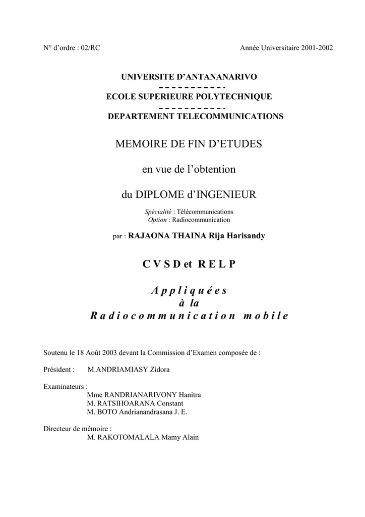 N° d’ordre : 02/RC Année Universitaire 2001-2002 UNIVERSITE D’ANTANANARIVO ECOLE SUPERIEURE POLYTECHNIQUE DEPARTEMENT TELECOMMUNICATIONS MEMOIRE DE FIN D’ETUDES en vue de l’obtention du DIPLOME d’INGENIEUR Spécialité : Télécommunications Option : Radiocommunication par : RAJAONA THAINA Rija Harisandy C V S D et R E L P Appliquées à la Radiocommunication mobile Soutenu le 18 Août 2003 devant la Commission d’Examen composée de : Président : M.ANDRIAMIASY Zidora Examinateurs : Mme RANDRIANARIVONY Hanitra M. RATSIHOARANA Constant M. BOTO Andrianandrasana J. E. Directeur de mémoire : M. RAKOTOMALALA Mamy Alain REMERCIEMENTS A Jéhovah Dieu, le Souverain Suprême de l’Univers, le Dieu Tout-Puissant qui est la source de « tout beau don et de tout présent parfait » selon ce qui est écrit dans la Bible en Jacques 1 :17. Ce mémoire de fin d’études a été le résultat des formations que j’ai acquises au sein de l’ESPA en particulier le Département Télécommunications. Ainsi j’adresse mes remerciements les plus sincères à toutes les personnes qui ont participé de près ou de loin à sa réalisation. En particulier : Monsieur RANDRIAMITANTSOA Paul Auguste, Chef de Département Télécommunications qui a bien voulu donner son accord pour que ce mémoire puisse être présenté, Monsieur ANDRIAMIASY Zidora, Enseignant à l’ESPA pour l’honneur qu’il nous fait en acceptant la présidence de cette soutenance, Madame et Messieurs les Membres de Jury : - Mme RANDRIANARIVONY Hanitra - Mr RATSIHOARANA Constant - Mr BOTO Andrianandrasana J. E. qui ont accepté sans hésitation de faire reconnaissance de mon mémoire et de juger ce travail, Monsieur RAKOTOMALALA Mamy Alain, Enseignant et Encadreur de ce mémoire qui a donné le meilleur de lui même pour me guider, conseiller et soutenir tout au long de ce travail, L’Ensemble des Corps Enseignants de l’ESPA en particulier le Département Télécommunications et le Département Electronique, Mes très chers Parents pour leur soutien tant morale que matériel, Les membres de ma famille, les proches et les amis pour leurs aides et soutiens, Toutes les sociétés qui ont accepté de nous fournir des informations pour l’accomplissement du projet. TABLE DES MATIERES INTRODUCTION 1 Première partie: ETUDE THEORIQUE CHAPITRE I - RADIOCOMMUNICATIONS MOBILES NUMERIQUES 4 I.1 - Domaines d’applications .................................................................................................................................... 4 I.2 - Structure générale de la radio mobile numérique ............................................................................................. 4 I.2.1 – Source de message numérique ..................................................................................................................... 5 I.2.2 – Codage de source .......................................................................................................................................... 5 I.2.3 – Codage de canal ............................................................................................................................................ 5 I.2.4 – L’émetteur..................................................................................................................................................... 6 I.2.5 – Canal de transmission .................................................................................................................................. 6 I.2.6 – Le récepteur .................................................................................................................................................. 6 I.3 - Systèmes de communication avec les mobiles ................................................................................................... 6 I.3.1- Système monocentre ...................................................................................................................................... 6 I.3.2- Système multicentre ....................................................................................................................................... 7 I.3.3- Réseaux cellulaires ........................................................................................................................................ 8 I.4 –Techniques d’accès ............................................................................................................................................. 8 I.4.1 – Accès multiple à répartition de fréquence ................................................................................................. 8 I.4.2 – Accès multiple à répartition du temps ....................................................................................................... 9 I.4.3 – Accès multiple à répartition en codes ........................................................................................................ 9 I.5 - Particularités de la propagation ........................................................................................................................ 10 I.6 – Le problème de la bande passante ................................................................................................................... 11 I.6.1 – La modulation par impulsions et codage .................................................................................................. 11 I.6.1.1 – Echantillonnage ……………………………………………………………………………………………………………..11 I.6.1.2 – Quantification ………………………………………………………………………………………………………………..13 I.6.1.3 – Codage ………………………………………………………………………………………………………………………...13 I.6.2 – Problème avec le codage MIC ..