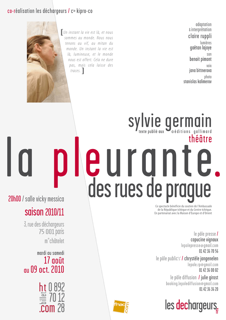 co-réalisation les déchargeurs / c ie kipro-co adaptation & interprétation Un instant la vie est là, et nous sommes au monde. Nous nous tenons au vif, au mitan du monde. Un instant la vie est là, lumineuse, et le monde nous est of fert. Cela ne dure pas, mais cela laisse des traces. claire ruppli lumières gaëtan lajoye son benoit pimont voix jana bittnerova photo stanislas kalimerov sylvie germain la pleurante . des rues de prague texte publié aux ©éditions gallimard théâtre 20h00 / salle vicky messica saison 2010/11 3, rue des déchargeurs 75 001 paris m°châtelet mardi au samedi 17 août au 09 oct. 2010 Ce spectacle bénéficie du soutien de l’Ambassade de la République tchèque et du Centre tchèque. En partenariat avec la Maison d’Europe et d’Orient le pôle presse / capucine vignaux lepolepresse @ gmail.com 01 42 36 70 56 le pôle public‘s’ / chrystèle jongenelen lepole.rp @ gmail.com 01 42 36 00 02 le pôle diffusion / julie girost booking.lepolediffusion @ gmail.com 01 42 36 36 20 l’histoire Une géante au pied clochant, porteuse de visions, écho d’une identité, des douleurs, apparaît mystérieusement dans les rues de Prague. Elle est le temps, la mémoire de la ville. Elle recèle la mémoire des victimes inconnues, des enfants de Terezin, de Bruno Schulz, de nos proches et lointains disparus. Elle porte la révolte, les larmes des vivants et des morts. Quand elle apparaît, dans chaque quartier de Prague, elle transcende l’instant présent, le met en suspens. Elle fait resurgir le passé, l’invisible dans le visible. Elle relie les vivants et les morts. Elle apaise la douleur des humains. Elle est faite « de larmes ». Cette géante est « plurielle, elle n’a pas de visage ». Elle se fait hasard, chance, poésie, pitié, beauté. Elle ne s’arrête jamais. Elle est déjà ailleurs, peut-être dans une autre ville. extrait Elle va partout, elle n’habite nulle part, elle hante tous les lieux. Or les textes aussi sont des lieux. Ils sont les endroits où s’illuminent la solitude, l’absence, où stridule le vide, où chante le silence. Un instant la vie est là, et nous sommes au monde. Nous nous tenons au vif, au mitan du monde, dont il nous semble frôler enfin le sens et la pleine beauté. Un instant la vie est là, lumineuse, et le monde nous est offert. Cela ne dure pas, mais cela laisse des traces, runes d’amour fou gravés au profond de la chair, de la mémoire, et du désir de la pensée. Runes qui longtemps, longtemps scandent leurs chants en sourdine dans notre sang. mot de l’auteur Les personnages, une fois livrés aux mots d’un livre, n’appartiennent plus à leur seul auteur, ils s’offrent à l’imagination et à l’interprétation des lecteurs, et plus encore à celles des comédiens qui se penchent sur eux pour leur prêter leur corps, leur voix. Il en est ainsi avec La Pleurante des rues de Prague, que Claire Ruppli a prise par la main, ou, plus exactement, a « incorporée ». La Pleurante est une géante au corps massif, vêtue de haillons qui enveloppent son corps immatériel, tissé de larmes, et qui marche à pas lents en claudiquant profondément ; la comédienne est toute menue, et elle a l’énergie de la « chèvre de Monsieur Seguin » (un de mes personnages littéraires préférés), une énergie à la fois ludique, follement éprise de liberté, et tragique. Cette différence d’apparence est pulvérisée par, précisément, l’énergie de la cabrette Claire Ruppli qui donne à la Pleurante une présence vive, insolite, vibrante. Pour avoir assisté plusieurs fois à son spectacle, j’ai pu apprécier l’intimité que la comédienne a créée avec son personnage, son intelligence du texte, sa rigueur, et admirer son inventivité chaque fois renouvelée. le spectacle. théâtre Sylvie Germain un mot le pôle presse / capucine vignaux lepolepresse @ gmail.com 01 42 36 70 56 le pôle public‘s’ / chrystèle jongenelen lepole.rp @ gmail.com 01 42 36 00 02 le pôle diffusion / julie girost booking.lepolediffusion @ gmail.com 01 42 36 36 20 En chacun de nous vit un livre qui ne demande qu’à s’ouvrir, qu’à vivre, qu’à s’écouter. La Pleurante des rues de Prague est l’un d’entre eux. Sylvie Germain est une conteuse prodigieuse dont l’écriture procède d’une nécessité vitale : « aller à la rencontre des autres qu’on porte en soi et qui y ont laissé des traces ». Passeuse à mon tour de ce texte, c’est à haute voix que je lui rends grâce, avec ce besoin de le faire résonner. Si le théâtre est « un lieu où tout peut advenir », il est celui-là qui peut accueillir au mieux les pas de cette géante, entre ombres et vivants, visible et invisible. « Cet te inconnue qui donc e s t- elle ? Une vision, elle -même p or teus e, semeuse de visions. Une vision lié e à un lieu, émané e de s pier re s d ’une ville. S a ville Pr ague. » les dechargeursfr. Ce texte raconte l’extrême présence au monde, et sa langue dont le souffle est musical et lyrique incite à le porter dans l’espace du théâtre. Cette Pleurante est à la fois présente et son « visage est l’effacement de milliards de visages ». Le plateau du théâtre est ce lieu où l’on est plus que présent quand on accepte d’y être totalement autre, et donc de s’effacer à soi-même pour être passeur des mots des autres. Les mots sont autant d’échos de la langue écrite, à écouter dits, chuchotés, multipliés par la voix et son souffle. De ces mots qui vous chavirent le cœur et qui traduisent la langue de l’âme, de ces silences qui nous rappellent être en vie, de l’urgence à ranimer en soi un passé indélébile mais perdu, naît le devoir de transmettre, de re-présenter, c’est pourquoi je joue ce texte. Claire Ruppli sylvie germain, auteur Née à Châteauroux en 1954, docteur ès philosophie, Sylvie Germain vit 7 années à Prague (République tchèque). Son premier roman L