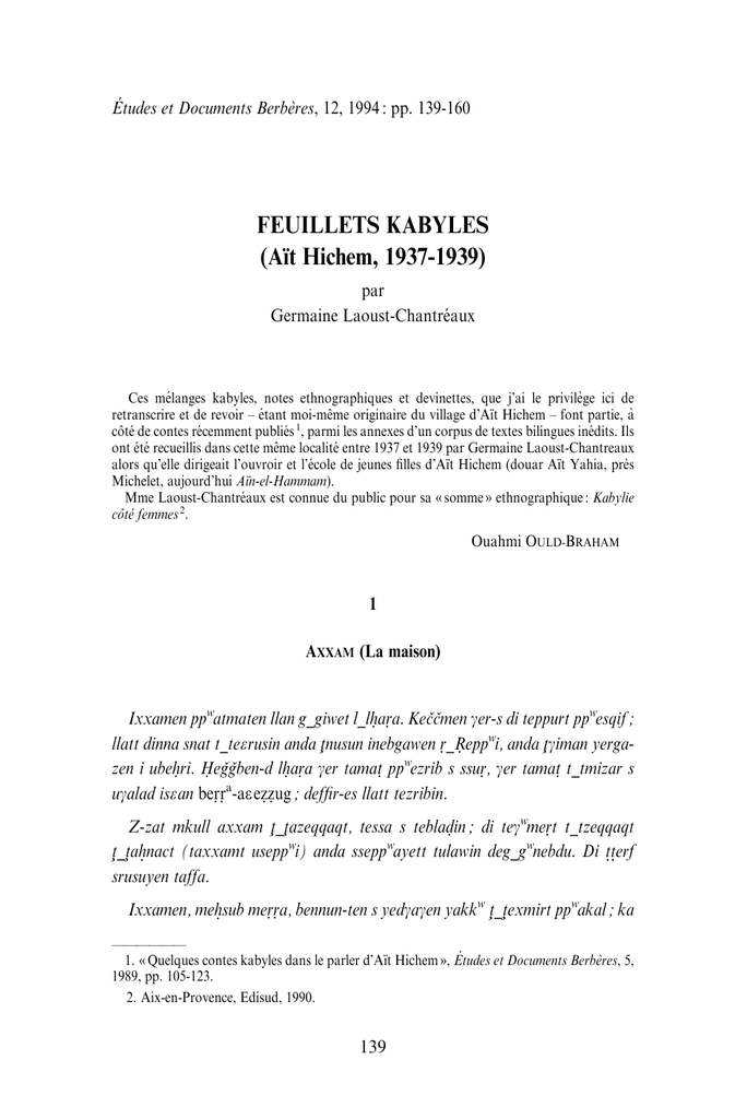 FEUILLETS KABYLES (Aı¨t Hichem, 1937