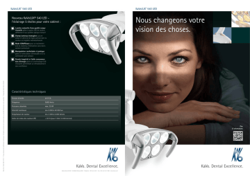 KaVoLUX® 540 LED KaVoLUX® 540 LED Nous changeons votre vision des choses. Nouveau KaVoLUX® 540 LED – l'éclairage 5 étoiles pour votre cabinet : L umière naturelle d'une qualité exceptionnelle grâce à quatre LED de couleur différente et au système optique exclusif C hamp lumineux homogène aucune ombre et délimité de façon précise dont la couleur est réglable individuellement M ode COMPOsave pour un traitement aisé du matériau d'obturation sans durcissement prématuré M anipulation confortable et pratique grâce à l'articulation 3D blocable et à la commande sans contact Mat.-Nr. 1.004.1369 07/11 fr Sous réserve de modification techniques. De légères variations de couleurs dues au procédé d'impression sont possibles. © Copyright KaVo Dental GmbH. G rande longévité et faible consommation d'énergie grâce à la technologie LED innovante permettant un refroidissement sans ventilateur Caractéristiques techniques Tension d'entrée 24 V CA Fréquence 50/60 hertz Puissance absorbée max. 35 VA Intensité lumineuse env. 8 000 à 40 000 lux Température de couleur env. 4 000 à 6 000 kelvins Indice de rendu des couleurs IRC > 93 % (pour 5 500 / 6 000 kelvins) Plus d’ informations KaVo Dental GmbH · D 88400 Biberach/Riß · Téléphone +49 7351 56-0 · Fax +49 7351 56-1488 · www.kavo.com KaVoLUX® 540 LED w Un éclairage parfait est une question de mise au point et de point de vue. Lumière (1) (2) (3) DES ANNÉES-LUMIÈRE D'AVANCE 5 étoiles KaVo Procédez à l'adaptation des couleurs directement sur le fauteuil – grâce à une lumière naturelle assurant un excellent rendu des couleurs. Champ lumineux homogène. Le champ lumineux idéal pour d'excellents résultats de traitement : homogène, délimité avec précision et formation d'ombres réduite. KaVoLUX 540 LED offre tous ces atouts et vous fournit, avec jusqu'à 40 000 lux, une zone de traitement parfaitement éclairée. Vous souhaitez adapter la couleur de la lumière à vos besoins personnels ? Cela ne pose aucun problème : la température de couleur peut être réglée sur cinq niveaux – de façon individuelle, selon vos souhaits. Vous obtenez ainsi une vue optimisée et un contraste supérieur des tissus mous. La projection en profondeur de la lumière permet d'éclairer les zones de la cavité buccale les plus reculées. Ceci assure une vision nette et une détection optimale des détails, sans se fatiguer les yeux. 0 400 500 600 700 Longueur d'onde Spectre d'absorption camphoroquinone Lumière normale, 40 000 lux et 5 500 K Lumière atténuée COMPOsave Travailler les composites en toute sérénité – grâce à une superposition minimale du spectre d'absorption de la camphoroquinone et au mode COMPOsave. Illustr. : spectres chromatiques des différents modes d'éclairage et spectre d'absorption du photo-initiateur le plus utilisé. (4) La perfection puissance 5 – un des cinq sytèmes optiques de la KaVoLUX 540 LED : la lumière produite par quatre LED (1) de couleur différente est parallélisée dans le collimateur (2). Le collimateur (3) mélange les couleurs et génère 41 000 champs lumineux prédéfinis qui forment ensemble un champ lumineux global homogène. 1 Un problème fréquent : lorsque la lumière de la lampe scialytique n'est pas atténuée, le composite durcit souvent trop rapidement. Ce n'est pas le cas avec la KaVoLUX 540 LED. Le mode innovant COMPOsave absorbe entièrement la partie bleue de la lumière, ralentissant ainsi le durcissement du matériau d'obturation. Ceci permet de travailler les substances durcissant à la lumière en toute sérénité sans devoir atténuer la lumière. Une luminosité de 15 000 lux vous procure à tout moment une vue optimale et d'excellents résultats en série. naturelle d'une qualité exceptionnelle. Une vision optimale est la condition sine qua non de conditions de travail optimales. KaVoLUX 540 LED vous fournit, avec une intensité lumineuse de près de 40 000 lux générée par le système optique unique en son genre et quatre LED de couleur différente, une lumière blanche naturelle d'une qualité hors du commun. Le mélange parfait des couleurs garantit une lumière blanche à chaque endroit du champ d'éclairage. L'excellent rendu des couleurs vous permet en outre une adaptation exacte de la couleur du composite à celle des dents et ce à l'aide d'une lampe scialytique directement fixée sur votre unité de traitement. Le spectre complet naturel et très proche de la lumière du jour de la KaVoLUX 540 LED ouvre des possibilités insoupçonnées en matière de diagnostic et de traitement. Une vision parfaite pour un traitement optimal. Ergonomique et confortable. Ergonomique, pratique, flexible : grâce à l'articulation 3D blocable unique en son genre, la KaVoLUX 540 LED peut être positionnée de façon très variable. En fonction de vos besoins, vous pouvez passer du mode 2D fixe à un mouvement 3D flexible. Le résultat : un éclairage toujours optimal de toute la zone de traitement, quelle que soit votre position et celle de votre patient. Et la commande ? Extrêmement confortable avec la KaVoLUX 540 LED. Vous pouvez alllumer ou éteindre la lampe et passer d'un mode à l'autre sans qu'aucun contact ne soit nécessaire ou la commander de manière simple et confortable via l'élément praticien de l'unité de traitement. Adaptée aux positions automatiques de votre unité traitement, la KaVoLUX 540 LED est également allumée et éteinte. Grande longévité et faible consommation d'énergie. KaVoLUX 540 LED vous offre tous les avantages d'une technologie LED de pointe. Les LED à haut rendement énergétique ont une durée de vie pouvant atteindre 15 ans et ménagent votre budget grâce à de faibles coûts de maintenance et d'énergie. En raison d'une gestion intelligente de la température, la lampe LED ne requiert aucun ventilateur et contribue ainsi à une ambiance de travail plus détendue. Tout simplement hygiénique : d