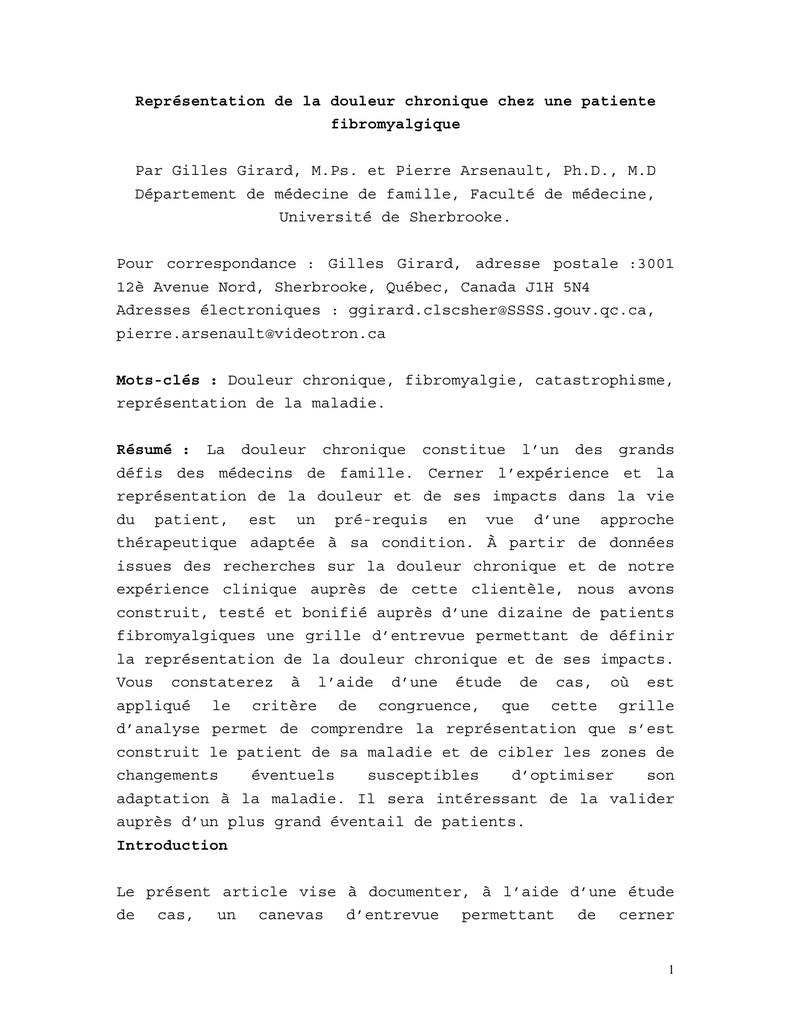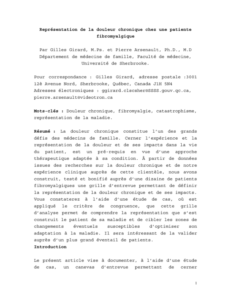 Représentation de la douleur chronique chez une patiente fibromyalgique Par Gilles Girard, M.Ps. et Pierre Arsenault, Ph.D., M.D Département de médecine de famille, Faculté de médecine, Université de Sherbrooke. Pour correspondance : Gilles Girard, adresse postale :3001 12è Avenue Nord, Sherbrooke, Québec, Canada J1H 5N4 Adresses électroniques : [email protected], [email protected] Mots-clés : Douleur chronique, fibromyalgie, catastrophisme, représentation de la maladie. Résumé : La douleur chronique constitue l’un des grands défis des médecins de famille. Cerner l’expérience et la représentation de la douleur et de ses impacts dans la vie du patient, est un pré-requis en vue d’une approche thérapeutique adaptée à sa condition. À partir de données issues des recherches sur la douleur chronique et de notre expérience clinique auprès de cette clientèle, nous avons construit, testé et bonifié auprès d’une dizaine de patients fibromyalgiques une grille d’entrevue permettant de définir la représentation de la douleur chronique et de ses impacts. Vous constaterez à l’aide d’une étude de cas, où est appliqué le critère de congruence, que cette grille d’analyse permet de comprendre la représentation que s’est construit le patient de sa maladie et de cibler les zones de changements éventuels susceptibles d’optimiser son adaptation à la maladie. Il sera intéressant de la valider auprès d’un plus grand éventail de patients. Introduction Le présent article vise à documenter, à l’aide d’une étude de cas, un canevas d’entrevue permettant de cerner 1 l’expérience et la représentation de la douleur chronique et de ses impacts dans la vie du patient. C’est là un prérequis en vue d’amorcer un suivi thérapeutique sur mesure et de cibler les zones de changements éventuels susceptibles d’optimiser l’adaptation à la maladie. Dimensions à considérer dans l’évaluation et le suivi de patients souffrant de douleur chronique La douleur chronique est omniprésente dans les milieux cliniques. On estime à près du tiers la proportion de la population canadienne qui souffre à des degrés variables de douleurs chroniques (Jovey et al., 2002). Contrairement à celui de la douleur aiguë, le traitement de la douleur chronique est difficile, exigeant, parfois déroutant et souvent décevant pour le clinicien. La division entre douleurs nociceptives et neurogènes, couramment reconnue dans les milieux cliniques, fait récemment l’objet d’une remise en question (Attal et Bouhassira, 2004). L’expérience clinique indique, en effet, que la douleur chronique inclut généralement une composante neurogène. Aux douleurs initiales, surtout nociceptives c’est-à-dire produites par stimulations de récepteurs périphériques (mécaniques, thermiques, chimiques, etc.), succède une composante essentiellement neurogène c’est-àdire générée par les neurones nociceptifs eux-mêmes. L’activité spontanée et continue de ces neurones, couplée à des émotions exacerbées, diminue le seuil de tolérance à la douleur. Le traitement de la douleur chronique exige donc d’intervenir au-delà de la sphère biologique et de considérer à la fois les aspects cognitifs, émotifs et comportementaux liés à la douleur (Gatchell et Turk,1999). Dans des entrevues préliminaires, nous avons observé que plusieurs patients se décrivent complètement envahis par les 2 douleurs au point de ne percevoir aucune partie d’eux-mêmes qui ne soit pas handicapée ou paralysée par la maladie et ses impacts. Très souvent, le manque de compréhension ou de solution à la douleur, représente pour les patients (et leurs proches) une source d’anxiété et/ou de dépression ainsi que d’évitement pour différentes activités. Une fois ces éléments identifiés par le médecin, il est ensuite possible d’intervenir, de dédramatiser le problème, de le recadrer, de valider et mobiliser les émotions pénibles et de proposer des activités adaptées et progressives. Le but est ici de redonner aux patients le contrôle sur leur vie et de leur permettre de renouer avec des plaisirs significatifs. À cette fin, il est indispensable que le médecin identifie le mode réactionnel du patient de même que ce qui l’anime. Certaines conditions cliniques, comme la fibromyalgie, constitue, à cet égard, un véritable défi. Ce défi est d’autant plus important lorsque la réaction des patients est teintée de catastrophisme. Le catastrophisme (Sullivan, 2001), reconnu scientifiquement depuis une quinzaine d’années, est défini comme une croyance ou une orientation négative exagérée à l’égard des stimuli douloureux et de l’expérience de la douleur. Cette croyance est différente de la dépression bien qu’elle puisse en être un précurseur. La pensée catastrophique ou alarmiste est plus fréquente chez la femme, se développe tôt dans la vie, demeure relativement stable sans intervention et peut décroître chez les aînés. Elle s’accompagne d’une détresse psychologique et est souvent associée avec une expérience intense de la douleur bien qu’elle soit aussi observée en absence de la douleur. Le catastrophisme agit comme un filtre à travers lequel la personne évalue la douleur comme un danger avec lequel elle ne peut pas composer. Contrôle et catastrophisme sont inversement reliés. Des pensées catastrophiques peuvent conduire à l’évitement des activités. Le catastrophisme est un prédicteur démontré 3 d’incapacités ultérieures, c’est-à-dire de restrictions ou limitations des activités dans les maladies chroniques. Grille d’entrevue et représentation de la douleur chronique À partir des données issues de recherches sur la douleur chronique et de notre expérience clinique auprès de cette clientèle, nous avons construit une grille d’entrevue permettant de définir la représentation de la doul