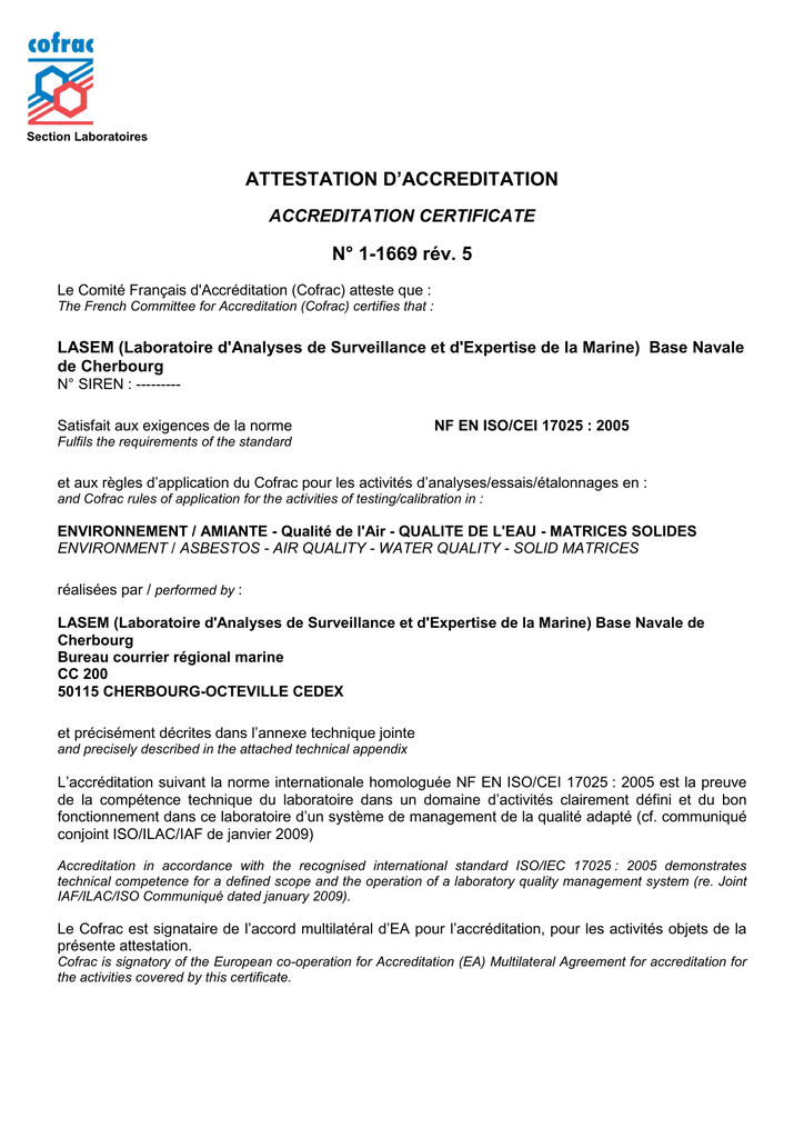 ATTESTATION D`ACCREDITATION N° 1-1669 rév. 4