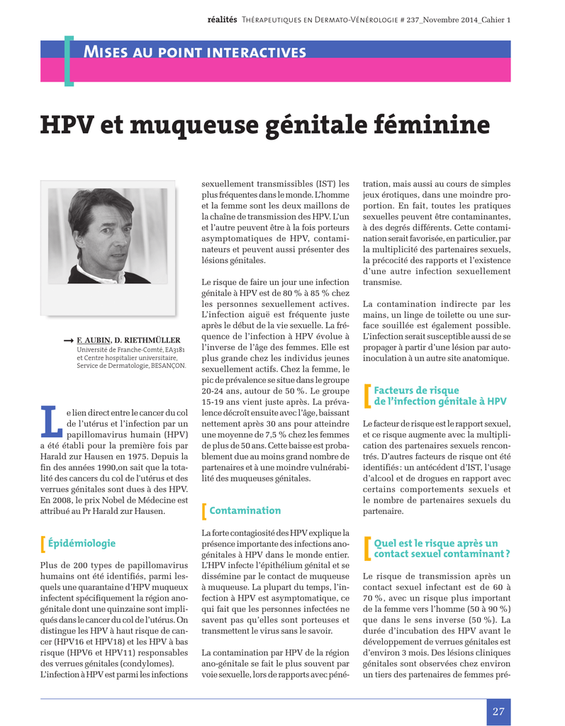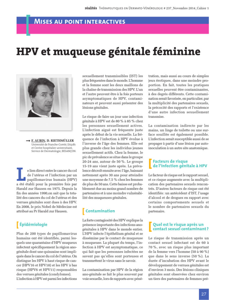 réalités Thérapeutiques en Dermato-Vénérologie # 237_Novembre 2014_Cahier 1 Mises au point interactives HPV et muqueuse génitale féminine sexuellement transmissibles (IST) les plus fréquentes dans le monde. L’homme et la femme sont les deux maillons de la chaîne de transmission des HPV. L’un et l’autre peuvent être à la fois porteurs asymptomatiques de HPV, contaminateurs et peuvent aussi présenter des lésions génitales. ➞F. AUBIN, D. RIETHMÜLLER Université de Franche-Comté, EA3181 et Centre hospitalier universitaire, Service de Dermatologie, BESANÇON. L e lien direct entre le cancer du col de l’utérus et l’infection par un papillomavirus humain (HPV) a été établi pour la première fois par Harald zur Hausen en 1975. Depuis la fin des années 1990,on sait que la totalité des cancers du col de l'utérus et des verrues génitales sont dues à des HPV. En 2008, le prix Nobel de Médecine est attribué au Pr Harald zur Hausen. [ Épidémiologie Plus de 200 types de papillomavirus humains ont été identifiés, parmi lesquels une quarantaine d’HPV muqueux infectent spécifiquement la région anogénitale dont une quinzaine sont impliqués dans le cancer du col de l’utérus. On distingue les HPV à haut risque de cancer (HPV16 et HPV18) et les HPV à bas risque (HPV6 et HPV11) responsables des verrues génitales (condylomes). L’infection à HPV est parmi les infections Le risque de faire un jour une infection génitale à HPV est de 80 % à 85 % chez les personnes sexuellement actives. L’infection aiguë est fréquente juste après le début de la vie sexuelle. La fréquence de l’infection à HPV évolue à l’inverse de l’âge des femmes. Elle est plus grande chez les individus jeunes sexuellement actifs. Chez la femme, le pic de prévalence se situe dans le groupe 20-24 ans, autour de 50 %. Le groupe 15-19 ans vient juste après. La prévalence décroît ensuite avec l’âge, baissant nettement après 30 ans pour atteindre une moyenne de 7,5 % chez les femmes de plus de 50 ans. Cette baisse est probablement due au moins grand nombre de partenaires et à une moindre vulnérabilité des muqueuses génitales. [ Contamination La forte contagiosité des HPV explique la présence importante des infections anogénitales à HPV dans le monde entier. L’HPV infecte l’épithélium génital et se dissémine par le contact de muqueuse à muqueuse. La plupart du temps, l’infection à HPV est asymptomatique, ce qui fait que les personnes infectées ne savent pas qu’elles sont porteuses et transmettent le virus sans le savoir. La contamination par HPV de la région ano-génitale se fait le plus souvent par voie sexuelle, lors de rapports avec péné- tration, mais aussi au cours de simples jeux érotiques, dans une moindre proportion. En fait, toutes les pratiques sexuelles peuvent être contaminantes, à des degrés différents. Cette contamination serait favorisée, en particulier, par la multiplicité des partenaires sexuels, la précocité des rapports et l’existence d’une autre infection sexuellement transmise. La contamination indirecte par les mains, un linge de toilette ou une surface souillée est également possible. L’infection serait susceptible aussi de se propager à partir d’une lésion par autoinoculation à un autre site anatomique. de risque [ Fdeacteurs l’infection génitale à HPV Le facteur de risque est le rapport sexuel, et ce risque augmente avec la multiplication des partenaires sexuels rencontrés. D’autres facteurs de risque ont été identifiés : un antécédent d’IST, l’usage d’alcool et de drogues en rapport avec certains comportements sexuels et le nombre de partenaires sexuels du partenaire. uel est le risque après un [ Qcontact sexuel contaminant ? Le risque de transmission après un contact sexuel infectant est de 60 à 70 %, avec un risque plus important de la femme vers l’homme (50 à 90 %) que dans le sens inverse (50 %). La durée d’incubation des HPV avant le développement de verrues génitales est d’environ 3 mois. Des lésions cliniques génitales sont observées chez environ un tiers des partenaires de femmes pré- 27 réalités Thérapeutiques en Dermato-Vénérologie # 237_Novembre 2014_Cahier 1 Mises au point interactives sentant des condylomes acuminés. Si la présence de lésions péniennes et/ou de portage de HPV apparaît élevée chez les hommes partenaires de femmes ayant des lésions à HPV génitales, les génotypes de HPV détectés au niveau du pénis et du col utérin ne sont pas toujours identiques. Une autre proportion de ces infections se manifestera sous la forme de dysplasie du col de l’utérus, et d’autres cas moins fréquents évolueront vers des cancers du col de l’utérus. Le cancer du col de l’utérus est le second cancer le plus fréquent après le cancer du sein chez la jeune femme (15-44 ans). [ Les HPV provoquent également des lésions précancéreuses de la vulve, du vagin et de l’anus chez la femme. Chez l’homme, les types d’HPV à haut risque causent des lésions précancéreuses et cancéreuses du pénis et de l’anus ; chez l’homme et la femme, ils sont également associés à environ 30 % des cancers oropharyngés et 10 % des cancers de la cavité orale et du larynx. É volution spontanée d’une infection à HPV La plupart des infections génitales à HPV vont rester asymptomatiques, sans manifestation clinique et disparaître spontanément grâce à une réponse immunitaire efficace. L’élimination virale naturelle spontanée s’effectue en quelques mois et dans plus de 90 % des cas dans les 24 mois. Elle est plus rapide chez les adolescentes, tandis que l’infection des femmes plus âgées a tendance à persister. Les mécanismes en cause ne sont pas bien connus. Le génotype HPV16 possède une capacité de persistance plus importante que les autres génotypes, observation cohérente avec le fait que ce type d’HPV présen