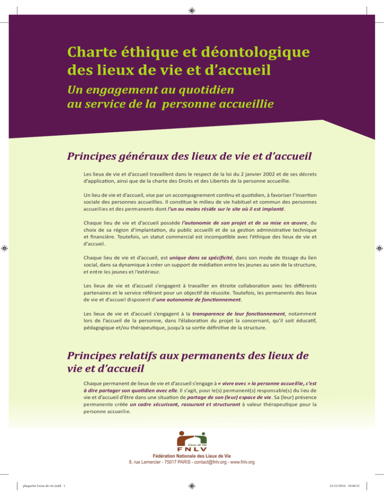 >ĞƐůŝĞƵdžĚĞǀŝĞĞƚĚ͛ĂĐĐƵĞŝůƚƌĂǀĂŝůůĞŶƚĚĂŶƐůĞƌĞƐƉĞĐƚĚĞůĂůŽŝĚƵϮũĂŶǀŝĞƌϮϬϬϮĞƚĚĞƐĞƐĚĠĐƌĞƚƐ Ě͛ĂƉƉůŝĐĂƟŽŶ͕ĂŝŶƐŝƋƵĞĚĞůĂĐŚĂƌƚĞĚĞƐƌŽŝƚƐĞƚĚĞƐ>ŝďĞƌƚĠƐĚĞůĂƉĞƌƐŽŶŶĞĂĐĐƵĞŝůůŝĞ͘ hŶůŝĞƵĚĞǀŝĞĞƚĚ͛ĂĐĐƵĞŝů͕ǀŝƐĞƉĂƌƵŶĂĐĐŽŵƉĂŐŶĞŵĞŶƚĐŽŶƟŶƵĞƚƋƵŽƟĚŝĞŶ͕ăĨĂǀŽƌŝƐĞƌů͛ŝŶƐĞƌƟŽŶ ƐŽĐŝĂůĞĚĞƐƉĞƌƐŽŶŶĞƐĂĐĐƵĞŝůůŝĞƐ͘/ůĐŽŶƐƟƚƵĞůĞŵŝůŝĞƵĚĞǀŝĞŚĂďŝƚƵĞůĞƚĐŽŵŵƵŶĚĞƐƉĞƌƐŽŶŶĞƐ ŚĂƋƵĞ ůŝĞƵ ĚĞ ǀŝĞ Ğƚ Ě͛ĂĐĐƵĞŝů ƉŽƐƐğĚĞ ĐŚŽŝdž ĚĞ ƐĂ ƌĠŐŝŽŶ Ě͛ŝŵƉůĂŶƚĂƟŽŶ͕ ĚƵ ƉƵďůŝĐ ĂĐĐƵĞŝůůŝ Ğƚ ĚĞ ƐĂ ŐĞƐƟŽŶ ĂĚŵŝŶŝƐƚƌĂƟǀĞ ƚĞĐŚŶŝƋƵĞ ĞƚĮŶĂŶĐŝğƌĞ͘dŽƵƚĞĨŽŝƐ͕ƵŶƐƚĂƚƵƚĐŽŵŵĞƌĐŝĂůĞƐƚŝŶĐŽŵƉĂƟďůĞĂǀĞĐů͛ĠƚŚŝƋƵĞĚĞƐůŝĞƵdžĚĞǀŝĞĞƚ # ! " ŚĂƋƵĞůŝĞƵĚĞǀŝĞĞƚĚ͛ĂĐĐƵĞŝů͕ĞƐƚƵŶŝƋƵĞĚĂŶƐƐĂƐƉĠĐŝĮĐŝƚĠ͕ĚĂŶƐƐŽŶŵŽĚĞĚĞƟƐƐĂŐĞĚƵůŝĞŶ ƐŽĐŝĂů͕ĚĂŶƐƐĂĚLJŶĂŵŝƋƵĞăĐƌĠĞƌƵŶƐƵƉƉŽƌƚĚĞŵĠĚŝĂƟŽŶĞŶƚƌĞůĞƐũĞƵŶĞƐĂƵƐĞŝŶĚĞůĂƐƚƌƵĐƚƵƌĞ͕ $ # % & >ĞƐ ůŝĞƵdž ĚĞ ǀŝĞ Ğƚ Ě͛ĂĐĐƵĞŝů Ɛ͛ĞŶŐĂŐĞŶƚ ă ƚƌĂǀĂŝůůĞƌ ĞŶ ĠƚƌŽŝƚĞ ĐŽůůĂďŽƌĂƟŽŶ ĂǀĞĐ ůĞƐ ĚŝīĠƌĞŶƚƐ ƉĂƌƚĞŶĂŝƌĞƐĞƚůĞƐĞƌǀŝĐĞƌĠĨĠƌĂŶƚƉŽƵƌƵŶŽďũĞĐƟĨĚĞƌĠƵƐƐŝƚĞ͘dŽƵƚĞĨŽŝƐ͕ůĞƐƉĞƌŵĂŶĞŶƚƐĚĞƐůŝĞƵdž ƵŶĞĂƵƚŽŶŽŵŝĞĚĞĨŽŶĐƟŽŶŶĞŵĞŶƚ ' # # >ĞƐ ůŝĞƵdž ĚĞ ǀŝĞ Ğƚ Ě͛ĂĐĐƵĞŝů Ɛ͛ĞŶŐĂŐĞŶƚ ă ůĂ ƚƌĂŶƐƉĂƌĞŶĐĞ ĚĞ ůĞƵƌ ĨŽŶĐƟŽŶŶĞŵĞŶƚ ůŽƌƐ ĚĞ ů͛ĂĐĐƵĞŝů ĚĞ ůĂ ƉĞƌƐŽŶŶĞ͕ ĚĂŶƐ ů͛ĠůĂďŽƌĂƟŽŶ ĚƵ ƉƌŽũĞƚ ůĂ ĐŽŶĐĞƌŶĂŶƚ͕ ƋƵ͛ŝů ƐŽŝƚ ĠĚƵĐĂƟĨ͕ ƉĠĚĂŐŽŐŝƋƵĞĞƚͬŽƵƚŚĠƌĂƉĞƵƟƋƵĞ͕ũƵƐƋƵ͛ăƐĂƐŽƌƟĞĚĠĮŶŝƟǀĞĚĞůĂƐƚƌƵĐƚƵƌĞ͘ " ŚĂƋƵĞƉĞƌŵĂŶĞŶƚĚĞůŝĞƵdžĚĞǀŝĞĞƚĚ͛ĂĐĐƵĞŝůƐ͛ĞŶŐĂŐĞă ăĚŝƌĞƉĂƌƚĂŐĞƌƐŽŶƋƵŽƟĚŝĞŶĂǀĞĐĞůůĞ ǀŝĞĞƚĚ͛ĂĐĐƵĞŝůĚ͛ġƚƌĞĚĂŶƐƵŶĞƐŝƚƵĂƟŽŶĚĞ ! ! ! ) * ) ) + ) ( , # - & & ) ) + " 1 . / 2 ) 3 . / 0 . / ͘^Ă;ůĞƵƌͿƉƌĠƐĞŶĐĞ ăǀĂůĞƵƌƚŚĠƌĂƉĞƵƟƋƵĞƉŽƵƌůĂ ) ! Fédération Nationale des Lieux de Vie 8, rue Lemercier - 75017 PARIS - [email protected] - www.fnlv.org plaquette Lieux de vie.indd 1 21/11/2014 10:40:31 >ĞƐƉĞƌŵĂŶĞŶƚƐƌĞƐƉŽŶƐĂďůĞƐƐŽŶƚĚĞƐƉĞƌƐŽŶŶĞƐƋƵŝƐ͛ĞŶŐĂŐĞŶƚăƐ͛ŝŶǀĞƐƟƌƉůĞŝŶĞŵĞŶƚ ĂƵƌĞŐĂƌĚĚƵƉƌŽũĞƚĚ͛ĂĐĐƵĞŝů͘>ĞůŝĞƵĚĞǀŝĞƉĞƌŵĞƚ ǀŝĞĂīĞĐƟǀĞ 4 >ĞƐ ƉĞƌŵĂŶĞŶƚƐ ƉƌŽƉŽƐĞŶƚ ƵŶ ĂĐĐƵĞŝů ŽƵǀĞƌƚ ƐĂŶƐ ũƵŐĞŵĞŶƚ ŶŽƌŵĂƟĨ͘ /ůƐ Ɛ͛ĞŶŐĂŐĞŶƚ ă # & 5 >ĞƐ ƉĞƌŵĂŶĞŶƚƐ ŽŶƚ ŽďůŝŐĂƟŽŶ Ě͛ĂĐĐƵĞŝůůŝƌ ůĂ ƉĞƌƐŽŶŶĞ͕ ƐĂŶƐ ĚŝƐƟŶĐƟŽŶ Ě͛ŽƌŝŐŝŶĞ͕ ĚĞ " ' " - " 6 6 >Ğ ůŝĞƵ ĚĞ ǀŝĞ Ğƚ Ě͛ĂĐĐƵĞŝů ƉƌŽƉŽƐĞ ͘ >ĞƐ ƉĞƌŵĂŶĞŶƚƐ Ɛ͛ŝŶƐĐƌŝǀĞŶƚĚĂŶƐƵŶƚƌĂǀĂŝůĚLJŶĂŵŝƋƵĞĚ͛ĂĐĐŽŵƉĂŐŶĞŵĞŶƚƉĂƌƵŶƐŽƵƟĞŶƋƵŽƟĚŝĞŶĂdžĠ # ) 7 ) ) ) 1 >Ğ ƉƌŽũĞƚ ĚĞ ĐŚĂƋƵĞ ƉĞƌƐŽŶŶĞ ĂĐĐƵĞŝůůŝĞ ǀŝƐĞ ů͛ĠůĂďŽƌĂƟŽŶ Ě͛ƵŶ ƉĂƌĐŽƵƌƐ ĂLJĂŶƚ ƉŽƵƌ ŽďũĞĐƟĨĚ͛ĂƩĞŝŶĚƌĞůĞŵĂdžŝŵƵŵĚ͛ĂƵƚŽŶŽŵŝĞ & 0 >Ğ ŵŽĚĞ ĚĞ ĨŽŶĐƟŽŶŶĞŵĞŶƚ ĚĞ ů͛ĠƋƵŝƉĞ ĚĞ ůĂ ƐƚƌƵĐƚƵƌĞ ĚŽŝƚ ĂǀĂŶƚ ƚŽƵƚ ƚĞŶŝƌ ĐŽŵƉƚĞ͕ ĚĞƐĚŝĸ ĐƵůƚĠƐƉƐLJĐŚŝƋƵĞƐĞƚĚĞƐƐŽƵīƌĂŶĐĞƐĞdžƉƌŝŵĠĞƐĞƚͬŽƵƉĞƌĕƵĞƐĐŚĞnjůĂƉĞƌƐŽŶŶĞ ŶĨŽŶĐƟŽŶĚƵƉƌŽũĞƚƐƉĠĐŝĮƋƵĞŵŝƐĞŶƈƵǀƌĞƉĂƌůĞƐƉĞƌŵĂŶĞŶƚƐĂǀĞĐĞƚƉŽƵƌĐŚĂƋƵĞ " % ' # ' 0 " 6 & ĚĞƐ ŝŶƚĞƌǀĞŶƟŽŶƐ͕ ƚŽƵƚ ĐĞ ƋƵŝ ĞƐƚ ŶĠĐĞƐƐĂŝƌĞ ƉŽƵƌ ƐŽŶ ĂďŽƵƟƐƐĞŵĞŶƚ Ğƚ ĚĞ ŵĞƩƌĞ ĞŶ ƈƵǀƌĞƚŽƵƚĞŝŶŶŽǀĂƟŽŶƵƟůĞ͘ ĂŶƐůĞĐĂĚƌĞĚĞůĞƵƌĂĐĐŽŵƉĂŐŶĞŵĞŶƚ͕ůĞƐƉĞƌŵĂŶĞŶƚƐƉĞƵǀĞŶƚĨĂŝƌĞĂƉƉĞůăĚĞƐƌĞůĂŝƐ ͘ >ĞƐ ƉĞƌŵĂŶĞŶƚƐ Ŷ͛ŝŶƚĞƌǀŝĞŶŶĞŶƚ ƋƵĞ ) ' ) ) & >ĞƐ ůŝĞƵdž ĚĞ ǀŝĞ Ğƚ Ě͛ĂĐĐƵĞŝů Ɛ͛ĞŶŐĂŐĞŶƚ ă ƌĞƐƉĞĐƚĞƌ ů͛ŝĚĞŶƟƚĠ Ğƚ ůĂ ƉĞƌƐŽŶŶĂůŝƚĠ >Ğ ĞƐƚůĞĨŽŶĚĞŵĞŶƚĚ͛ƵŶĞƉĠĚĂŐŽŐŝĞĚĞů͛ĞŶŐĂŐĞŵĞŶƚĚĞůĂƉĞƌƐŽŶŶĞ ĂĐĐƵĞŝůůŝĞ͕ ĚƵ ůŝĞƵ Ě͛ĂĐĐƵĞŝů Ğƚ ĚĞƐ ƉĂƌƚĞŶĂŝƌĞƐ ĞdžƚĠƌŝĞƵƌƐ͘ /ů ĨŽƌŵĂůŝƐĞ ůĞƐ ĞŶŐĂŐĞŵĞŶƚƐ ƌĠĐŝƉƌŽƋƵĞƐ͘>ĞƐƉĞƌŵĂŶĞŶƚƐĂƐƐƵŵĞŶƚůĂƌĞƐƉŽŶƐĂďŝůŝƚĠĚƵƉƌŽũĞƚƉĞƌƐŽŶŶĂůŝƐĠĂǀĞĐůĞ ƌĠĨĠƌĞŶƚ;Đ͛ĞƐƚͲăͲĚŝƌĞů͛ŝŶƐƟƚƵƟŽŶŐĂƌĂŶƚĞĚĞů͛ŽƌŝĞŶƚĂƟŽŶͿ͘ ) >ĞůŝĞƵĚĞǀŝĞĞƚĚ͛ĂĐĐƵĞŝůƐ͛ĞŶŐĂŐĞăƉĞƌŵĞƩƌĞăůĂƉĞƌƐŽŶŶĞĂĐĐƵĞŝůůŝĞĚ͛ĞīĞĐƚƵĞƌĚĞƐ ĐŚŽŝdžĚ͛ŽƌŝĞŶƚĂƟŽŶŵĂŝƐĂƵƐƐŝĚĞƐĞƚƌŽŵƉĞƌĞƚĚĞƌĞǀŽŝƌƐŽŶƉƌŽũĞƚŝŶŝƟĂů Fédération Nationale des Lieux de Vie 8, rue Lemercier - 75017 PARIS - [email protected] - www.fnlv.org plaquette Lieux de vie.indd 2 21/11/2014 10:40:31