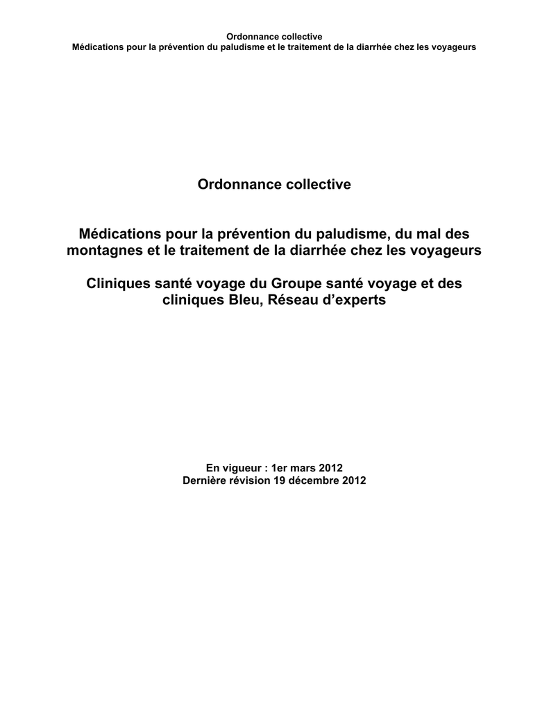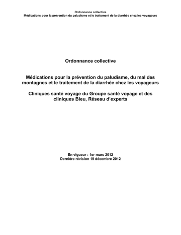 Ordonnance collective Médications pour la prévention du paludisme et le traitement de la diarrhée chez les voyageurs Ordonnance collective Médications pour la prévention du paludisme, du mal des montagnes et le traitement de la diarrhée chez les voyageurs Cliniques santé voyage du Groupe santé voyage et des cliniques Bleu, Réseau d’experts En vigueur : 1er mars 2012 Dernière révision 19 décembre 2012 Table des matières A. Buts et cibles 3 Personnel visé 3 Groupes de clients visés 3 Transmission de l’ordonnance collective aux professionnels : 3 B. Protocole 4 Formulaire de liaison 4 Médecin répondant 5 C. Médications couvertes par cette ordonnance collective 5 C.1 Schémas prophylactiques contre le paludisme 5 C.1.1 Chloroquine 6 C.1.2 Atovaquone-proguanil. (ATQ-PG) 8 C.2 Traitement d’urgence de la diarrhée 10 C.2.1 Ciprofloxacine 10 C.2.2 Azithromycine (Zithromax) 11 C.3 Prévention du mal aigu des montagnes (MAM) 12 C.3.1 Acétazolamide (Diamox) 13 D. Rédaction du formulaire de liaison et vérifications 14 Identification des professionnels 14 Identification du patient 14 E. Tenue de dossiers 14 F. Communications avec les patients, les pharmaciens et les collègues: 15 G. Médecins signataires 15 H. Site d’hébergement du protocole de l’ordonnance collective 15 I. Documentation 15 J. Signataires 16 K. Annexes 18 Annexe 1 Médicaments utilisés pour la prévention du paludisme chez les adultes et les adolescents inclus dans ce protocole. 18 Annexe 2 Médicaments utilisés pour la prévention du paludisme chez les enfants inclus dans ce protocole. 19 Annexe 3 Formulaire de liaison: Adultes et adolescents 20 Annexe 4 Formulaire de liaison: Enfants voyageurs 22 Annexe 5 Contre-indications à la chloroquine (Phosphate de CHLOROQUINE, Aralen) 24 Annexe 6 Contre-indications à l’association atovaquone-proguanil (Malarone md) 25 Annexe 7 Contre-indications à la ciprofloxacine Ciprofloxacine (Cipromd) 26 Annexe 8 Contre-indications à l’azithromycine (Zithromaxmd) 27 Annexe 9 Contre-indications à l’acétazolamide (Diamox) 28 Annexe 10 Auteurs 29 Disponible à www.cliniquesantevoyage.com/pharmaciens4 Rédigé par docteurs Dominique Tessier et Martin Brizard Dernière révision : 17 septembre 2012 2 Toute modification ou reproduction partielle ou complète est interdite sans l’autorisation des auteurs. A. Buts et cibles 1- Procédures liées à la recommandation de médications visant à prévenir le paludisme. 2- Procédures visant à la recommandation d’une médication pour le traitement d’urgence de la diarrhée du voyageur. 3- Procédures visant à la prévention du mal des montagnes Personnel visé Thao Kieu, Kate Tremblay, Guylaine Dionne et Marie-Claude Legault, infirmières travaillant aux cliniques santé voyage du Groupe santé voyage et de Bleu, Réseau d’experts. Groupes de clients visés Tout voyageur qui répond à toutes les caractéristiques suivantes : · 6 ans ou plus en bonne santé · Voyage de moins de 45 jours · Voyage touristique à une altitude la nuit de 3500 mètres ou moins · Qui fera l’achat de sa médication au Québec Transmission de l’ordonnance collective aux professionnels : Pour que les pharmaciens puissent avoir accès au besoin au protocole en lien avec le formulaire de liaisons qui leur sera remis par les patients, une copie de l’ordonnance collective à jour sera disponible sur le site du Groupe Santé voyage à www.cliniquesantevoyage.com/pharmaciens4. L’adresse url pour accéder à ce document sera indiquée sur le formulaire de liaison. Tous les pharmaciens du Québec sont habilités par l’ordonnance collective d’un établissement ou d’une clinique. Disponible à www.cliniquesantevoyage.com/pharmaciens4 Rédigé par docteurs Dominique Tessier et Martin Brizard Dernière révision : 17 septembre 2012 3 B. Protocole L’infirmière doit s’assurer qu’elle a la compétence requise, soit les connaissances, les habiletés et le jugement clinique en lien avec cette ordonnance collective. Elle doit avoir des connaissances suffisantes et spécifiques à la médication recommandée, incluant : · Indications · Effets secondaires · Contre-indications · Interactions médicamenteuses · Doses et posologies recommandées · Précautions à prendre · Éléments à surveiller pendant ou après la prise du médicament · Tout autre facteur qui pourrait être pertinent Une infirmière doit toujours connaître les effets secondaires du médicament qu’elle recommande ou administre. Formation spécifique obligatoire : Les infirmières visées par cette ordonnance collective ont reçu une formation spécifique avant d’appliquer cette ordonnance collective. Pour maintenir son autorisation, l’infirmière devra assister à une mise à jour annuelle de cette formation et maintenir ses connaissances générales en santé des voyageurs. Formulaire de liaison Le formulaire de liaison est le document rempli par l’infirmière lors de la consultation. Ce formulaire doit comprendre les informations suivantes : · La date de la consultation; · L’identité de la personne (nom et date de naissance); · Les médications recommandées avec leur posologie précise et la quantité requise; · L’identité de l’infirmière ayant fait l’évaluation (nom, numéro de permis) ainsi que sa signature et le numéro téléphone où elle peut être jointe; · L’identité du médecin répondant (nom, numéro de permis) ainsi que le numéro de téléphone où il peut être joint; · Le lieu d’hébergement de l’ordonnance collective pour consultation par le pharmacien. L’original du formulaire de liaison doit être remis au pharmacien par la personne. Le nom de toutes les médications recommandées doit être inscrit sur le formulaire de liaison et doit apparaître au dossier du patient. Disponible à www.cliniquesantevoyage.com/pharmaciens4 Rédigé par docteurs Dominique Tessier et Martin Brizard Dernière révision