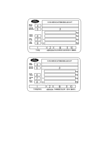 PREFACE - SIERRA 87 LE PRESENT CATALOGUE DE PIECES DETACHEES CONTIENT DES RENSEIGNEMENTS SUR LE MODELE "SIERRA 87" CONSTRUIT A PARTIR DE "0187" LES MODELES SPECIAUX DE CE VEHICULE SONT DONNES CI-DESSOUS. POUR PLUS DE CLARTE, LES MODELES DE BASE APPROPRIES, SUR LESQUELS SONT FONDES LES MODELES SPECIAUX, APPARAISSENT AUSSI SUR LA LISTE. LHD MODELE SPECIAL COSWORTH AZUR TOURING SX SAPHIR COUNTRY LHD MODELE DE BASE GHIA CL CLX CL CLX CLX RHD MODELE SPECIAL COSWORTH 2000E GLS LASER CLASSIC COUNTRY CHASSEUR GT GLX RHD MODELE DE BASE GHIA GHIA GL LX LX LX LX LX GL CODES FIGURANT SUR LA PLAQUE CONSTRUCTEUR (CEE) - SIERRA 87 1 = TYPE BBG BBG4 BFG(BFC)* BFGC BAG(BAC)* BAG4 GBG GBG4 BERLINE 3 PORTES BERLINE 3 PORTES TOUTES ROUES MOTRICES BERLINE 4 PORTES BERLINE 4 PORTES RS-COSWORTH BERLINE 5 PORTES BERLINE 5 PORTES TOUTES ROUES MOTRICES BERLINE 3/4/5 PORTES UNIQUEMENT POUR LE MARCHE ALLEMAND BERLINE 3/5 PORTES TOUTES ROUES MOTRICES UNIQUEMENT POUR LE MARCHE ALLEMAND BNG BREAK BNG4 BREAK TOUTES ROUES MOTRICES * CODE DE TYPE INCORRECT UTILISE PAR ERREUR POUR QUELQUES VEHICULES 2 = VERSION (UNIQUEMENT POUR L'ITALIE ET LA FRANCE) 3 = NUMERO DE CHASSIS * A WFO B B C XX D G E B F B G A C HC 0001 H K * A - LES ASTERISQUES FONT PARTIE DU NUMERO B - CODE MONDIAL DE CONSTRUCTEUR SFA WFO VS6 UN1 XLC TW2 FORD MOTOR COMPANY LTD. BRENTWOOD (ESSEX) U.K. (ROYAUME-UNI) FORD-WERKE AKTIENGESELLSCHAFT, D-5000 KOELN (COLOGNE), ALLEMAGNE FORD ESPANA S.A., ALMUSAFES, ESPAGNE HENRY FORD & SON LTD., CORK, IRLANDE FORD NETHERLAND N.V., AMSTERDAM, PAYS-BAS FORD LUSITANA S.A.R.L., AZAMBUJA, PORTUGAL C - VARIANTE DE MODELE A B C D E F L N T V BERLINE 5 PORTES BERLINE 3 PORTES (VERSION A 4 MONTANTS) COUPE 2 PORTES BREAK 2 PORTES / BREAK 3 PORTES BERLINE 3 PORTES (VERSION A 3 MONTANTS) BERLINE 4 PORTES CABRIOLET BREAK 4 PORTES / BREAK 5 PORTES BERLINE 2 PORTES CAMIONNETTE D - CONSTANTE "XX" E - PAYS D'ORIGNE B G W C FORD MOTOR COMPANY LTD. BRENTWOOD (ESSEX), U.K. (ROYAUME-UNI) FORD-WERKE AKTIENGESELLSCHAFT, D-5000 KOELN, ALLEMAGNE FORD ESPANA S.A., ALMUSAFES, ESPAGNE FORD LUSITANA S.A.R.L., AZAMBUJA, PORTUGAL F - LIEU D'ASSEMBLAGE A B C K M P COLOGNE / DAGENHAM GENK / HALEWOOD SAARLOUIS / LANGLEY RHEINE RHEINE (FEDERAL SIERRA) VALENCIA / AZAMBUJA G - MODELE A = ESCORT / ORION B = TAUNUS / CORTINA / SIERRA E = CAPRI F = FIESTA G = GRANADA / SCORPIO H - DATE DE CONSTRUCTION 1ERE LETTRE = ANNEE DE FABRICATION 2E LETTRE = MOIS DE FABRICATION JANVIER FEVRIER MARS AVRIL MAI JUIN JUILLET AOUT SEPTEMBRE OCTOBRE NOVEMBRE DECEMBRE G 1986 L Y S T J U M P B R A G H 1987 C K D E L Y S T J U M P I 1988 B R A G C K D G L Y S T J 1989 J U M P B R A E C K D E L 1990 L Y S T J U M P B R A G M 1991 C K D E L Y S T J U M P N 1992 B R A G C K D E L Y S T P 1993 J U M P B R A G C K D E K - NUMERO DE SEQUENCE QUI EST ASSIGNE CONSECUTIVEMENT DE 00001 A 99999 4 = CONDUITE 1 ou A 2 ou B LHD (CONDUITE A GAUCHE) RHD (CONDUITE A DROITE) 5 = MOTEUR MOTEUR EN LIGNE A ESSENCE 1ERE LETTRE CYLINDREE 2E LETTRE F L R 1400CC 1600CC 1800CC E/P/2/8 4/6/9 5 N 2000CC S TYPE DE MOTEUR HAUTE COMPRESSION MOTEUR A INJECTION MOTEUR A INJECTION AVEC TURBOCOMPRESSEUR MOTEUR ECONOMIQUE A ESSENCE MOTEUR EN V A ESSENCE 1ERE LETTRE P B CYLINDREE 2E LETTRE 2800CC 2900CC R/4 TYPE DE MOTEUR MOTEUR A INJECTION MOTEUR EN LIGNE DIESEL 1ERE LETTRE Y CYLINDRE E 2300CC 2E LETTRE T TYPE DE MOTEUR SANS INDICATION 6 = BOITE DE VITESSES 3/E/N 8/F/L G BOITE A 4 VITESSES A COMMANDE MANUELLE BOITE A 5 VITESSES A COMMANDE MANUELLE BOITE DE VITESSES A COMMANDE AUTOMATIQUE 7 = PONT AR M A V U 3 D 3.14 3.36 3.38 3.62 3.64 3.92 8 = COLORIS 1ER CARACTERE 0 1 2 3 4 4 5 6 7 8 A B D E F G H J J K L M M N P Q R S T T U U V V V X X Y STYLE CODE COLORIS DE CARROSSERIE ROUGE SEPIA - MET ROUGE TREVISE - MET BLEU BAVAROIS BLEU BOREAL - MET ROUGE ORLANDO - MET VERT NORDIQUE - MET BLEU ZANDVOORT - MET ARGENT POLAIRE - MET EBENE - MET SABLE DORE - MET NOIR BLANC DIAMANT BLEU GALAXIE ROUGE ANDALOU BLEU OUTREMER BRUN MAYA - MET BLANC IVOIRE BRUN YUCATAN - MET BLEU BAHAMAS - MET BLEU LAGON - MET VERT BORNEO - MET JAUNE FLORIDE BLEU VOLCANIQUE - MET VERT LAGUNE - MET ROUGE MONZA GRIS MERCURE - MET ROUGE ORIENT GRIS – MET GRIS ANTHRACITE - MET BLEU DEAUVILLE - MET BLEU DANUBE - MET ROUGE PLATINE GRIS ARGENT - MET BLEU VERT POIVRE - MET BORDEAUX – MET COLORIS SPECIAL XSC NZJNCWWA NYYWAXXA NZAFAXXA NEMTAXXA NYBBCWWA NLCQCWWA NEDZAXXA NKGYAXXA NRHYEWWA 2080 2159 2439 2153 1803 2334 1903 2431 2409 2231 632 691 2101 2097 2009 2164 2026 2022 2236 2155 2240 2002 2361 2398 2251 2076 1933 2455 2228 2482 2078 2489 946 1056 2497 2083 2472 0187-0293 0888-0891 0890-0293 0287-0293 0187-1089 0491-0293 0187-0890 0890-0293 0890-0293 0189-0890 0187-0293 0187-0293 0187-0891 0189-0891 0187-0890 0888-0293 0187-0293 0187-0889 1089-0293 0888-0293 0888-0190 0187-0887 0190-0293 0890-0192 0888-0293 0187-0891 0187-0888 0891-0293 0888-0890 0192-0293 0187-1189 0891-0293 0187-0890 0187-0890 0891-0293 0187-1088 0891-0293 2 CARACTERE = ANNEE D’INTRODUCTION DU COLORIS 2E CARACTERE ANNEE D'INTRODUCTION DU COLORIS 2 3 4 ETC. 1982 1983 1984 ETC. 9 = GARNISSAGES 1ER CARACTERE 0 1 2 C D F J L M N Q S U V COLORIS ROUGE PIMENTO BLEU MEDICI BORDEAUX BLEU BLEU MARINE BLEU GRIS CLAIR CANNELLE BRUN ISARD GRIS ACIER JAIS GRIS ACIER GRIS REQUIN 2E CARACTERE A B D D D G H J L M P Q R R S U V X Z 1 1 1 2 2 5 6 6 7 7 8 9 MATERIAU VINYL FIFE/PLAIN FIFE TRURO STROBE/CASHMERE TRURO STROBE/STROBE TRURO STROBE/ANGORA FOCUS/ANGORA SPACE/ANGORA HELIX/PLAIN HELIX APOLLO/ANGORA LORENZO MONACO/PLAIN HELIX ASTRAL/ANGORA SAVOY/CASHMERE MIAMI HALLEY/ANGORA HALLEY/ANGORA SPA/PLAIN RAINBOW LEATHER ZOLDA/ANGORA ASTRAL/CASHMERE ASTRAL/CASHMERE ASTRAL II HALLEY/ANGORA ROMA/CASHMERE BARCELONA/PLAIN HELIX ASTRAL/ANGORA ASTRAL/CASHMERE ZOLDA/ANGORA ZOLDA II CHEQUERS/PLAIN CHEQUERS MADRID/ANGORA 0882-0293 1084-0887 1084-0887 0386-0187 0887-0190 0490-0293 0891-0293 0187-0888 0190-0293 0883-0888 0187-0293 0190-0293 0883-0887 0592-0293 0190-0293 0887-0891 0884-0887 1188-0293 0190-029