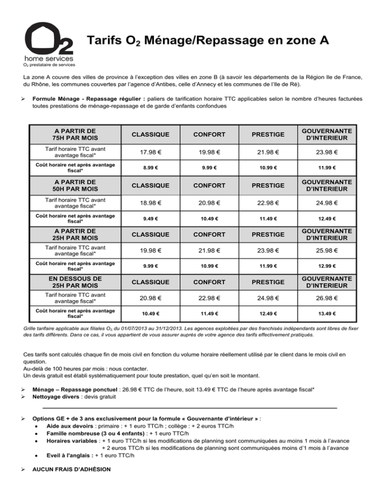 Tarifs O2 Ménage/Repassage en zone A O2 prestataire de services La zone A couvre des villes de province à l’exception des villes en zone B (à savoir les départements de la Région Ile de France, du Rhône, les communes couvertes par l’agence d’Antibes, celle d’Annecy et les communes de l’Ile de Ré). Formule Ménage - Repassage régulier : paliers de tarification horaire TTC applicables selon le nombre d’heures facturées toutes prestations de ménage-repassage et de garde d’enfants confondues A PARTIR DE 75H PAR MOIS CLASSIQUE CONFORT PRESTIGE GOUVERNANTE D’INTERIEUR Tarif horaire TTC avant avantage fiscal* 17.98 € 19.98 € 21.98 € 23.98 € Coût horaire net après avantage fiscal* 8.99 € 9.99 € 10.99 € 11.99 € A PARTIR DE 50H PAR MOIS CLASSIQUE CONFORT PRESTIGE GOUVERNANTE D’INTERIEUR Tarif horaire TTC avant avantage fiscal* 18.98 € 20.98 € 22.98 € 24.98 € Coût horaire net après avantage fiscal* 9.49 € 10.49 € 11.49 € 12.49 € A PARTIR DE 25H PAR MOIS CLASSIQUE CONFORT PRESTIGE GOUVERNANTE D’INTERIEUR Tarif horaire TTC avant avantage fiscal* 19.98 € 21.98 € 23.98 € 25.98 € Coût horaire net après avantage fiscal* 9.99 € 10.99 € 11.99 € 12.99 € EN DESSOUS DE 25H PAR MOIS CLASSIQUE CONFORT PRESTIGE GOUVERNANTE D’INTERIEUR Tarif horaire TTC avant avantage fiscal* 20.98 € 22.98 € 24.98 € 26.98 € Coût horaire net après avantage fiscal* 10.49 € 11.49 € 12.49 € 13.49 € Grille tarifaire applicable aux filiales O2, du 01/07/2013 au 31/12/2013. Les agences exploitées par des franchisés indépendants sont libres de fixer des tarifs différents. Dans ce cas, il vous appartient de vous assurer auprès de votre agence des tarifs effectivement pratiqués. Ces tarifs sont calculés chaque fin de mois civil en fonction du volume horaire réellement utilisé par le client dans le mois civil en question. Au-delà de 100 heures par mois : nous contacter. Un devis gratuit est établi systématiquement pour toute prestation, quel qu’en soit le montant. Ménage – Repassage ponctuel : 26.98 € TTC de l’heure, soit 13.49 € TTC de l’heure après avantage fiscal* Nettoyage divers : devis gratuit Options GE + de 3 ans exclusivement pour la formule « Gouvernante d’intérieur » : Aide aux devoirs : primaire : + 1 euro TTC/h ; collège : + 2 euros TTC/h Famille nombreuse (3 ou 4 enfants) : + 1 euro TTC/h Horaires variables : + 1 euro TTC/h si les modifications de planning sont communiquées au moins 1 mois à l’avance + 2 euros TTC/h si les modifications de planning sont communiquées moins d’1 mois à l’avance Eveil à l'anglais : + 1 euro TTC/h AUCUN FRAIS D’ADHÉSION Avantage fiscal : O2 étant agréée par la Préfecture, nos clients peuvent bénéficier d’éventuels avantages fiscaux de 50 % des sommes dépensées (selon la loi fiscale en vigueur, sous réserve de modification de la législation ; art. 199 sexdecies du Code Général des Impôts). Conditions et modes de paiement acceptés : Pour le ménage-repassage régulier, les moyens de paiement sont : Prélèvement automatique: le règlement des prestations du mois s’effectue à la quinzaine avec : - Un premier prélèvement le 20 du mois, afférent au nombre d’heures de prestations réalisées pour la période allant du 01 au 14 du mois, - La facture, émise le dernier jour du mois, informe le client de l’ensemble des heures réalisées du mois, - Un second prélèvement portant sur le solde Net à Payer sera réalisé le 07 du mois suivant. - Chèques Emploi Service Universel (CESU) préfinancés : - Qu’il s’agisse de CESU papier ou en cas de recours à un système de dématérialisation des CESU, ces derniers devront être parvenus au centre administratif du Mans avant le 20 du mois des prestations pour être pris en compte. La preuve de la réception des CESU et des informations dématérialisées est à la charge du client. - Tout paiement des prestations en CESU sera encaissé et non remboursable. - En l’absence de réception des CESU dans les délais susvisés, ou en cas de montant insuffisant de ces derniers : Le prélèvement automatique complètera le paiement mensuel de la facture, si le client a choisi le prélèvement automatique comme moyen de paiement combiné. L’envoi du chèque par le client complètera le paiement mensuel de la facture, si le client a choisi le chèque comme moyen de paiement combiné, et ce dès la réception de la facture. Ce moyen de paiement entraîne une facturation de frais de paiement de 3 € TTC par mois et le versement à la signature du contrat d’une caution équivalente à 5 semaines de prestations. Pour le ménage-repassage ponctuel, les moyens de paiement sont : CESU + chèque bancaire Chèque bancaire seul Le paiement est effectif à la commande. Frais de gestion de 3 € TTC offerts. Frais kilométriques : - Absence de frais de transport pour les interventions ne nécessitant pas l’utilisation d’un véhicule pour se rendre sur les lieux de la prestation. - Pour les interventions nécessitant l’utilisation d’un véhicule pour se rendre sur les lieux de la prestation (situées dans des lieux éloignés des lignes régulières de transport en commun ou difficiles d’accès), facturation forfaitaire de 3 € TTC par intervention (1.50 € TTC après avantage fiscal*) au titre de la participation aux frais de transport. - Pour les déplacements effectués par l’intervenant pendant sa prestation, une facturation de 0,39 € TTC par kilomètre parcouru est appliquée. Sinistres : En cas de sinistres (détérioration, casse, …) pour lesquels notre responsabilité est avérée, nous nous engageons à dédommager nos clients après l’application d’une franchise : Formules d’abonnement Ménage-Repassage : - Ménage Gouvernante d’Intérieur : 0 € TTC - Ménage Prestige : 0 € TTC - Ménage Confort : 30 € TTC - Ménage Classique : 60 € TTC Formule de recours 