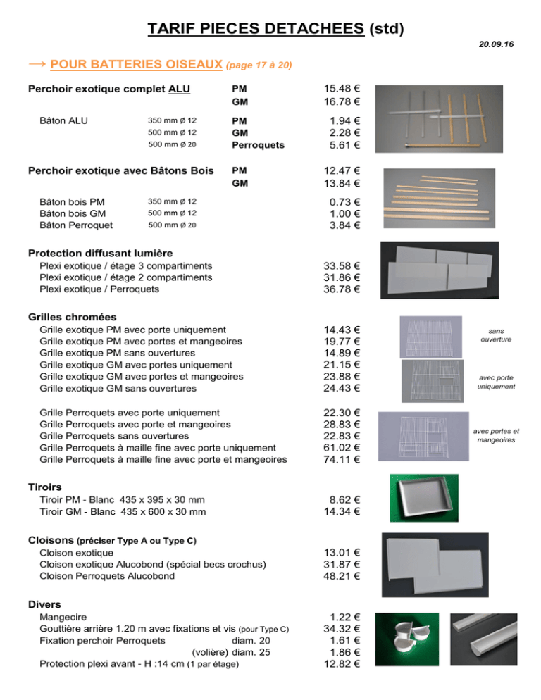 TARIF PIECES DETACHEES (std) 20.09.16 → POUR BATTERIES OISEAUX (page 17 à 20) Perchoir exotique complet ALU Bâton ALU 350 mm Ø 12 500 mm Ø 12 500 mm Ø 20 Perchoir exotique avec Bâtons Bois Bâton bois PM Bâton bois GM Bâton Perroquets PM GM PM GM Perroquets PM GM 350 mm Ø 12 500 mm Ø 12 500 mm Ø 20 15.48 € 16.78 € 1.94 € 2.28 € 5.61 € 12.47 € 13.84 € 0.73 € 1.00 € 3.84 € Protection diffusant lumière Plexi exotique / étage 3 compartiments Plexi exotique / étage 2 compartiments Plexi exotique / Perroquets 33.58 € 31.86 € 36.78 € Grilles chromées Grille exotique PM avec porte uniquement Grille exotique PM avec portes et mangeoires Grille exotique PM sans ouvertures Grille exotique GM avec portes uniquement Grille exotique GM avec portes et mangeoires Grille exotique GM sans ouvertures 14.43 € 19.77 € 14.89 € 21.15 € 23.88 € 24.43 € Grille Perroquets avec porte uniquement Grille Perroquets avec porte et mangeoires Grille Perroquets sans ouvertures Grille Perroquets à maille fine avec porte uniquement Grille Perroquets à maille fine avec porte et mangeoires 22.30 € 28.83 € 22.83 € 61.02 € 74.11 € Tiroirs Tiroir PM - Blanc 435 x 395 x 30 mm Tiroir GM - Blanc 435 x 600 x 30 mm 8.62 € 14.34 € Cloisons (préciser Type A ou Type C) Cloison exotique Cloison exotique Alucobond (spécial becs crochus) Cloison Perroquets Alucobond 13.01 € 31.87 € 48.21 € Divers Mangeoire Gouttière arrière 1.20 m avec fixations et vis (pour Type C) Fixation perchoir Perroquets diam. 20 (volière) diam. 25 Protection plexi avant - H :14 cm (1 par étage) 1.22 € 34.32 € 1.61 € 1.86 € 12.82 € sans ouverture avec porte uniquement avec portes et mangeoires → POUR BATTERIES POISSONS (pages 7 à 12 ) Sonde PTC avec doigt de gant inox / régulateur électronique 38.00 € Mousse bleu filtration - 31.5 x 10.3 x 9 cm - T 20 Filtren 5.50 € Robinet air (plastique) 0.72 € Exhausteur à chambre 14.16 € Flacon seul / exhauster 4.08 € Lot de 10 joints de vidange plats (vendus par 10) 11.13 € Lot de 10 joints de vidange torique silicone (vendus par 10) 13.33 € Ensemble de 20 goutteurs noirs réglables 12.92 € Canne de vidange (ancienne ou nouvelle) 10.53 € Ressort de battant de porte 1.82 € Cartouche de Silicone - V 23/1 9.51 € Cartouche de Silicone - PVC 796 5.15 € Chauffage 50 W 10.75 € Chauffage 100 W 11.23 € Glissière ABS supportant couvercles verre 4.75 € (à préciser simple ou double, cuve droite ou inclinée) Jeu de 2 couvercles coulissants verre 4 mm (cuve droite ou inclinée) 1 compartiment 17.32 € 2 compartiments 13.99 € 3 compartiments 10.79 € 4 compartiments 10.69 € → POUR ILOTS RONGEURS (page 24 à 33) Divers 1.67 € 1.95 € 9.01 € 26.60 € Biberons 250 ml Biberons 500 ml Mini cadenas (clé identique) Serrure (clé identique) Grille chromée supérieure : Rongeurs N°1 " N°2, Diamant et N° 6 " N°4 Parc / Lapins N°1 Parc / Lapins N°4 33.18 € 17.00 € 23.65 € 57.67 € 23.65 € 730 x 357 mm 436 x 350 mm 700 x 345 mm 744 x 730 mm 700 x 345 mm rongeurs N°1 rongeurs N° 2, Diamant et N° 6 Grille aération basse - Tôle INOX perforée : Display rongeurs Rongeurs N°1 Rongeurs N°4 Rongeurs N°2 (prix pour 1 compartiment) 40.30 € 20.15 € 20.93 € 15.20 € 1228 x 96 mm 306 x 96 mm 606 x 96 mm → POUR STATION D'EAU OSMOSEE (page 42) 27.04 € 29.18 € 54.67 € 126.77 € 57.10 € 68.59 € Cartouche Sédiments Cartouche Chlore Cartouche Polyphosphates Membrane Electrovanne + raccords Transfo → POUR SURPRESSEUR Cartouche / Surpresseur 36 m3/h Cartouche / Surpresseur 50 m3/h Cartouche / Surpresseur 90 m3/h Nous consulter (selon modèles) → DIVERS Serrure à crémaillère ( clé identique) Rail porteur (1 longueur de 1210 mm) Porte-étiquettes 60 x 54 mm ( par 100) 6.90 € 43.84 € 15.68 € 7.00 € 44.00 € Prix HT en euros - Départ atelier - Port en sus - Frais de préparation commande inférieure à 150 € H.T : 20 € AQUAFEELING - Le Chêne Rond - 33620 LARUSCADE T : 05.57.68.15.50 - F : 05.57.68.14.61 - Mail : [email protected] - Site : aquafeelingfrance.com