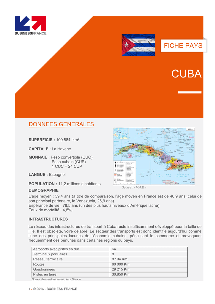 FICHE PAYS CUBA DONNEES GENERALES SUPERFICIE : 109.884 km² CAPITALE : La Havane MONNAIE : Peso convertible (CUC) Peso cubain (CUP) 1 CUC = 24 CUP LANGUE : Espagnol POPULATION : 11,2 millions d’habitants Source : « M.A.E » DEMOGRAPHIE L’âge moyen : 39,4 ans (à titre de comparaison, l’âge moyen en France est de 40,9 ans, celui de son principal partenaire, le Venezuela, 26,9 ans). Espérance de vie : 78,5 ans (un des plus hauts niveaux d’Amérique latine) Taux de mortalité : 4,8‰. INFRASTRUCTURES Le réseau des infrastructures de transport à Cuba reste insuffisamment développé pour la taille de l’île. Il est obsolète, voire délabré. Le secteur des transports est donc identifié aujourd’hui comme l’une des principales lacunes de l’économie cubaine, pénalisant le commerce et provoquant fréquemment des pénuries dans certaines régions du pays. Aéroports avec pistes en dur Terminaux portuaires Réseau ferroviaire Routes Goudronnées Pistes en terre Source: Service économique de La Havane 1 / © 2016 - BUSINESS FRANCE 64 8 8 194 Km 60 000 Km 29 215 Km 30.850 Km FICHE PAYS CUBA DONNEES POLITIQUES TYPE DE REGIME Depuis la Révolution et l’arrivée au pouvoir de Fidel Castro le 1er janvier 1959, la « République de Cuba » est qualifiée de démocratie populaire et Etat socialiste conventionnel dont le Parti communiste cubain (PCC) est le seul parti politique reconnu par la Constitution. LES PRINCIPAUX DIRIGEANTS Depuis 2008 où il a succédé officiellement à son frère, Raul Castro cumule les postes de Président du Conseil d’Etat de Cuba (organe exécutif suprême du pays) et de Président du Conseil des Ministres. Il est également le 1er Secrétaire du Parti communiste de Cuba, succédant en 2011 à Fidel Castro. Président du Conseil d'Etat et des Ministres, Premier Secrétaire du Comité central du PCC ............. Raúl Castro Ruz Premier Vice-Président du Conseil des Ministres, Membre du Bureau politique du PCC ............................ Miguel-Diaz Canel Bermudez Vice-président du Conseil des Ministres et du Comité exécutif .................................................... Ricardo Cabrisas Ruíz Second Secrétaire du Comité central du PCC, Membre du Bureau politique du PCC ............................ José Ramón Machado Ventura Ministre de l’Economie et de la Planification Vice-président du Conseil des Ministres Membre du Bureau politique du PCC et du Conseil d’Etat Marino Alberto Murillo Jorge Ministre des Affaires Etrangères, Membre du Bureau politique du PCC ............................ Bruno Eduardo Rodríguez Parrilla Ministre du Commerce extérieur et de l'investissement étranger et membre du Comité Central du PCC .......................... Rodrigo Malmierca Díaz DONNEES ECONOMIQUES EN 2015 PRINCIPAUX INDICATEURS ECONOMIQUES PAR PAYS 2015 INDICATEURS CUBA FRANCE PIB (2015) 82 Mds USD 2 423 Mds USD Déficit public (2015) -5,7% du PIB 3,5% 31,6 Mds USD (estimation 2015 EIU) 95,7% 6 920 USD (Cepal) 37 728 USD +1,3 % 2014 +4% prévu pour 2015 1,1% Dette publique (2015) PIB par habitant (2014) Taux de croissance (estimation officielle) Taux d’inflation (2015) Taux de chômage (2014) 4,4% (estimation EIU) 0% 2,7 % (estimation 2014 ONEI) 10,8% (2015) Sources : Service économique de La Havane, Cepal, Commission européenne, INSEE 2 / © 2016 - BUSINESS FRANCE FICHE PAYS CUBA SITUATION ECONOMIQUE DU PAYS Cuba représente la 1ère économie de la Caraïbe avec une croissance du PIB de +4% en 2015. L’Indice de développement humain (IDH) cubain est très élevé, 0,82 en 2015 selon le PNUD, plaçant le pays au 44ème rang mondial et au 2ème rang en Amérique latine et Caraïbes. Le système économique cubain repose sur une économie planifiée et centralisée où l’Etat est présent dans tous les secteurs d’activité. Les principaux postes de dépense de l’Etat sont l’éducation, la santé, la culture, le sport et la sécurité sociale. Ces postes concentrent à Répartition du PIB par secteurs en eux seuls environ 50% des dépenses 2014 budgétaires, laissant peu de place aux investissements consacrés au 4% renouvellement de l’appareil productif. 22% Selon plusieurs experts de l’économie cubaine, 75% du PIB dépendrait de l’Etat Agriculture cubain et l’économie informelle pourrait Industrie représenter 30% du PIB. Services L’agriculture, bien qu’ayant fait l’objet de maintes réformes depuis 2008, demeure un 74% secteur sinistré (production sucrière divisée par 8 en 10 ans par exemple) et certains produits de base viennent parfois à Source: CIA Fact Book 2014 manquer (pommes de terre, sel, œufs, lait…). Malgré des indicateurs économiques encourageants, force est de constater que Cuba sort d’une période difficile et nécessite encore de nombreuses réformes. En effet lors de l’arrivée au pouvoir en 2008 du nouveau Président Raul Castro, le pays a dû faire face à une importante crise de liquidités qui a fortement entravé la croissance économique du pays, après des années de croissance dynamique (croissance annuelle moyenne de 2,2% sur la période 2009-2014 contre 7,3% entre 2003 et 2008). Outre cette crise de liquidités, le pays a vécu une année noire au cours de laquelle deux ouragans ont détruit une partie des infrastructures et la majorité des récoltes, conduisant à une forte contraction de la production nationale dans une période de crise financière mondiale. Enfin, l’économie du pays reste fragilisée par son système administratif lourd, peu flexible, asphyxié par 50 ans d’embargo américain et dépendant de ses partenaires politiques – et, de fait, commerciaux - tels le Venezuela et le Brésil. De plus, depuis plus de 20 ans, le pays souffre de la faiblesse de la contribution de l’investissement public à la formation du PIB (9%) et de la disparition de l’URSS qui assurait l’essentiel des besoins de base du pays. L’investissement devrait contr