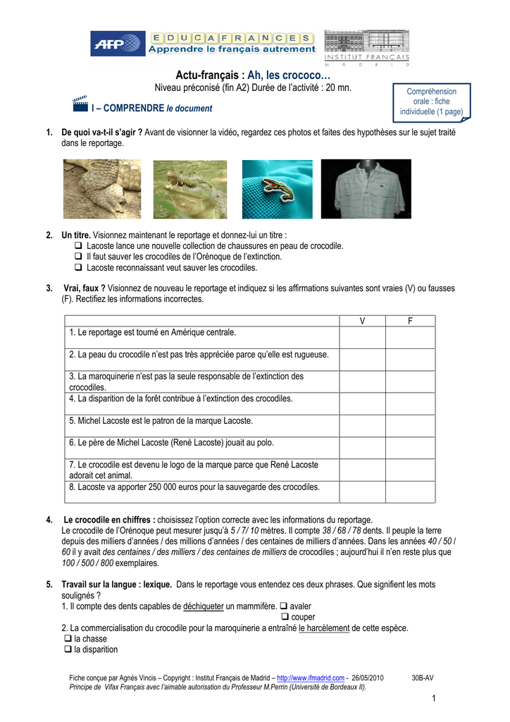 Actu-français : Ah, les crococo… Niveau préconisé (fin A2) Durée de l’activité : 20 mn. Compréhension orale : fiche individuelle (1 page) I – COMPRENDRE le document 1. De quoi va-t-il s’agir ? Avant de visionner la vidéo, regardez ces photos et faites des hypothèses sur le sujet traité dans le reportage. 2. Un titre. Visionnez maintenant le reportage et donnez-lui un titre : Lacoste lance une nouvelle collection de chaussures en peau de crocodile. Il faut sauver les crocodiles de l’Orénoque de l’extinction. Lacoste reconnaissant veut sauver les crocodiles. 3. Vrai, faux ? Visionnez de nouveau le reportage et indiquez si les affirmations suivantes sont vraies (V) ou fausses (F). Rectifiez les informations incorrectes. V F 1. Le reportage est tourné en Amérique centrale. 2. La peau du crocodile n’est pas très appréciée parce qu’elle est rugueuse. 3. La maroquinerie n’est pas la seule responsable de l’extinction des crocodiles. 4. La disparition de la forêt contribue à l’extinction des crocodiles. 5. Michel Lacoste est le patron de la marque Lacoste. 6. Le père de Michel Lacoste (René Lacoste) jouait au polo. 7. Le crocodile est devenu le logo de la marque parce que René Lacoste adorait cet animal. 8. Lacoste va apporter 250 000 euros pour la sauvegarde des crocodiles. 4. Le crocodile en chiffres : choisissez l’option correcte avec les informations du reportage. Le crocodile de l’Orénoque peut mesurer jusqu’à 5 / 7/ 10 mètres. Il compte 38 / 68 / 78 dents. Il peuple la terre depuis des milliers d’années / des millions d’années / des centaines de milliers d’années. Dans les années 40 / 50 / 60 il y avait des centaines / des milliers / des centaines de milliers de crocodiles ; aujourd’hui il n’en reste plus que 100 / 500 / 800 exemplaires. 5. Travail sur la langue : lexique. Dans le reportage vous entendez ces deux phrases. Que signifient les mots soulignés ? 1. Il compte des dents capables de déchiqueter un mammifère. avaler couper 2. La commercialisation du crocodile pour la maroquinerie a entraîné le harcèlement de cette espèce. la chasse la disparition Fiche conçue par Agnès Vincis – Copyright : Institut Français de Madrid – http://www.ifmadrid.com - 26/05/2010 Principe de Vifax Français avec l’aimable autorisation du Professeur M.Perrin (Université de Bordeaux II). 30B-AV 1 Actu-français : Ah, les crococo… Niveau préconisé (fin A2) Durée de l’activité : 40 mn. Objectif : approfondir le thème traité Prolongements pour la classe : culture, civilisation III – ALLER PLUS LOIN sur le thème Mini-dossier sur … la biodiversité Une animation sur la biodiversité menacée : Cherchez les réponses aux questions suivantes : 1. Qu’est-ce que l’IUCN ? Quelle est sa mission ? 2. Qu’est-ce que la liste rouge ? 3. Combien d’espèces menacées sont-elles présentées dans la première page ? 4. Quelle est la situation de la Méditerranée ? 5. Quelle est la situation des océans en général ? 6. Les écosystèmes : l’Espagne est-elle dans une zone stable, en danger ou sans danger ? http://tinyurl.com/33m965o 7. Quelles sont les raisons de l’importance de la biodiversité ? 8. Quelles sont les conséquences d’écosystèmes qui fonctionnent ? Un article du 24 mai 2010 : http://tinyurl.com/35sy5ty Une Journée mondiale de la Biodiversité pour compter les points en moins (24 mai 2010) Tout va plus vite que prévu et dans le mauvais sens: en dépit des engagements internationaux, la biodiversité sur terre s'érode à un rythme jamais éprouvé depuis l'apparition de l'espèce humaine. Une journée mondiale, célébrée samedi, une Année internationale (en 2010) et même un sommet de chefs d'Etat et de gouvernement, prévu en septembre à New York, n'incitent guère à la fête tant les soustractions l'emportent sur les gains. "Malheureusement, les statistiques indiquent que la biodiversité est en train de plonger", notent les Nations unies dans un rapport publié à l'occasion de la Journée de samedi, qui marque l'adoption en 1992 de la Convention sur la diversité biologique (CBD) à Rio. Ce rapport reprend les grandes lignes du document publié le 10 mai par l'ONU évoquant une tendance irréversible au-delà d'un certain seuil. Mais ce qui pourrait être selon certains scientifiques la 6ème grande extinction de l'histoire de la planète prive déjà l'humanité de services et d'outils précieux. Ainsi, 1,6 milliard d'humains dépendent du bois et des produits forestiers, alors que 13 M d'hectares de forêt disparaissent chaque année. Plus d'un milliard dépendent aussi du poisson pour leur nourriture, mais celui-ci aura disparu dans 40 ans en l'absence de restructuration profonde de la pêche, assurait lundi Pavan Sukhdev, économiste indien qui dirige l'Initiative pour une économie verte du Programme de l'ONU pour l'environnement (PNUE). Pire, on ne sait pas ce qu'on perd, relève le président du Museum d'Histoire naturelle de Paris, Gilles Boeuf: "Peut-être que l'espèce qui a disparu hier (...) contenait un puissant actif anti-tumoral. On ne l'aura pas". Tout confondu, des mammifères aux virus ou aux bactéries, végétales et animales, 1,9 million d'espèces sont à ce jour connues et décrites, or la Terre en abriterait 10 à 30 millions au total. Pour cet expert, qui évoque un rythme de perte "foudroyant", la moitié risque d'être perdue d'ici la fin de ce siècle. "On évalue le rythme actuel de perte d'espèces (...) à plus de 100 fois celui de l'extinction naturelle", insiste également l'ONU, qui désigne la perte ou la destruction d'habitat naturel comme la première cause du désastre annoncé. En cause, le développement des villes, la conversion des terres à l'agriculture, la surexploitation des ressources naturelles et l'introduction d'espèces exotiques envahissantes. (…) © 2010 Bluedeep Internacional & Agence France Presse | www.educafrances.com Lisez-le et r