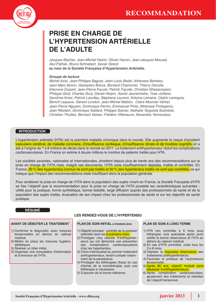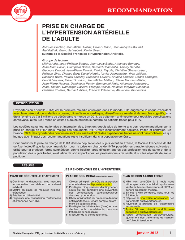 Recommandation Société Française d’HyperTension Artérielle PRISE EN CHARGE DE L’HYPERTENSION ARTéRIELLE DE L’ADULTE Jacques Blacher, Jean-Michel Halimi, Olivier Hanon, Jean-Jacques Mourad, Atul Pathak, Bruno Schnebert, Xavier Girerd au nom de la Société Française d’Hypertension Artérielle. Groupe de lecture Michel Azizi, Jean-Philippe Baguet, Jean-Louis Bedel, Athanase Benetos, Jean-Marc Boivin, Giampiero Bricca, Bernard Chamontin, Thierry Denolle, Eleonore Dupont, Jean-Pierre Fauvel, Patrick Fayolle, Christian Ghasarossian, Philippe Giral, Charles Gury, Daniel Herpin, Xavier Jeunemaitre, Yves Juilliere, Sandrine Kretz, Patrick Lacolley, Stéphane Laurent, Antoine Lemaire, Cédric Lemogne, Benoît Lequeux, Gérard London, Jean-Michel Mallion, Claire Mounier-Véhier, Jean-Pierre Nguyen, Dominique Pernin, Emmanuel Pinto, Athanase Protogerou, Jean Ribstein, Dominique Saillard, Philippe Sosner, Nathalie Targowla Scandolo, Christian Thuillez, Bernard Vaisse, Frédéric Villeneuve, Alexandra Yannoutsos Introduction L’hypertension artérielle (HTA) est la première maladie chronique dans le monde. Elle augmente le risque d’accident vasculaire cérébral, de maladie coronaire, d’insuffisance cardiaque, d’insuffisance rénale et de troubles cognitifs, et a été à l’origine de 7 à 8 millions de décès dans le monde en 2011. Le traitement antihypertenseur réduit les complications cardiovasculaires. En France on estime à douze millions le nombre de patients traités pour HTA. Les sociétés savantes, nationales et internationales, émettent depuis plus de trente ans des recommandations sur la prise en charge de l’HTA mais, malgré ces documents, l’HTA reste insuffisamment dépistée, traitée et contrôlée. En France, 20 % des hypertendus connus ne sont pas traités et 50 % des hypertendus traités ne sont pas contrôlés, ce qui indique que l’impact des recommandations reste insuffisant dans la population générale. Pour améliorer la prise en charge de l’HTA dans la population des sujets vivant en France, la Société Française d’HTA se fixe l’objectif que la recommandation pour la prise en charge de l’HTA possède les caractéristiques suivantes : utilité pour la pratique, forme synthétique, bonne lisibilité, large diffusion auprès des professionnels de santé et de la population des sujets traités, évaluation de son impact chez les professionnels de santé et sur les objectifs de santé publique. RéSUMé LES RENDEZ-VOUS DE L’HYPERTENDU AVANT DE DéBUTER LE TRAITEMENT PLAN DE SOIN INITIAL (6 PREMIERS MOIS) PLAN DE SOIN A LONG TERME 1)Confirmer le diagnostic, avec mesures tensionnelles en dehors du cabinet médical. 2)Mettre en place les mesures hygiéno diététiques. 3)Réaliser un bilan initial. 4)Organiser une consultation d’information et d’annonce de l’HTA. 1)Objectif principal : contrôle de la pression artérielle dans les 6 premiers mois. 2)Privilégier cinq classes d’antihyperter seurs qui ont démontré une prévention des complications cardiovasculaires chez les hypertendus. 3)Choix individualisé du premier traitement antihypertenseur, tenant compte notam ment de la persistance. 4)Privilégier les bithérapies (fixes) en cas d’échec de la monothérapie, puis une trithérapie si nécessaire. 5)S’assurer de la bonne tolérance. 1)HTA non contrôlée à 6 mois sous trithérapie: avis spécialisé après avoir vérifié la bonne observance et l’HTA en dehors du cabinet médical. 2)En cas d’HTA contrôlée, visite tous les 3 à 6 mois. 3)Dépister la mauvaise observance des traitements antihypertenseurs. 4)Favoriser la pratique de l’automesure tensionnelle. 5)Après 80 ans, objectif modulé sans dépasser 3 antihypertenseurs. 6)Après complication cardiovasculaire, ajustement des traitements et maintien de l’objectif tensionnel. Société Française d’Hypertension Artérielle - www. sfhta.org janvier 2013 1 Recommandation Société Française d’HyperTension Artérielle Avant de débuter le traitement Plan de soin initial (6 premiers mois) Lorsqu’une HTA est suspectée, la mise en place de mesures hygiénodiététiques ayant montré un bénéfice sur le contrôle de la pression artérielle (PA) est recommandée. Une nouvelle consultation doit être programmée dans le mois suivant. Au cours de cette consultation, seront interprétés les résultats du bilan initial biologique et des mesures de la PA en dehors du cabinet médical (automesure/MAPA). Si l’HTA est confirmée, une consultation d’information et d’annonce de l’HTA doit être réalisée. 1 - Obtenir un contrôle de la pression artérielle dans les 6 premiers mois - Les visites au cabinet médical doivent être mensuelles, jusqu’à l’obtention de l’objectif tensionnel. - L’objectif tensionnel, y compris chez les diabétiques et les patients avec maladies rénales, est d’obtenir une pression artérielle systolique comprise entre 130 et 139 mm Hg et une pression artérielle diastolique inférieure à 90 mm Hg, confirmées par une mesure de la PA en dehors du cabinet médical. - Des objectifs plus ambitieux peuvent être proposés chez certains patients, après avis spécialisé. 1 - Confirmer le diagnostic de l’HTA En consultation, une pression artérielle supérieure ou égale à 140/90 mm Hg fait suspecter une HTA. Il est recommandé de mesurer la PA en dehors du cabinet médical pour confirmer l’HTA, avant le début du traitement antihypertenseur médicamenteux (automesure ou MAPA), sauf en cas d’HTA sévère (PA supérieure ou égale à 180/110 mm Hg). 2 - Mettre en place les mesures hygiéno-diététiques (et leur suivi) : - réduire une consommation excessive de sel, - pratiquer une activité physique régulière, - réduire le poids en cas de surcharge pondérale, - réduire une consommation excessive d’alcool, - privilégier la consommation de fruits et de légumes, - interrompre une intoxication tabagique. 3 - Réal