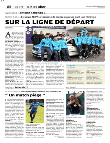 41-9 cyclisme - division nationale 1 BLOIS-CAC 41 L’équipe 2009 se compose de quinze coureurs dont une féminine SUR LA LIGNE DE DÉPART Olivier Allègre [email protected] A quinze jours de leur première course officielle, coureurs et dirigeants du BloisCAC 41 se sont retrouvés samedi, en fin de matinée, chez Mondovélo, à Vineuil. La Division nationale 1. Le Blois-CAC sera le seul représentant de l’Orléanais en DN1 (20 équipes françaises). Cette année, le VS Chartres et l’UC Orléans évolueront en DN1 espoirs ; Chalette, le CG Orléans et Saint-Cyr/Tours en DN2. Quatre recrues. Deux d’entre elles évoluaient déjà dans l’Orléanais : Alexandre Piat (SaintAmand) et David Dupont (CG Orléans). Jérémy Ortiz s’est illustré sous les couleurs du BloisCAC lors de la saison hivernale. Quant au Polonais Piotr Chudzinski, il courait au CC Villeneuve, dans l’Aisne. Lui et Michal Ladoscz rejoindront leurs coéquipiers la semaine prochaine L’effectif. L’équipe masculine sera composée de quatorze coureurs parmi lesquels huit espoirs. Les deux tiers des cyclistes du Blois-CAC ont des attaches en région Centre. Une féminine. Julie Dhéruelle portera toujours les couleurs blésoises en 2009 Coupe de France des clubs. L’an passé, le Blois-CAC s’était classé 22e de la Coupe de France. Cinq coureurs manquaient à l’appel, hier. Mais le Blois-CAC 41 devrait se présenter au complet, du 14 au 22 février, sur les routes de l’Essor basque. (Photo correspondant NR, Patrice Juin) Il espère gagner une dizaine de places c ette sai so n. Hui t manc hes f igurent a u programme : Bordeaux - Saintes (15 mars), Chrono d’Or, dans l’Indre (4 avril), Gainsbarre (18 avril), Tour du Périgord (3 mai), Val d’U Classic (14 juin), Trophée des Champions (19 juillet), Circuit des Deux-Provinces (17 août), GP de Blangy (26 septembre). Tour du Loir-et-Cher. Le Blois-CAC voudra bien sûr se montrer sur les routes du TLC, du 14 au 19 avril. Même s’il devra aussi envoyer une équipe à la Gainsbarre le samedi 18… Championnats de France. Les France sur piste se courront en Guadeloupe. Piat, Lamoisson, Maziou et Jarry pourraient être de la fête. Les championnats de France de l’Avenir se dérouleront dans la région de Vendôme, du 20 au 23 août. En attendant de savoir si des coureurs du CAC y participeront, le club loir-etchérien a décidé d’organiser une cyclosportive, le 23 au matin. rugby - fédérale 2 l’équipe LES COUREURS Ils arrivent : Alexandre Piat (RO Saint-Amand), 19 ans ; Piotr Chudzinsky (Pologne, CC Villeneuve SGSA), 21 ans ; Jérémy Ortiz (OCCV Draguignan), 22 ans ; David Dupont (CG Orléans), 35 ans. Ils restent : Guillaume Gerbaud, 20 ans ; Alexis Jarry, 20 ans ; Maël Maziou, 21 ans ; Morgan Lamoisson, 21 ans : Nicolas Loth, 22 ans ; Sébastien Boire, 22 ans ; Michal Ladosz (Pologne), 24 ans ; en bref RC BLOIS - CLAMART Edwin Momha-Bellnoun se méfie de la lanterne rouge mais en alignant sept points consécutifs dont un revers long de ligne en plein sur la ligne à 4-6. Dans la seconde manche, Robert a n’a pas eu à puiser dans ses réserves ce qui est de bon augure avant d’affronter aujourd’hui la tête de série n° 1, le Tchèque Lukas Rosol (n° 189). “ Un match piège ” C et après-midi, en match en retard, le RCB est opposé à un Clamart bien terne cette saison. Les banlieusards parisiens ne comptent qu’une victoire pour dix défaites et la relégation en Fédérale 3 leur tend les bras. L’objectif sera bien évidemment de s’imposer en inscrivant trois essais synonymes d’un nouveau point de bonus. Le point avec Edwin Momha-Bellnoun. Avant d’arriver au RC Blois cette saison, quel a été votre parcours ? « J’ai débuté le rugby à l’âge de 14 ans. Avant je tâtais du ballon rond. Des copains m’ont fait découvrir ce sport et j’ai été rapidement convaincu. J’ai pris ma première licence à Gennevilliers puis au Racing-Club de France. Ensuite, j’ai fait deux saisons en équipe réserve du RC Orléans où je termine meilleur marqueur la première année. J’avais envie de découvrir les joies d’évoluer ambitieux qui a cette saison un effectif de qualité. » Blois marque des essais, quel a été le déclic ? « Le match victorieux face au PUC a été le match déclencheur. Depuis nous n’avons plus la frustration de ne pas marquer à la maison. Nous jouons plus à la main. » Edwin Momha-Bellnoun (Photo archives NR) en équipe première, je me suis dirigé vers Houille en fédérale 2 avant d’arriver au RCB. » Où vous avez gagné vos galons de titulaire… « Je dois avouer que c’est assez inespéré car Blois est un club Aurélien Dhéruelle, 27 ans ; Julien Groseillier, 28 ans ; Samuel Bonnet, 31 ans ; Julie Dhéruelle, 23 ans. L’ENCADREMENT Président : Philippe Coisnon. Directeur sportif : Olivier Boiuniou. Assistants : Sylvain Way, Serge Dhéruelle. Entraîneur : Rémi Quinton. Mécaniciens : Guy Couty, Jacky Duvallet. Médecin : Jean-François Sauger. Kiné : David Orlowski. Diététicienne : Marie Rousseau. Cet après-midi vous recevez Clamart, lanterne rouge, un match facile ? « Non, c’est le type de match piège où l’on peu passer à côté. Clamart n’a plus rien à perdre et a impérativement besoin de points pour espérer se maintenir. Face à Thouars, la semaine dernière, nous avons réalisé un très bon match. Gare au relâchement. Nous devons avoir comme objectif, la victoire avec le point de bonus offensif. » 15 h, stade Saint-Georges. Correspondant NR Nicolas Derré Stéphane Robert. (Photo NR, Jérôme Dutac) TENNIS Düsseldorf : Stéphane Robert en finale Stéphane Robert (n° 367 à l’ATP) a battu l’Allemand Julian Reister (n° 280), 7-6 [8-6], 6-2, hier en demi-finale du tournoi Future de Düsseldorf. Comme en quart contre Dustov, la première manche a été très indécise. Le Blésois s’est fait une grosse frayeur dans le tie-break en étant mené 6-1 F