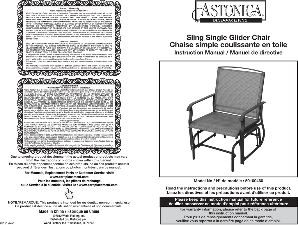 Limited Warranty World Factory, Inc. Products for Home Use World Factory, Inc. (Seller) warrants to the original Buyer only, that each Astonica Product will be free from defects in material and workmanship for a period of one (1) year from date of purchase. SELLER’S SOLE OBLIGATION AND BUYER’S EXCLUSIVE REMEDY UNDER THIS LIMITED WARRANTY SHALL BE THE REPAIR OR REPLACEMENT OF PARTS, WITHOUT CHARGE, WHICH ARE DEFECTIVE IN MATERIAL OR WORKMANSHIP. ANY PARTS AS DETERMINED BY THE SELLER WHICH HAVE BEEN MISUSED; ABUSED OR DAMAGED EITHER DIRECTLY OR INDIRECTLY FROM REPAIRS OR ALTERATIONS ATTEMPTED BY UNAUTHORIZED PERSONS; IMPROPER MAINTENANCE, NEGLECT OR ACCIDENT ARE NOT COVERED BY THIS LIMITED WARRANTY. This warranty does not apply to damage, heat-induced coloration changes, scratching or alteration due to normal use or weathering. To make a claim under this Limited Warranty, you must return the complete product with proof of purchase, transportation prepaid, to any World Factory, Inc. authorized service center. Call 1-888-422-7800 or visit: ezreplacement.com for the location of the nearest authorized service center. Additional Limitations THIS LIMITED WARRANTY DOES NOT APPLY TO ACCESSORY OR CONSUMABLE ITEMS RELATED TO THIS PRODUCT. ALL IMPLIED WARRANTIES SHALL BE LIMITED IN DURATION TO ONE (1) YEAR FROM DATE OF PURCHASE. IN NO EVENT SHALL SELLER BE LIABLE FOR ANY INCIDENTAL OR CONSEQUENTIAL DAMAGES, INCLUDING BUT NOT LIMITED TO LIABILITY FOR LOSS OF PROFITS, ARISING FROM THE SALE OR USE OF THIS PRODUCT. If any provision of this Limited Warranty is for any reason held to be invalid or unenforceable, such provision shall not affect any other provision herein, this Limited Warranty shall be construed as if such invalid and/or unenforceable provision had never been contained herein. This warranty gives you special legal rights, and you may also have other rights which vary from state to state. This Warranty contains the entire agreement between Seller and Buyer and supersedes any and all prior agreements, arrangements, or understandings between the parties relating to product warranty. ® Sling Single Glider Chair Chaise simple coulissante en toile Instruction Manual / Manuel de directive Garantie limitée World Factory, Inc. Produits à utiliser à l'extérieur. World Factory Inc. (Fournisseur) garantit à l'acheteur initial seulement, que chaque produit Astonica est exempt de défaut de matières premières et de vice de fabrication pour une période d'un (1) an à compter de la date d'achat. LA SEULE OBLIGATION DU FOURNISSEUR ET LE RECOURS EXCLUSIF DE L'ACHETEUR EN VERTU DE LA PRÉSENTE GARANTIE LIMITÉE SERONT LA RÉPARATION OU LE REMPLACEMENT DES PIÈCES, SANS FRAIS, DONT LE MATÉRIEL OU LA FABRICATION SONT DÉFECTUEUX. TOUTES LES PIÈCES, QUI DE L'AVIS DU FOURNISSEUR ONT ÉTÉ UTILISÉES À MAUVAIS ESCIENT, MALTRAITÉES OU ENDOMMAGÉES DIRECTEMENT OU INDIRECTEMENT SUITE À DES RÉPARATIONS OU DES MODIFICATIONS TENTÉES PAR DES PERSONNES NON AUTORISÉES, ONT ÉTÉ MAL ENTRETENUES, NÉGLIGÉES OU ONT SUBI UN ACCIDENT, NE SONT PAS COUVERTES PAR CETTE GARANTIE LIMITÉE. Cette garantie ne s'applique pas aux dommages, aux changements de couleur causés par la chaleur, aux rayures ou altérations dues à une utilisation normale ou au vieillissement climatique. Pour faire une réclamation en vertu de cette garantie limitée, vous devez retourner le produit au complet avec la preuve d'achat, frais de transport prépayés, vers l'un des Centres de service agréés de World Factory Inc. Appelez le 1-888-422-7800 ou visitez le site : www.ezreplacement.com pour l'emplacement du Centre de service agréé le plus près de chez vous. Limites supplémentaires CETTE GARANTIE LIMITÉE NE S'APPLIQUE PAS AUX ACCESSOIRES OU AUX CONSOMMABLES RELIÉS À CE PRODUIT. TOUTES LES GARANTIES IMPLICITES SONT LIMITÉES À UNE DURÉE D'UN (1) AN À COMPTER DE LA DATE D'ACHAT. EN AUCUN CAS, LE FOURNISSEUR NE PEUT ÊTRE TENU RESPONSABLE DE DOMMAGES FORTUITS OU CONSÉCUTIFS, Y COMPRIS, MAIS SANS S'Y LIMITER LA RESPONSABILITÉ EN CAS DE PERTE DE BÉNÉFICES DÉCOULANT DE L'UTILISATION OU DE LA VENTE DE CE PRODUIT. Si une des dispositions de cette garantie limitée est pour une raison quelconque jugée invalide ou inapplicable, cette disposition n'affecte pas les autres dispositions et la présente garantie limitée sera interprétée comme si ladite disposition invalide ou inapplicable n'avait jamais été inscrite au présent document. Cette garantie vous donne des droits juridiques spéciaux et vous pouvez également avoir d'autres droits qui varient d'un État ou d'une province à l'autre. Cette garantie contient l'intégralité de l'accord intervenu entre le Fournisseur et l'Acheteur et annule et remplace tous les contrats, accords ou arrangements entre les parties en ce qui a trait à la garantie du produit. Due to ongoing product development the actual product or products may vary from the illustrations or photos shown within this manual. En raison du développement continu de ces produits, ce ou ces produits actuels peuvent différer des illustrations ou photos montrées dans ce manuel. For Manuals, Replacement Parts or Customer Service visit: www.ezreplacement.com Pour les manuels, les pièces de rechange ou le Service à la clientèle, visitez le : www.ezreplacement.com NOTE / REMARQUE : This product is intended for residential, non-commercial use. Ce produit est destiné à une utilisation résidentielle et non commerciale. 201212rev1 Made in China / Fabriqué en Chine ©2012 World Factory, Inc. Distributed by / Distribué par : World Factory, Inc. • Westlake, TX 76262 Model No / N° de modèle : 50100460 Read the instructions and precautions before use of this product. Lisez les directives et les précautions avant d'utiliser ce produit. Please keep this instruction manual for future reference Veuillez conserver ce mode d'emploi pour référence ultérieure For warranty information, please refer to the back pa
