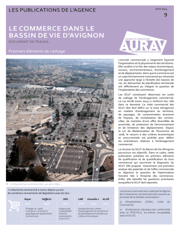les publications de l’AGENCE Avril 2014 9 Le COMMERCE DANS LE BASSIN DE VIE d’AVIGNON Document de travail Premiers éléments de cadrage L’activité commerciale a largement façonné l’organisation et la physionomie des territoires. Elle soulève à la fois des enjeux économiques, sociaux, environnementaux, d’aménagement et de déplacements. Alors que le commerce est un sujet éminemment transversal qui nécessite une approche large à l’échelle des bassins de vie, les démarches de planification territoriale ont difficilement pu intégrer la question de l’implantation des commerces. Les SCoT constituent désormais les outils de cadrage de l’aménagement commercial. La Loi ALUR (mars 2014) a renforcé leur rôle dans ce domaine. Le volet commercial des SCoT doit être défini sur la base d’exigences en matière d’aménagement du territoire, de paysages, de consommation économe de l’espace, de revitalisation des centresvilles, de maintien d’une offre diversifiée de proximité, de protection de l’environnement et de limitation des déplacements. Depuis la Loi de Modernisation de l’Economie de 2008, le recours à des critères économiques et concurrentiels est prohibé pour définir les orientations relatives à l’aménagement commercial. Avignon Nord - nov. 2013 ¡¡ L’urbanisme commercial, 40 ans déjà... L’urbanisme commercial a connu depuis 40 ans de nombreux revirements de législation avec les lois : Royer Raffarin SRU LME 1973 1996 2000 2008 Protéger le « petit commerce » et éviter le gaspillage des équipements commerciaux Exigence de compatibilité entre les autorisations et les SCoT Grenelle 2 ALUR 2010 2014 Substitution des critères d’aménagement du territoire et de développement durable aux critères économiques La révision du SCoT du Bassin de Vie d’Avignon poursuivra ces objectifs. Dans ce cadre, cette publication présente les premiers éléments de qualification et de quantification du tissu commercial qui nourriront le diagnostic du SCoT. Elle propose notamment une première analyse des polarités et de l’offre commerciale et objective la question de l’optimisation foncière liée à l’emprise des commerces. Enfin, elle identifie les questions prioritaires auxquelles le SCoT doit répondre. Les locaux commerciaux visés par le régime de l’urbanisme commercial sont soumis au principe de la double autorisation : 1) d’exploitation Commerce) (CDAC, Code du 2) d’urbanisme classique (en conformité avec le POS-PLU, lui-même compatible avec le SCoT). 60 % des surfaces de vente des grandes et moyennes surfaces CONCENTREES Dans 5 polarites COMMERCIALES MAJEURES L’activité commerciale constitue largement le premier secteur d’activité économique vauclusien (31 381 emplois - source URSSAF). La part du commerce sur le nombre total d’emplois privés (134 000) atteint 23%, soit une sur-représentation de +6,1 et de +4,7 points par rapport aux échelles nationales et régionales. ¡¡ Les pôles commerciaux et les densités démographiques au sein de l’aire urbaine d’Avignon Orange GARD Carpentras En le comparant avec les départements ayant la même proportion d’emplois dans le commerce, on observe que le Vaucluse se situe au même niveau que des départements ayant entre 80 000 et 260 000 habitants de plus : Charente-Maritime, Gard, Loire, Oise... Monteux Sorgues Villeneuve lez Avignon Avignon Cavaillon Châteaurenard - la situation géographique charnière du bassin de vie avignonnais, carrefour d’un espace rhodanien méditerranéen fortement intégré dans un processus de métropolisation ; - l’apport non négligeable des touristes dans les chiffres d’affaires des commerces qui varient de 7 à 11% selon les territoires vauclusiens. VAUCLUSE L’Isle sur la Sorgue Ce constat qui avait déjà été effectué lors de l’élaboration du Schéma de développement commercial en 2004 doit être mis en perspective au regard de : - la zone de chalandise d’Avignon Nord (estimée à plus de 800 000 habitants en 2004) qui dépasse largement le département ; Pernes Le Pontet BOUCHESDU-RHONE Surfaces de ventes de GMS (en m2) Nombre d’établissements liés à des activités de commerces et de services avec une surface < 300 m2 Densité de population (habitants/km2) 2393 143 446 2 181 199 86 24 053 12 450 57 637 63 31 4 Source : BD Sirène 2012 LSA 2013 Aurav Le COMMERCE, UN POIDS PREPONDERANT DANS l’ECONOMIE VAUCLUSIENNE ¡¡ Les 10 plus grands établissements commerciaux de l’aire urbaine d’Avignon 1. Auchan Avignon Nord (Le Pontet / 6. Alinéa Avignon Nord (Le Pontet) : 9 000 Sorgues) : 17 900 m2 m2 2. Ikéa Avignon Nord (Vedène): 17 340 m2 7. Castorama La cristole (Avignon): 8 700 m2 3. Leroy merlin Avignon Nord (Le Pontet) : 8. Carrefour Courtine (Avignon) : 8 500 m2 15 000 m2 9. Carrefour Coudoulet (Orange): 8 500 m2 4. Auchan - Mistral 7 (Avignon) : 10 890 m2 10. Truffaut (Sorgues) : 8 000 m2 5. Botanic - (Villeneuve les A.) : 9 800 m2 LE COMMERCE DANS LE BASSIN DE VIE D’AVIGNON • AURAV | 3 Plus précisément, 60 % des GMS sont rassemblées dans cinq polarités disposant chacune d’une surface de vente supérieure à 20 000 m2, toutes situées dans le SCoT BVA : - Avignon Nord : St Tronquet, Ikéa-Bul d’air, La Tour blanche (Le Pontet-Sorgues-Vedène) ; ¡¡ Les principales polarités commerciales de l’aire urbaine d’Avignon au regard de la surface de vente en m2 de GMS en 2013* Avignon Nord - Cap Sud - Cabrière - St Ruf (Avignon) ; - Grand Angles (Les Angles). Cap Sud - Cabrière - St Ruf 25 328 Les Angles 24 053 Centre ville de Cavaillon & périphéries proches 16 544 L’Isle-sur-la-Sorgue 15 568 Botanic + Hauts de Villeneuve d'Avignon 15 299 Intra-muros-remparts 13 444 Zone d'activites Carpentras-sud 13 329 Cavaillon - Les Banquets - Vautes 13 184 Chateaurenard 12 450 La groseillère - Caseneuve - D942 10 790 Champfleury-Montclar-Courtine 10 000 Orange ouest 9 886 Orange nord 7 
