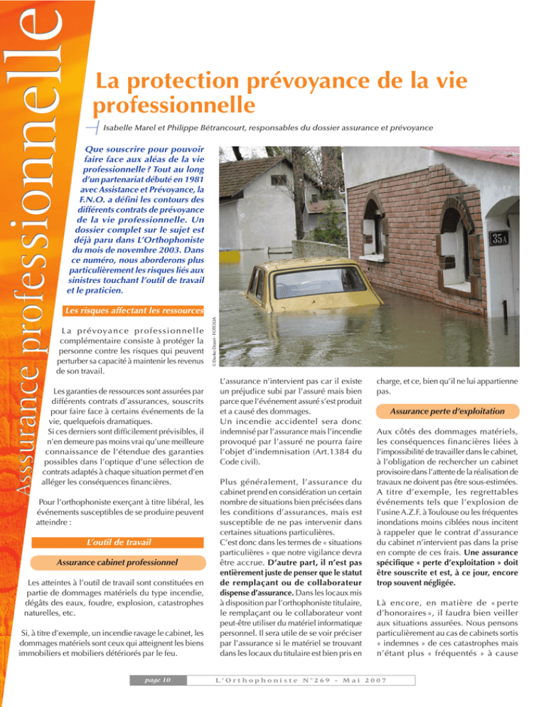 3HWYV[LJ[PVUWYt]V`HUJLKLSH]PL WYVMLZZPVUULSSL Isabelle Marel et Philippe Bétrancourt, responsables du dossier assurance et prévoyance Que souscrire pour pouvoir faire face aux aléas de la vie professionnelle ? Tout au long d’un partenariat débuté en 1981 avec Assistance et Prévoyance, la F.N.O. a défini les contours des différents contrats de prévoyance de la vie professionnelle. Un dossier complet sur le sujet est déjà paru dans L’Orthophoniste du mois de novembre 2003. Dans ce numéro, nous aborderons plus particulièrement les risques liés aux sinistres touchant l’outil de travail et le praticien. 3 H W Y t ]V`H U J L W Y V M L Z Z P V U U L S S L JVTWStTLU[HPYLJVUZPZ[LnWYV[tNLYSH WLYZVUULJVU[YLSLZYPZX\LZX\PWL\]LU[ WLY[\YILYZHJHWHJP[tnTHPU[LUPYSLZYL]LU\Z KLZVU[YH]HPS 3LZNHYHU[PLZKLYLZZV\YJLZZVU[HZZ\YtLZWHY KPMMtYLU[ZJVU[YH[ZK»HZZ\YHUJLZZV\ZJYP[Z WV\YMHPYLMHJLnJLY[HPUZt]tULTLU[ZKLSH ]PLX\LSX\LMVPZKYHTH[PX\LZ :PJLZKLYUPLYZZVU[KPMÄJPSLTLU[WYt]PZPISLZPS U»LUKLTL\YLWHZTVPUZ]YHPX\»\ULTLPSSL\YL JVUUHPZZHUJLKLS»t[LUK\LKLZNHYHU[PLZ WVZZPISLZKHUZS»VW[PX\LK»\ULZtSLJ[PVUKL JVU[YH[ZHKHW[tZnJOHX\LZP[\H[PVUWLYTL[K»LU HSStNLYSLZJVUZtX\LUJLZÄUHUJPuYLZ 7V\YS»VY[OVWOVUPZ[LL_LYsHU[n[P[YLSPItYHSSLZ t]tULTLU[ZZ\ZJLW[PISLZKLZLWYVK\PYLWL\]LU[ H[[LPUKYL! L’outil de travail (ZZ\YHUJLJHIPUL[WYVMLZZPVUULS 3LZH[[LPU[LZnS»V\[PSKL[YH]HPSZVU[JVUZ[P[\tLZLU WHY[PLKLKVTTHNLZTH[tYPLSZK\[`WLPUJLUKPL KtNo[ZKLZLH\_MV\KYLL_WSVZPVUJH[HZ[YVWOLZ UH[\YLSSLZL[J :Pn[P[YLK»L_LTWSL\UPUJLUKPLYH]HNLSLJHIPUL[SLZ KVTTHNLZTH[tYPLSZZVU[JL\_X\PH[[LPNULU[SLZIPLUZ PTTVIPSPLYZL[TVIPSPLYZKt[tYPVYtZWHYSLML\ page 10 © Darko Dozet - FOTOLIA Les risques affectant les ressources 3»HZZ\YHUJLU»PU[LY]PLU[WHZJHYPSL_PZ[L \UWYtQ\KPJLZ\IPWHYS»HZZ\YtTHPZIPLU WHYJLX\LS»t]tULTLU[HZZ\YtZ»LZ[WYVK\P[ L[HJH\ZtKLZKVTTHNLZ <U PUJLUKPL HJJPKLU[LS ZLYH KVUJ PUKLTUPZtWHYS»HZZ\YHUJLTHPZS»PUJLUKPL WYV]VX\tWHYS»HZZ\YtULWV\YYHMHPYL S»VIQL[K»PUKLTUPZH[PVU(Y[K\ *VKLJP]PS 7S\Z NtUtYHSLTLU[ S»HZZ\YHUJL K\ JHIPUL[WYLUKLUJVUZPKtYH[PVU\UJLY[HPU UVTIYLKLZP[\H[PVUZIPLUWYtJPZtLZKHUZ SLZJVUKP[PVUZK»HZZ\YHUJLZTHPZLZ[ Z\ZJLW[PISLKLULWHZPU[LY]LUPYKHUZ JLY[HPULZZP[\H[PVUZWHY[PJ\SPuYLZ *»LZ[KVUJKHUZSLZ[LYTLZKLZP[\H[PVUZ WHY[PJ\SPuYLZ®X\LUV[YL]PNPSHUJLKL]YH v[YLHJJY\L+»H\[YLWHY[PSU»LZ[WHZ LU[PuYLTLU[Q\Z[LKLWLUZLYX\LSLZ[H[\[ KLYLTWSHsHU[V\KLJVSSHIVYH[L\Y KPZWLUZLK»HZZ\YHUJL+HUZSLZSVJH\_TPZ nKPZWVZP[PVUWHYS»VY[OVWOVUPZ[L[P[\SHPYL SLYLTWSHsHU[V\SLJVSSHIVYH[L\Y]VU[ WL\[v[YL\[PSPZLYK\TH[tYPLSPUMVYTH[PX\L WLYZVUULS0SZLYH\[PSLKLZL]VPYWYtJPZLY WHYS»HZZ\YHUJLZPSLTH[tYPLSZL[YV\]HU[ KHUZSLZSVJH\_K\[P[\SHPYLLZ[IPLUWYPZLU JOHYNLL[JLIPLUX\»PSULS\PHWWHY[PLUUL WHZ (ZZ\YHUJLWLY[LK»L_WSVP[H[PVU (\_J[tZKLZKVTTHNLZTH[tYPLSZ SLZJVUZtX\LUJLZMPUHUJPuYLZSPtLZn S»PTWVZZPIPSP[tKL[YH]HPSSLYKHUZSLJHIPUL[ nS»VISPNH[PVUKLYLJOLYJOLY\UJHIPUL[ WYV]PZVPYLKHUZS»H[[LU[LKLSHYtHSPZH[PVUKL [YH]H\_ULKVP]LU[WHZv[YLZV\ZLZ[PTtLZ ( [P[YL K»L_LTWSL SLZ YLNYL[[HISLZ t]tULTLU[Z[LSZX\LS»L_WSVZPVUKL S»\ZPUL(A-n;V\SV\ZLV\SLZMYtX\LU[LZ PUVUKH[PVUZTVPUZJPIStLZUV\ZPUJP[LU[ nYHWWLSLYX\LSLJVU[YH[K»HZZ\YHUJL K\JHIPUL[U»PU[LY]PLU[WHZKHUZSHWYPZL LUJVTW[LKLJLZMYHPZ<ULHZZ\YHUJL ZWtJPÄX\LWLY[LK»L_WSVP[H[PVU®KVP[ v[YLZV\ZJYP[LL[LZ[nJLQV\YLUJVYL [YVWZV\]LU[UtNSPNtL 3n LUJVYL LU TH[PuYL KL WLY[L K»OVUVYHPYLZ®PSMH\KYHIPLU]LPSSLY H\_ZP[\H[PVUZHZZ\YtLZ5V\ZWLUZVUZ WHY[PJ\SPuYLTLU[H\JHZKLJHIPUL[ZZVY[PZ PUKLTULZ®KLJLZJH[HZ[YVWOLZTHPZ U»t[HU[WS\ZMYtX\LU[tZ®nJH\ZL L’Orthophoniste N°269 - Mai 2007 7HYJLX\LJLSHU»HYYP]LWHZX\»H\_H\[YLZ PSJVU]PLU[K»LU]PZHNLYSLZJVUZtX\LUJLZ WLYZVUULSSLZL[WYVMLZZPVUULSSLZSPtLZn\UL THSHKPLV\n\UHJJPKLU[:PS»PUJHWHJP[tZL WYVSVUNLS»PU]HSPKP[tWL\[]V\ZPU[LYKPYLKL YLWYLUKYL[V\[LHJ[P]P[tWYVMLZZPVUULSSLV\ ]V\ZVISPNLYnJOHUNLYKLWYVMLZZPVU :PSH*HYWPTRVWYt]VP[KtQnKLZNHYHU[PLZ VISPNH[VPYLZSLTVU[HU[KLJLZNHYHU[PLZ L[SHMYHUJOPZLPTWVY[HU[L QV\YZWV\Y S»PUKLTUP[tQV\YUHSPuYLYLUKUtJLZZHPYLSL YLJV\YZnSHWYt]V`HUJL]VSVU[HPYL® *VTWStTLU[HPYLWYt]V`HUJL 3LZNHYHU[PLZOHIP[\LSSLZKLIHZLZVU[H\ UVTIYLKL[YVPZ! NHYHU[PLKtJuZ NHYHU[PLPUKLTUP[tZQV\YUHSPuYLZ NHYHU[PLPU]HSPKP[t 0SHYYP]L[YuZMYtX\LTTLU[X\LJLZ[YVPZ NHYHU[PLZZVPLU[SPtLZ\ULPUKLTUP[t QV\YUHSPuYLPTWVY[HU[LLU[YHzUL\ULNHYHU[PL KtJuZPTWVY[HU[L +»H\[YLZNHYHU[PLZWL\]LU[[V\[LMVPZZ»HQV\[LY L_LTWSLK\JHWP[HSPU]HSPKP[t 7V\YKt[LYTPULYSLZNHYHU[PLZnZV\ZJYPYLPSLZ[ PTWVY[HU[X\LJOHJ\UW\PZZLKYLZZLY\UWYVÄS JVYYLZWVUKHU[nZHWYVWYLZP[\H[PVU! 3LWS\ZK\ZP[L ^^^VY[OVWOVUPZ[LZMY 3HY\IYPX\L¸:LY]PJLZ(ZZPZ[HUJL L[7Yt]V`HUJL¹ 0SZLYHKVUJQ\KPJPL\_KL[YV\]LY\U YtNPTLK»HZZ\YHUJLKLWYt]V`HUJLKVU[ SHNHYHU[PLK»PU]HSPKP[tLZ[KtÄUPLWHY YHWWVY[nS»L_LYJPJLWYVMLZZPVUULSKL S»VY[OVWOVUPZ[L +»H\[YLZWVPU[ZULKVP]LU[WHZv[YLtJHY[tZ! +LZPUKLTUP[tZWHY[PLSSLZZLYVU[LSSLZ ]LYZtLZSVYZK»\ULHJ[P]P[tWYVMLZZPVUULSSL KPTPU\tL& 3»HYYv[KL[YH]HPSUVYTHS®JVUZtJ\[PM n\ULTH[LYUP[tV\]YL[PSKYVP[nKLZ PUKLTUP[tZ& ,_PZ[L[PSKLZYPZX\LZKLYtZPSPH[PVU& L’Orthophoniste N°269 - Mai 2007 e (\KLSnKLS»V\[PSKL[YH]HPSJVTTLTV`LU KLZ\IZPZ[HUJLSHMHJ\S[tKLNHNULYZH ]PL®YLZ[L[YuZJVUKP[PVUUtLWHYS»t[H[KL ZHU[tK\WYH[PJPLUS\PTvTL 7HYHSSuSLTLU[nS»PU[tYv[WVY[tZ\YSH MYHUJOPZLLUJHZK»HYYv[KL[YH]HPS[LTWVYHPYL PUKLTUP[tZQV\YUHSPuYLZPSJVU]PLUKYH K»HJJVYKLY\ULH[[LU[PVU[V\[LWHY[PJ\SPuYL Z\YSL]YHPWYVISuTLX\PZLWVZLH]LJ S»PU]HSPKP[t®<ULJVUM\ZPVUZ\IZPZ[LLU LMML[LU[YLJHWHJP[tnL_LYJLY\ULHJ[P]P[t YtT\UtYH[YPJL®L[S»L_LYJPJLKLS»HJ[P]P[t WYVMLZZPVUULSSLWYtJPZLKLS»HZZ\Yt 0SPTWVY[LKVUJKLZH]VPYJLX\LS»VYNHUPZTL K»HZZ\YHUJLLU[LUKHZZ\YLY 3HYtWVUZLZL[YV\]L[V\QV\YZKHUZSLZ JVUKP[PVUZtJYP[LZKLS»HZZ\YHUJL+YVP[ JVTT\U®PU]HSPKP[tMVUJ[PVUULSSL® IHYuTLJYVPZt®IHYuTLJVU[YHJ[\LS KLZ[H\_K»PU]HSPKP[t®¯ZVU[KLZ[LYTLZ KLZ[PUtZnWYtJPZLYSLZJVUKP[PVUZKLWYPZL LUJOHYNLKLS»VYNHUPZTLK»HZZ\YHUJLL[ ZPNUPÄLU[JSHPYLTLU[X\LSLZPUKLTUP[tZ WYt]\LZLUJHZK»PU]HSPKP[tULZLYVU[WHZ ]LYZtLZZPS»VY[OVWOVUPZ[LX\PULWL\[ WS\ZL_LYJLYZVUHJ[P]P[tWYVMLZZPVUULSSL WYtJPZLZL[YV\]LUtHUTVPUZKHUZ\Ut[H[ WO`ZPX\LS\PWLYTL[[HU[K»L_LYJLY\UL H\[YLHJ[P]P[t 4HJV[PZH[PVUWL\[LSSLH\NTLU[LYLUMVUJ[PVUKLZ HYYv[ZKL[YH]HPSKtJSHYtZ& 8\LSZZVU[SLZKtSHPZK»H[[LU[LH]HU[KLWV\]VPY WLYJL