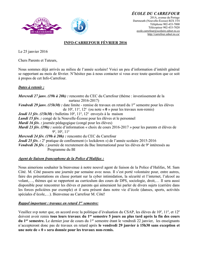ÉCOLE DU CARREFOUR 201A, avenue du Portage Dartmouth (Nouvelle-Écosse) B2X 3T4 Téléphone 902-433-7000 Télécopieur 902-433-7020 [email protected] http://carrefour.ednet.ns.ca/ INFO-CARREFOUR FÉVRIER 2016 Le 25 janvier 2016 Chers Parents et Tuteurs, Nous sommes déjà arrivés au milieu de l’année scolaire! Voici un peu d’information d’intérêt général se rapportant au mois de février. N’hésitez pas à nous contacter si vous avez toute question que ce soit à propos de cet Info-Carrefour. Dates à retenir : Mercredi 27 janv. (19h à 20h) : rencontre du CEC du Carrefour (thème : investissement de la surtaxe 2016-2017) Vendredi 29 janv. (15h30) : date limite - remise de travaux en retard du 1er semestre pour les élèves de 10e, 11e, 12e (ou note « 0 » pour les travaux non-remis) Jeudi 11 fév. (15h30) : bulletins 10e, 11e, 12e envoyés à la maison Lundi 15 fév. : congé de la Nouvelle-Écosse pour les élèves et le personnel Mardi 16 fév. : journée pédagogique (congé pour les élèves) Mardi 23 fév. (19h) : soirée d’information « choix de cours 2016-2017 » pour les parents et élèves de 9e, 10e, 11e Mercredi 24 fév. (19h à 20h) : rencontre du CEC du Carrefour Jeudi 25 fév. : 2e pratique de confinement (« lockdown ») de l’année scolaire 2015-2016 Vendredi 26 fév. : journée de recrutement du Bac International pour les élèves de 9e intéressés au Programme du BI Agent de liaison francophone de la Police d’Halifax : Nous aimerions souhaiter la bienvenue à notre nouvel agent de liaison de la Police d’Halifax, M. Sam Côté. M. Côté passera une journée par semaine avec nous. Il s’est porté volontaire pour, entre autres, faire des présentations en classe portant sur la cyber intimidation, la sécurité et l’internet, l’alcool au volant,…, thèmes qui se rapportent au curriculum des cours de DPS, sociologie, droit,… Il sera aussi disponible pour rencontrer les élèves et parents qui aimeraient lui parler de divers sujets (carrière dans les forces policières par exemple) et il sera présent dans notre vie d’école (danses, sports, activités spéciales d’école,…). Bienvenue au Carrefour M. Côté! Rappel important : travaux en retard 1er semestre: Veuillez svp noter que, en accord avec la politique d’évaluation du CSAP, les élèves de 10e, 11e, et 12e doivent avoir remis tous leurs travaux du 1er semestre 5 jours au plus tard après la fin des cours du 1er semestre. Le dernier jour de cours du 1er semestre étant le vendredi 22 janvier, les enseignants n’accepteront donc pas de travaux en retard après le vendredi 29 janvier à 15h30 sans exception et une note de « 0 » sera donnée pour les travaux non-remis. ÉCOLE DU CARREFOUR 201A, avenue du Portage Dartmouth (Nouvelle-Écosse) B2X 3T4 Téléphone 902-433-7000 Télécopieur 902-433-7020 [email protected] http://carrefour.ednet.ns.ca/ Semaine d’examens et d’évaluations de fin de semestre : Nous tenons à souhaiter bonne chance aux élèves de 10e, 11e, et 12e qui seront en semaine d’examens du 25 au 28 janvier! Mme Titus-Maillet sera disponible pendant ces jours pour distribuer pommes, jus, barres tendres, fromage, céréales, craquelins,… gratuitement dans l’entrée de l’école à l’arrivée de tous les élèves du Carrefour en cette semaine très occupée. Deuxième pratique de confinement (« lockdown ») de l’année le 25 février… : Notre 2e pratique de confinement de l’année, sous la supervision de la police d’Halifax, aura lieu le jeudi 25 février à une heure qui ne sera pas annoncée à l’avance pour créer un certain effet de surprise dans l’école. Il n’y aura aucun accès au bâtiment du Carrefour durant cette pratique, soit à l’école, au centre communautaire, au centre emploi, et à la garderie du Petit Voilier pendant une période d’environ une heure. Cette pratique, si elle se déroule très bien, sera la dernière de l’année scolaire 2015-2016. Nous tenons à remercier les élèves à l’avance pour leur aide et leur patience durant cette activité de sécurité préventive. Rencontre de choix de cours le 23 février à 19h : Tous les élèves présentement en 9e, 10e, et 11e et leurs parents et tuteurs sont invités à une rencontre d’information qui prendra place le mardi 23 février à 19h dans l’amphithéâtre du Carrefour. Nous ferons un survol des cours qui seront offerts l’an prochain durant cette rencontre et Mme Titus-Maillet, notre conseillère en orientation, vous parlera du système de crédits pour les élèves qui seront en 10 e, 11e et 12e l’an prochain. Journée de recrutement du Baccalauréat International : Notre journée de recrutement, pour les élèves de 9e année intéressés à faire partie du programme du Baccalauréat International en commençant avec le Pré BI en septembre 2016, aura lieu le vendredi 26 février. Veuillez svp noter que la participation volontaire de votre enfant à cette journée de recrutement au Carrefour ne l’obligera pas à faire partie du programme en septembre. L’École du Carrefour continue à connaître beaucoup de succès avec son programme du BI en battant, année après année, le taux de réussite du diplôme du BI en 12e année d’environ 10% en comparaison avec la moyenne mondiale du BI. Vous trouverez, joint à cet Info-Carrefour, un pamphlet de promotion du programme du BI préparé par l’École du Carrefour. Nous vous invitons svp à contacter M. Matt Boudreau, coordonnateur du BI, au 433-7000 si vous voulez en savoir davantage à propos du programme. M. Boudreau sera présent durant la soirée de choix de cours du 23 février pour répondre à vos questions et vous partager plus d’information à propos du programme du BI. ÉCOLE DU CARREFOUR 201A, avenue du Portage Dartmouth (Nouvelle-Écosse) B2X 3T4 Téléphone 902-433-7000 Télécopieur 902-433-7020 [email protected] http://carrefour.ednet.ns.ca/ Rappel frais de finissants